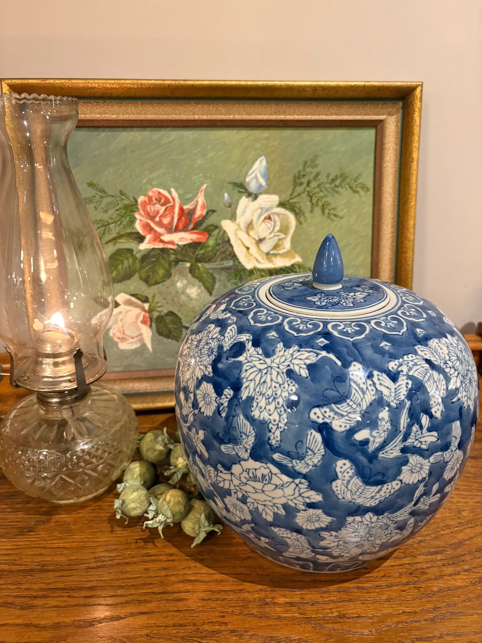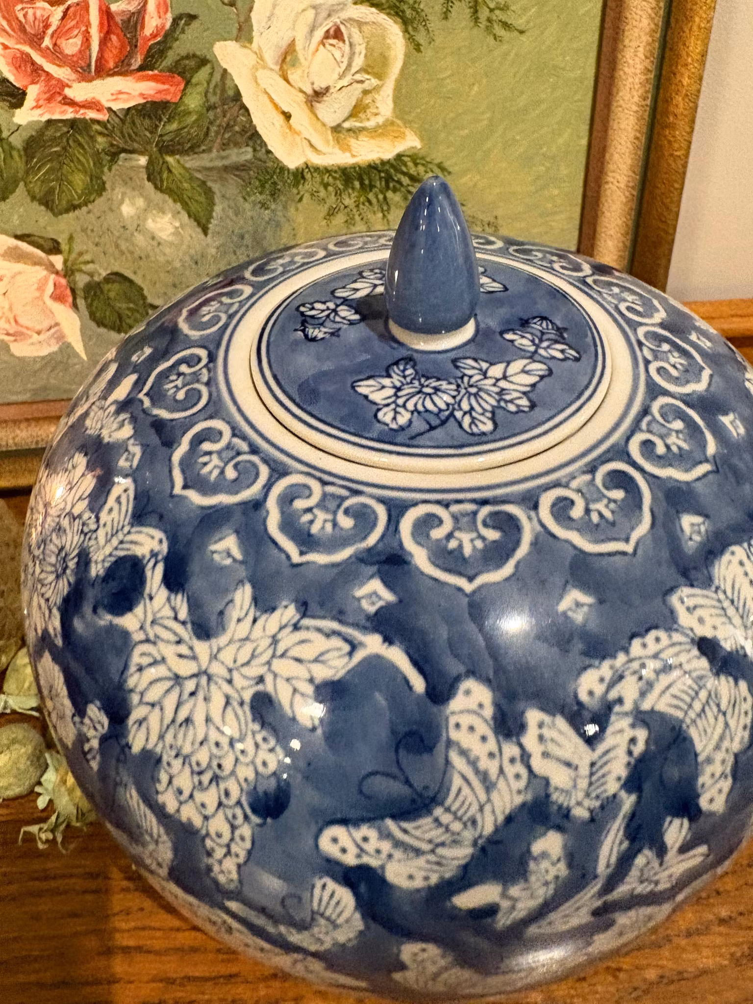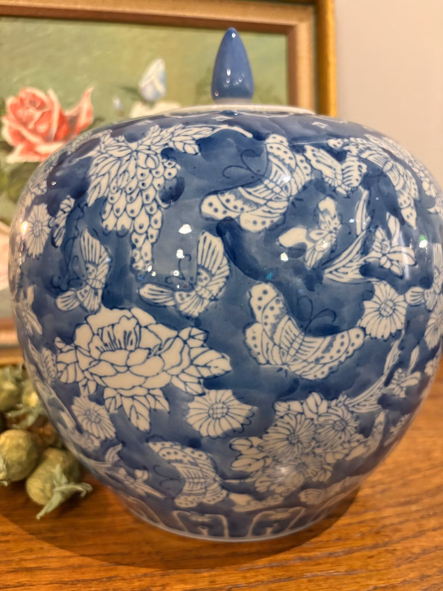 En vacker lockurna i klassiskt blåvitt porslin från Kina. Dekorerad med traditionella motiv och tillverkad med gediget hantverk, är denna urna ett tidlöst inslag i både moderna och klassiska inredningar.