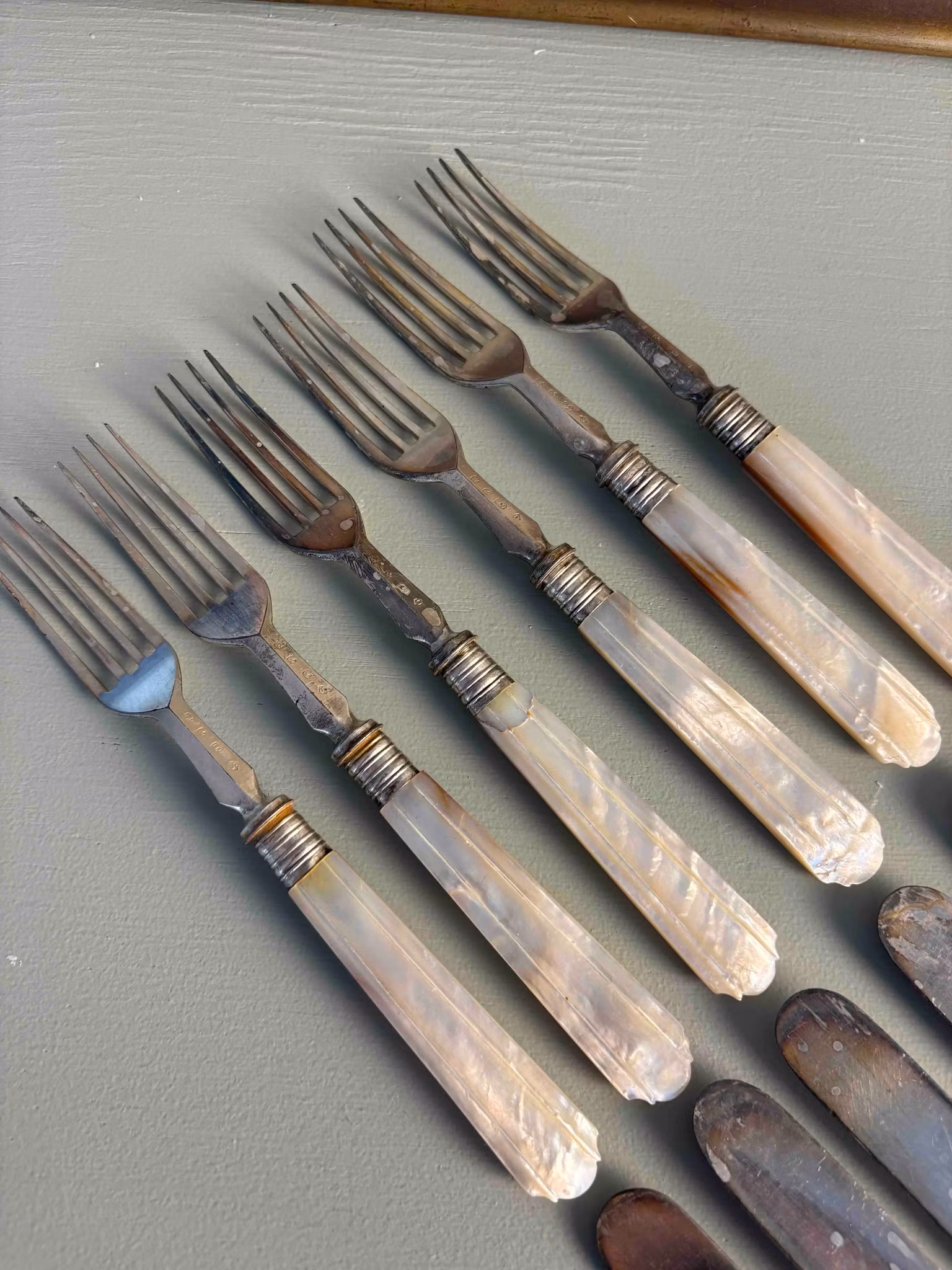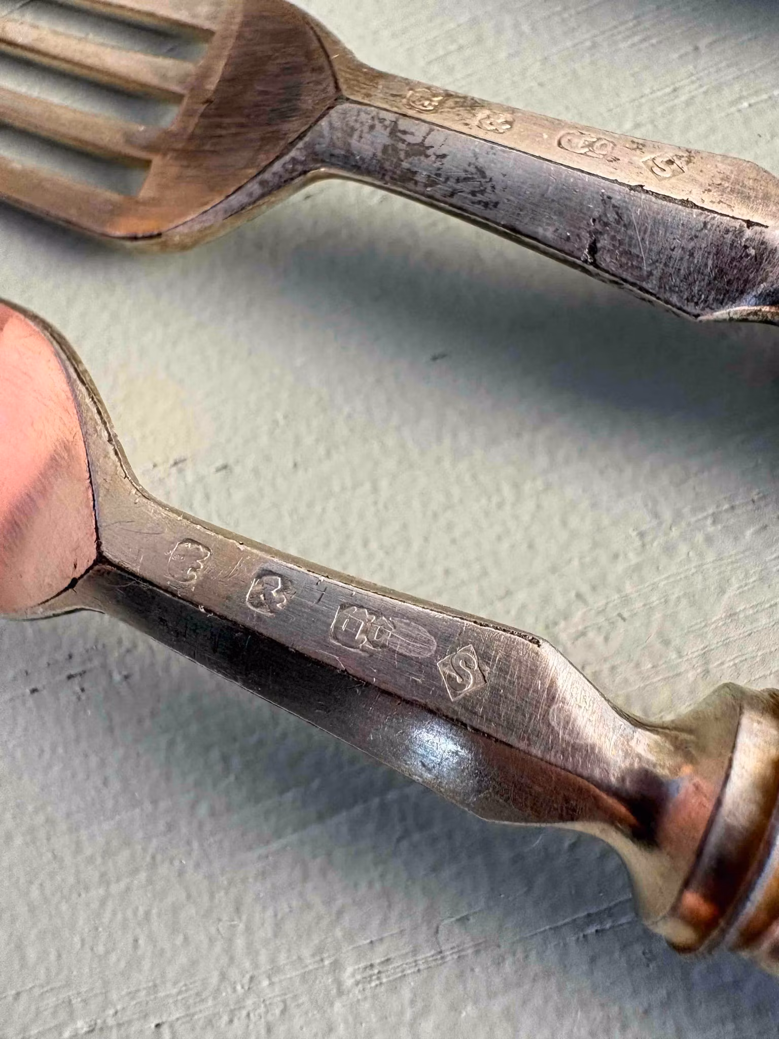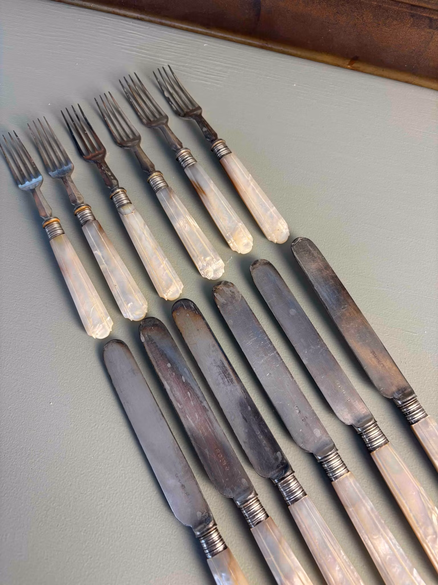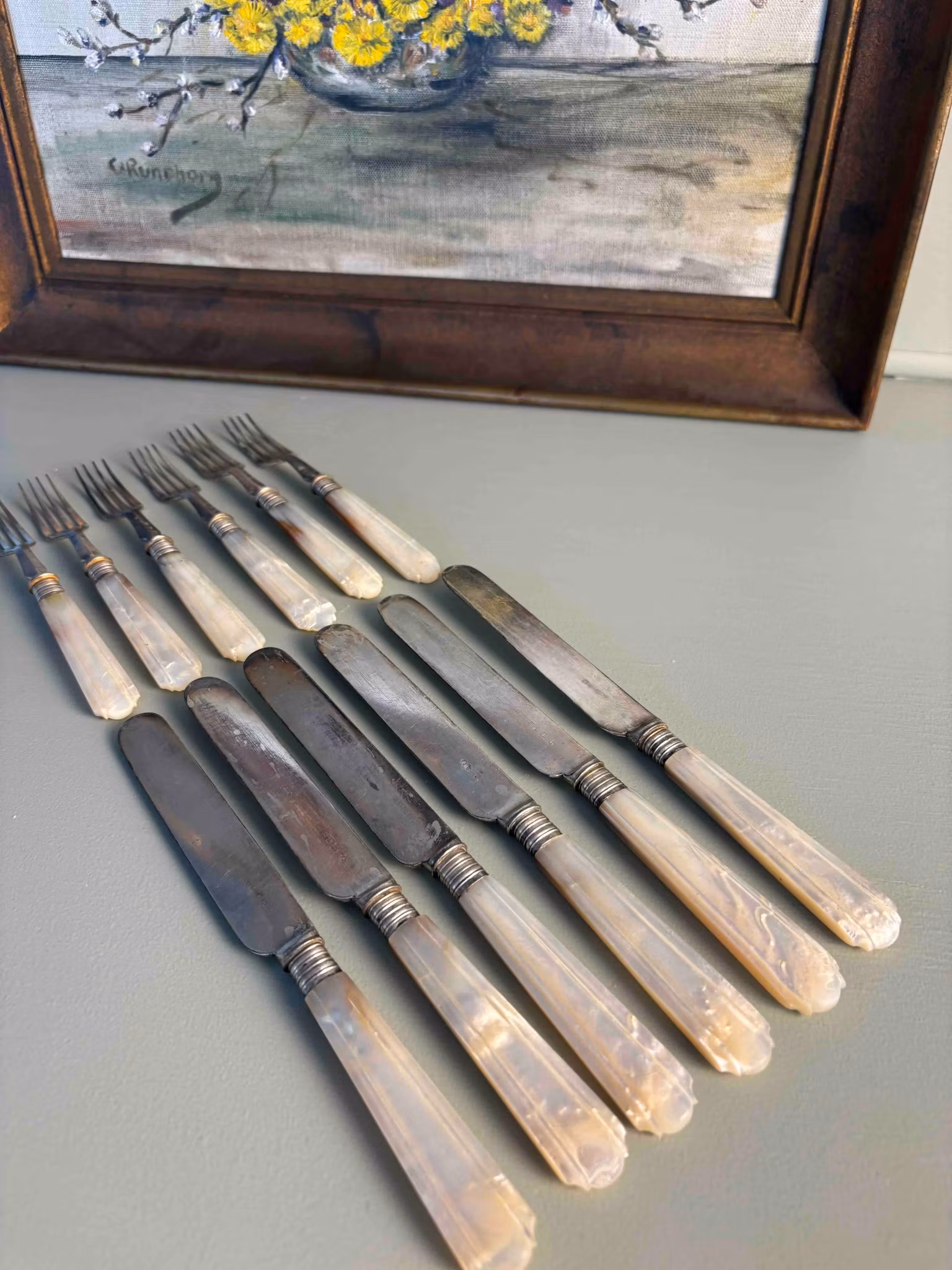 Ett bestickset med tidlös karaktär, som bär spår av användning och historia.