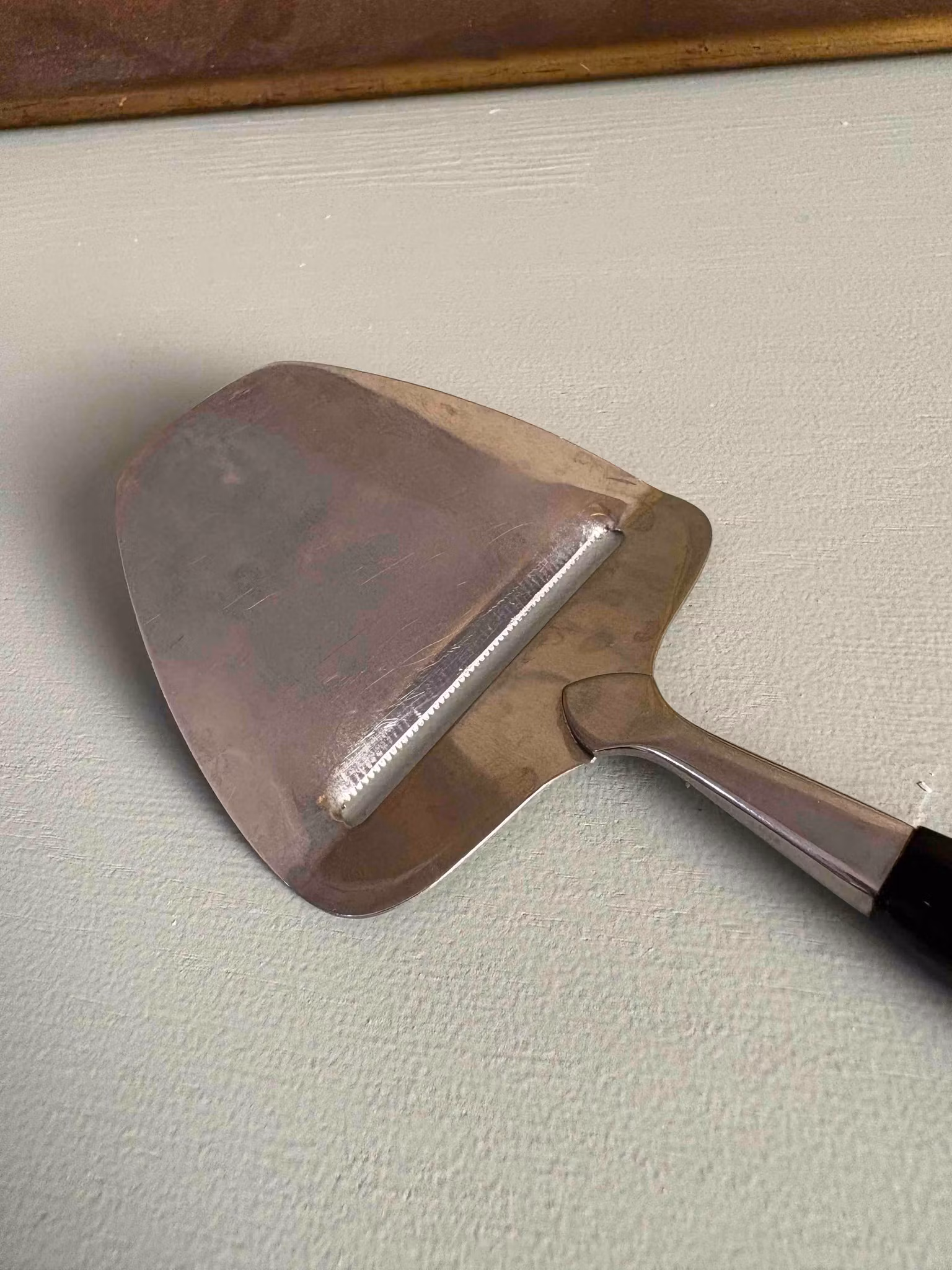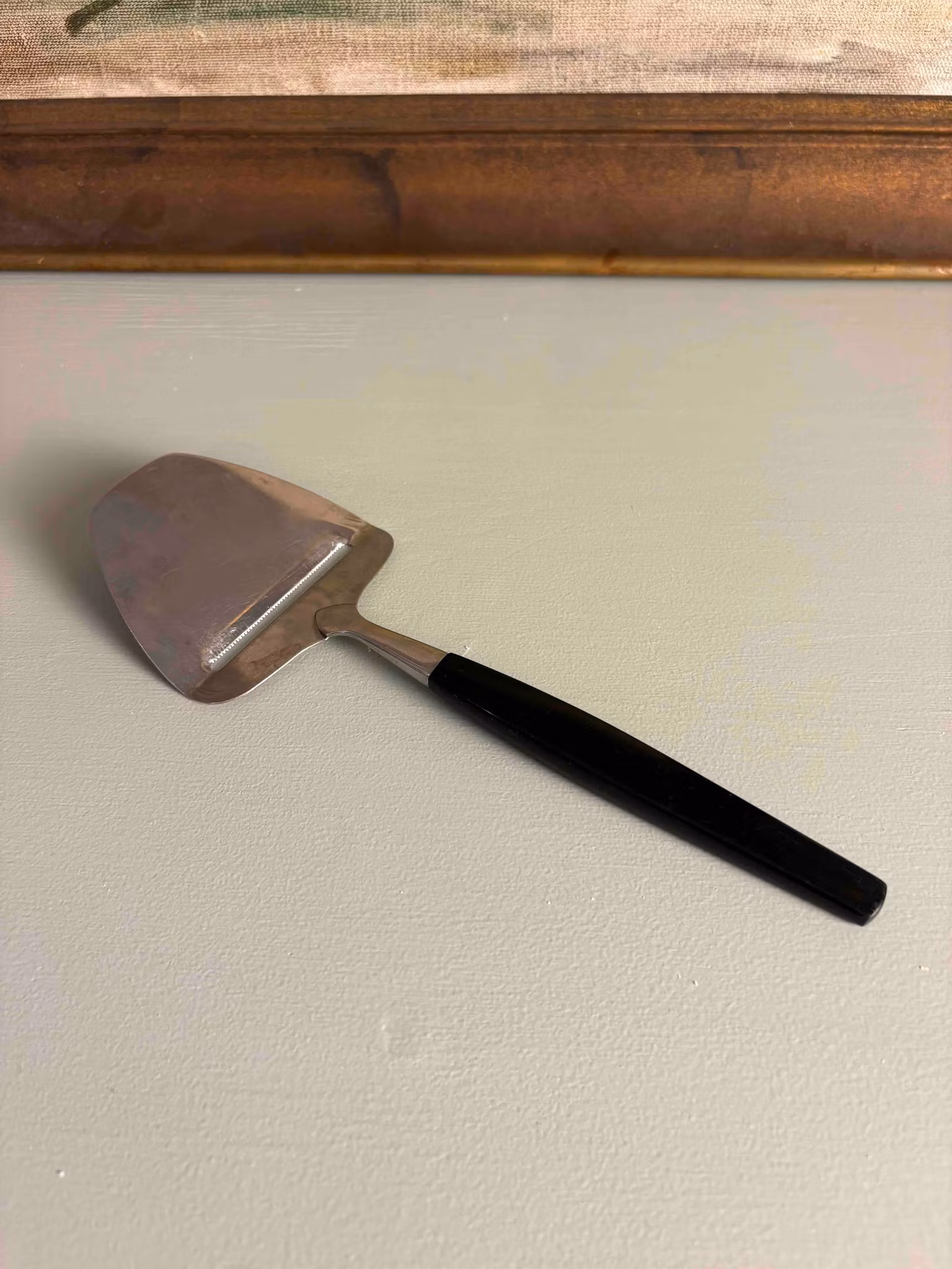 En osthyvel med en självklar tyngd i handen och en form som har fått leva vidare genom tiden. Handtaget i svart bakelit ger en fin kontrast till det blanka stålet och för tankarna till kök där vardagen får ta plats i lugn takt.