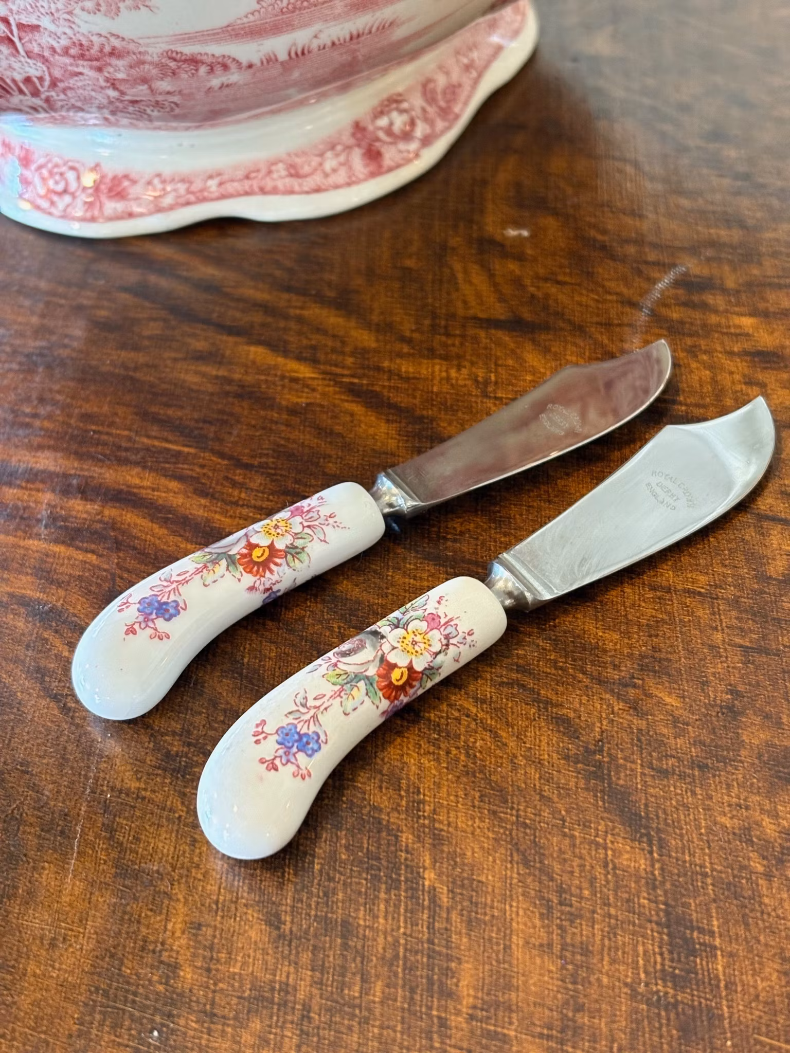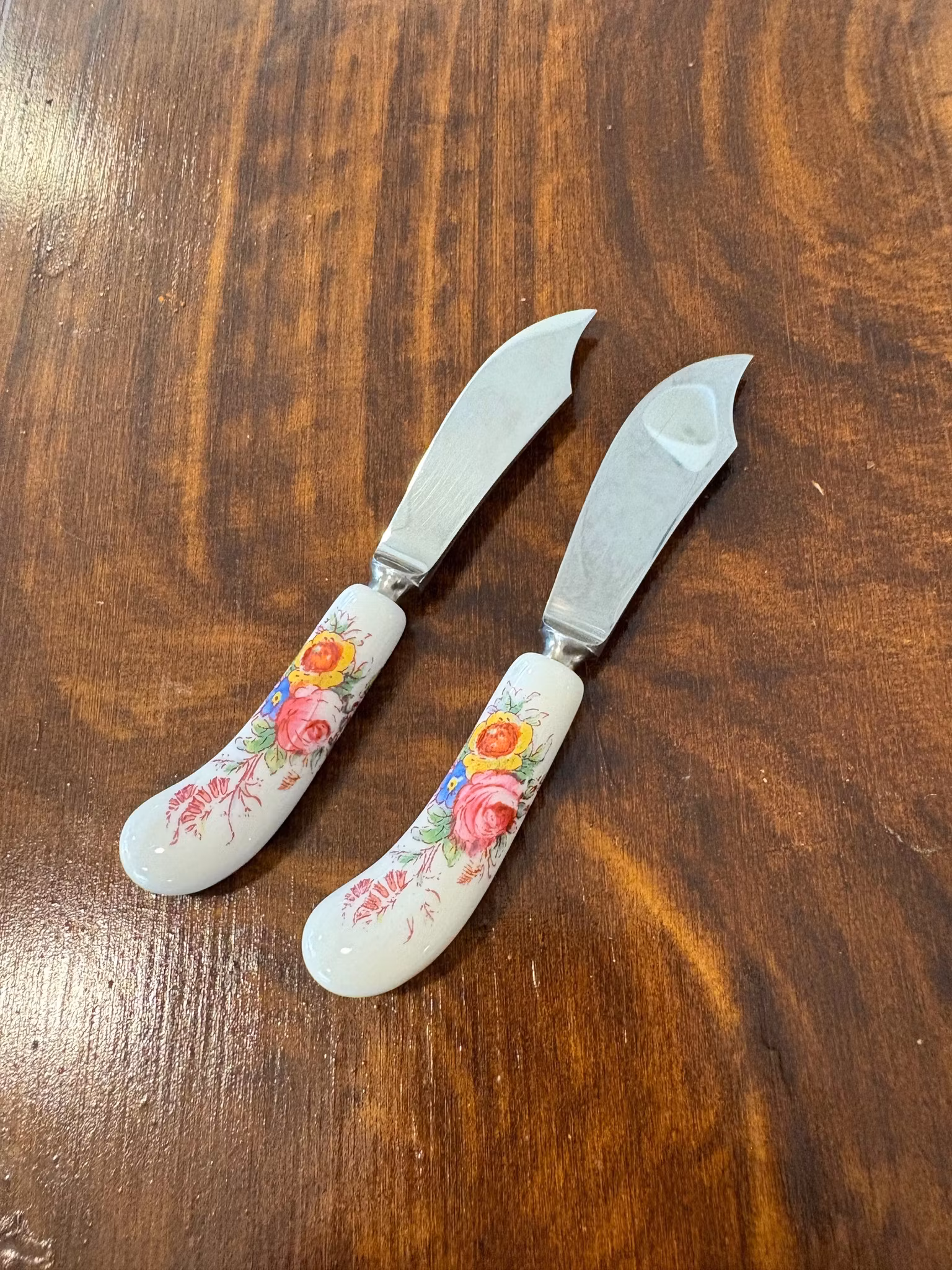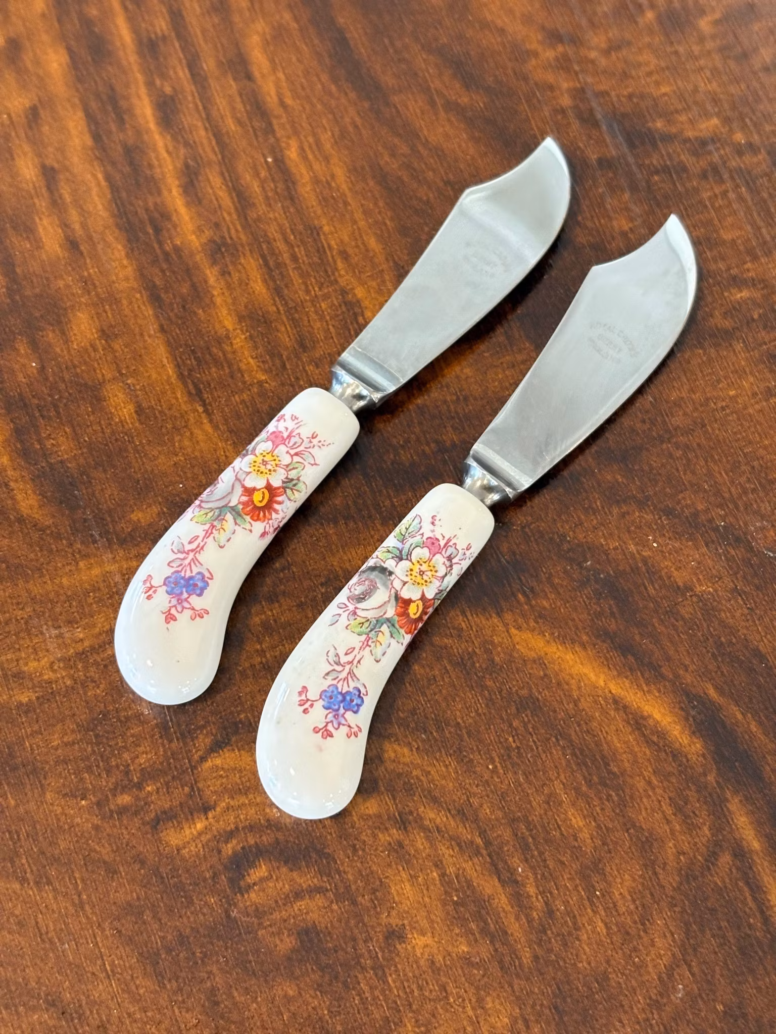 Förhöj ostbrickans elegans med dessa två vackra ostknivar från välrenommerade Royal Crown Derby, England. Varje kniv har ett handtag i porslin, dekorerat med detaljerade blommor som ger en tidlös och romantisk känsla.