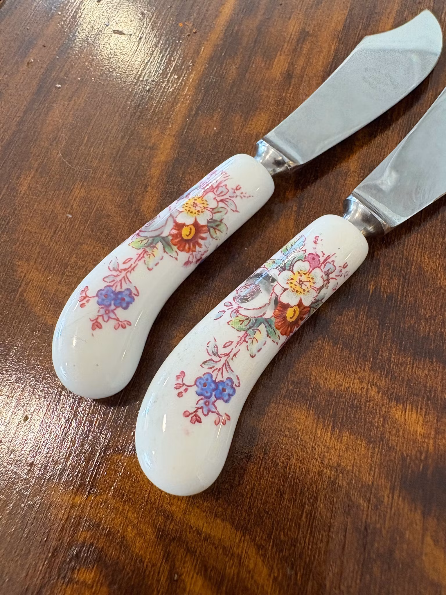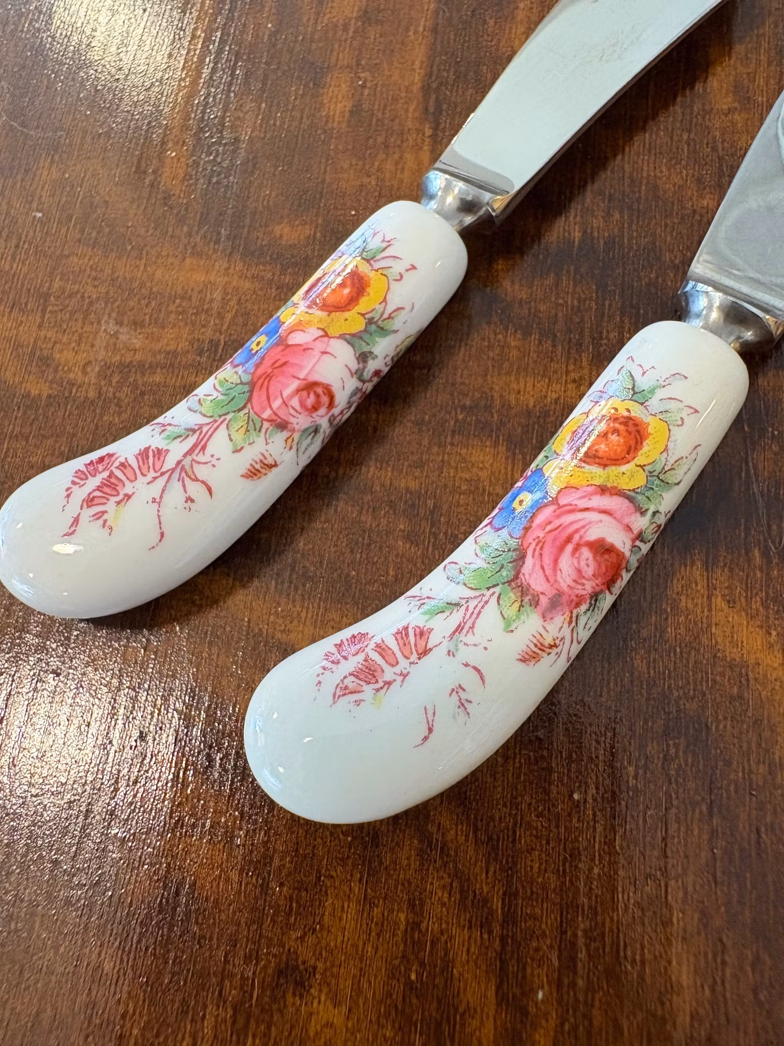 Knivarnas högkvalitativa blad gör dem perfekta för att skära och servera olika typer av ostar, från mjuka brieostar till hårdare cheddar. Kombinationen av brittiskt hantverk och vacker porslinsdesign gör dem lika dekorativa som funktionella – en idealisk gåva till ostälskaren eller samlaren av exklusiva köksdetaljer.