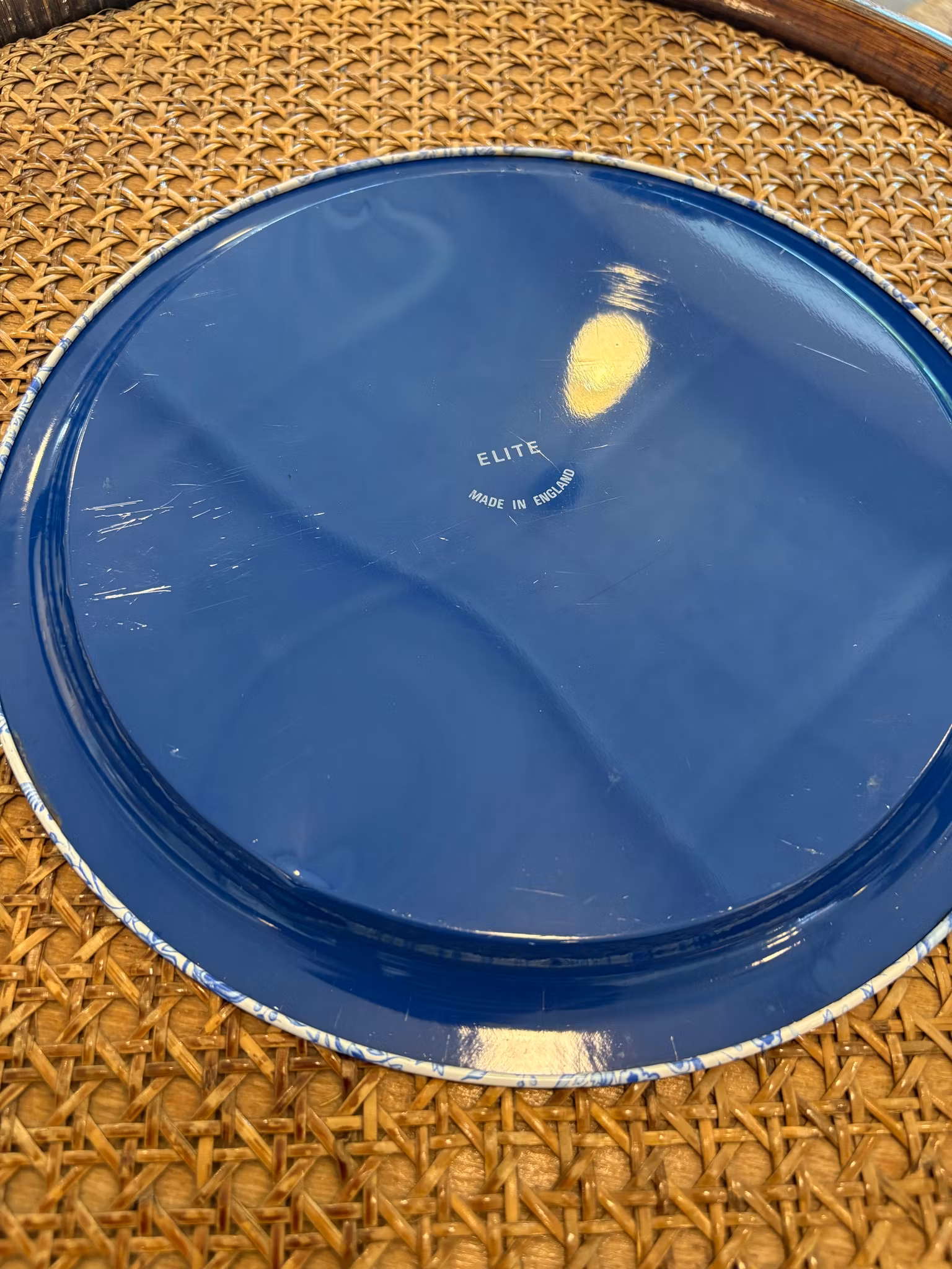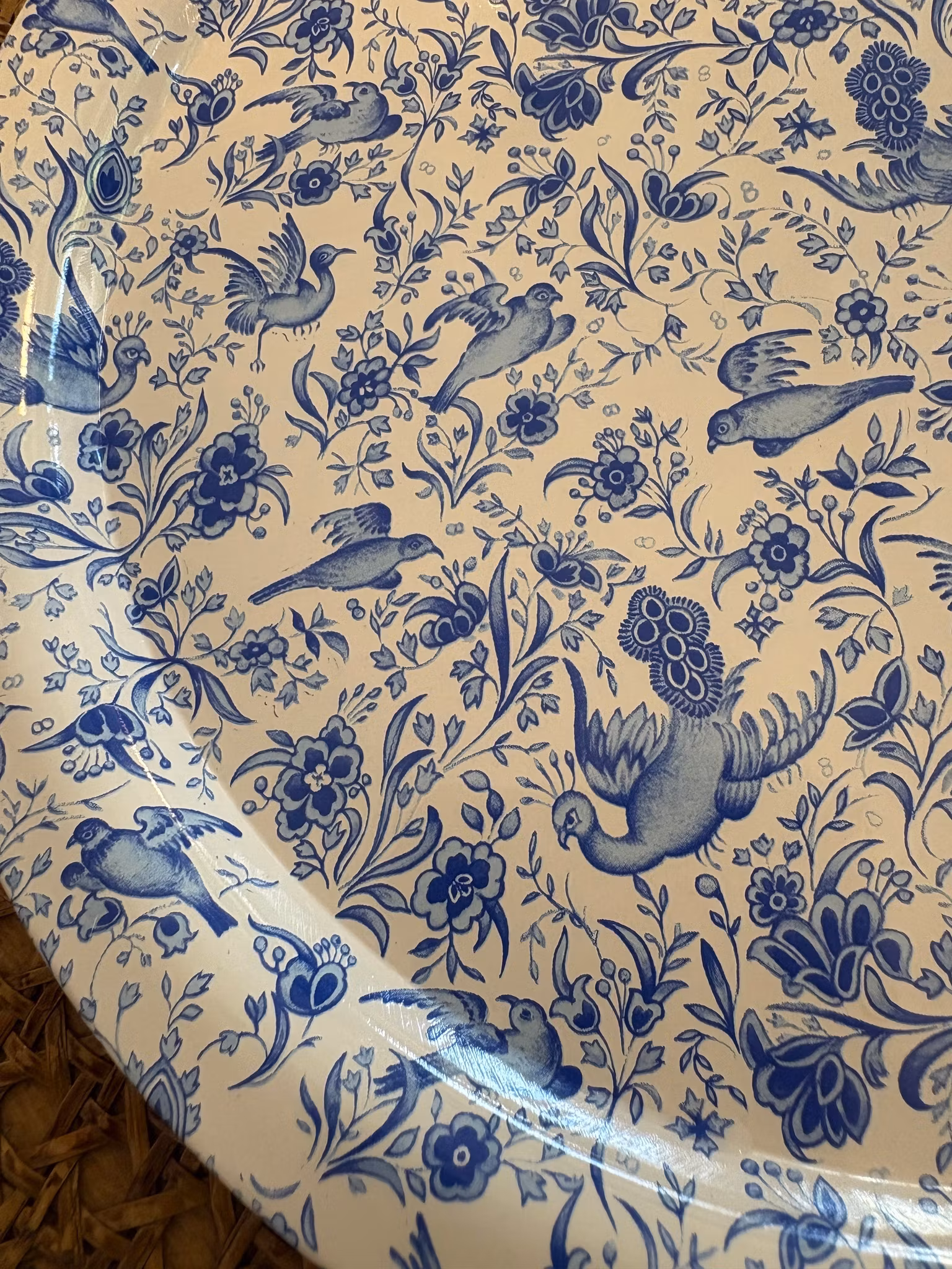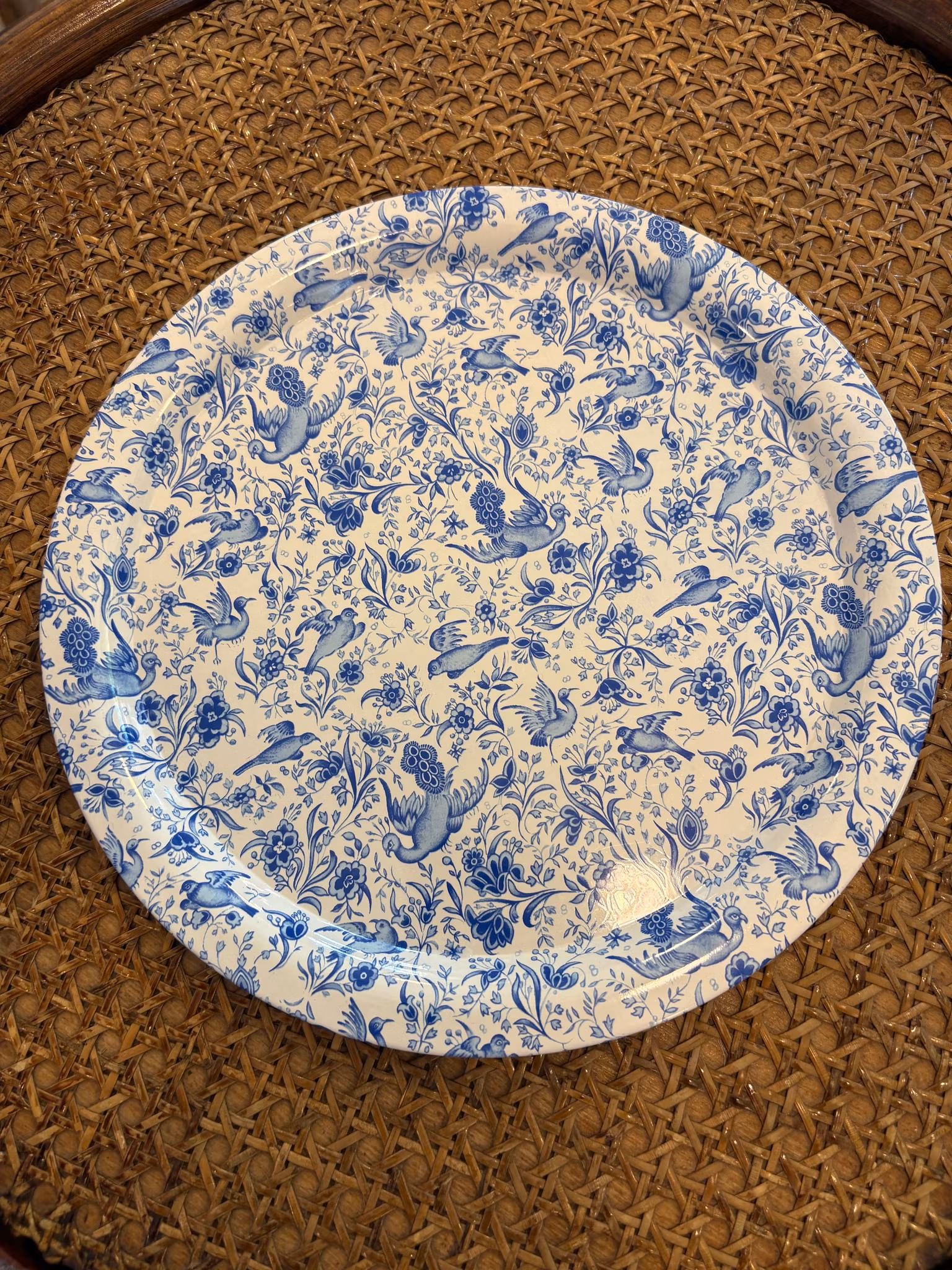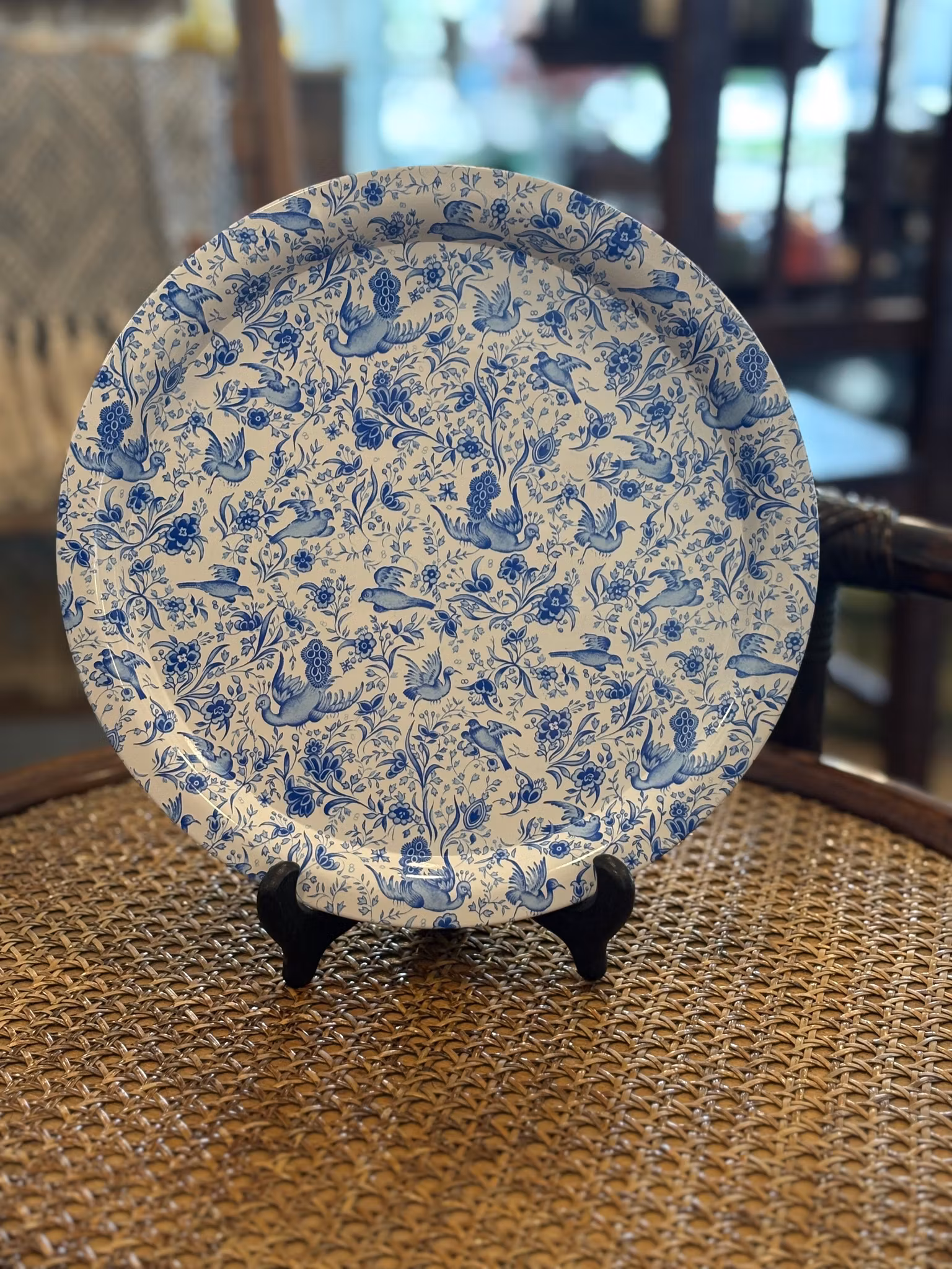 Söt rund plåtbricka i blått & vitt mönster m. fåglar - Made in England