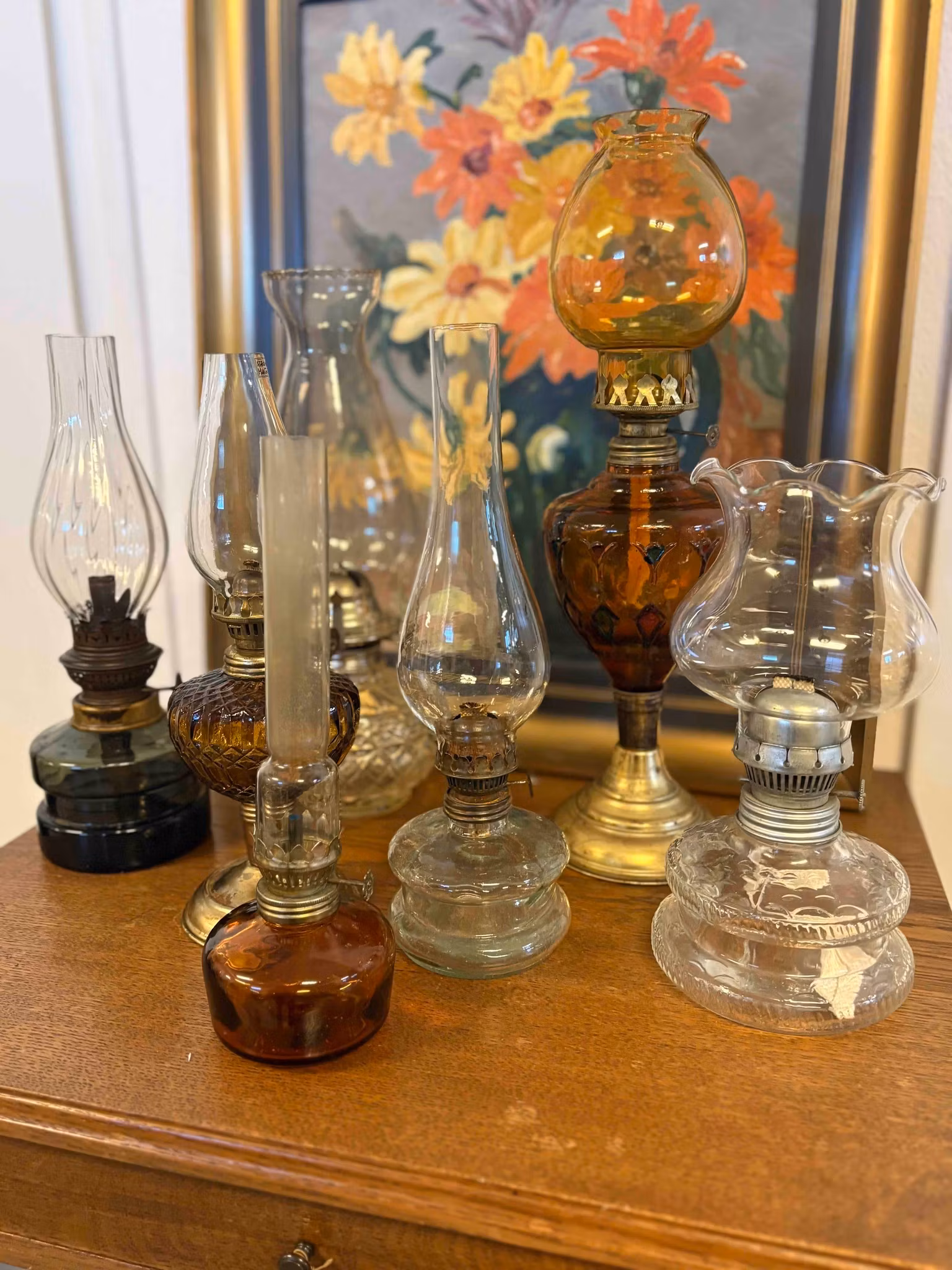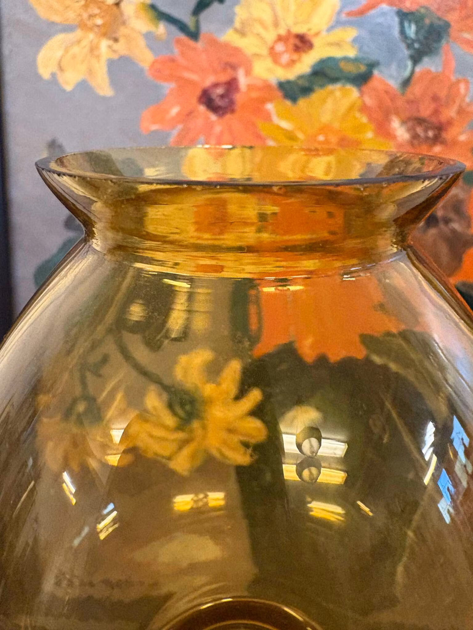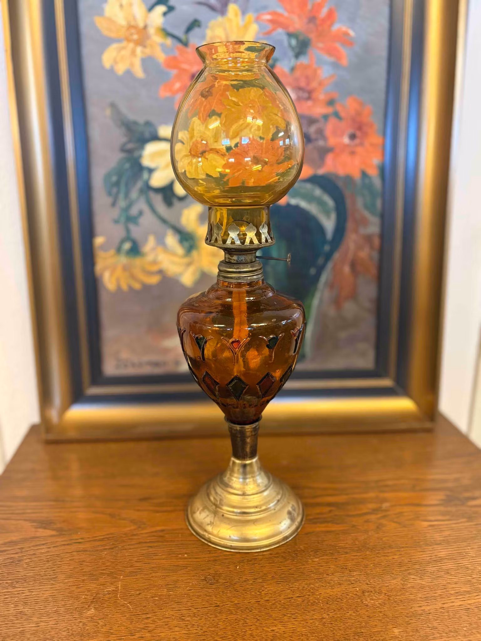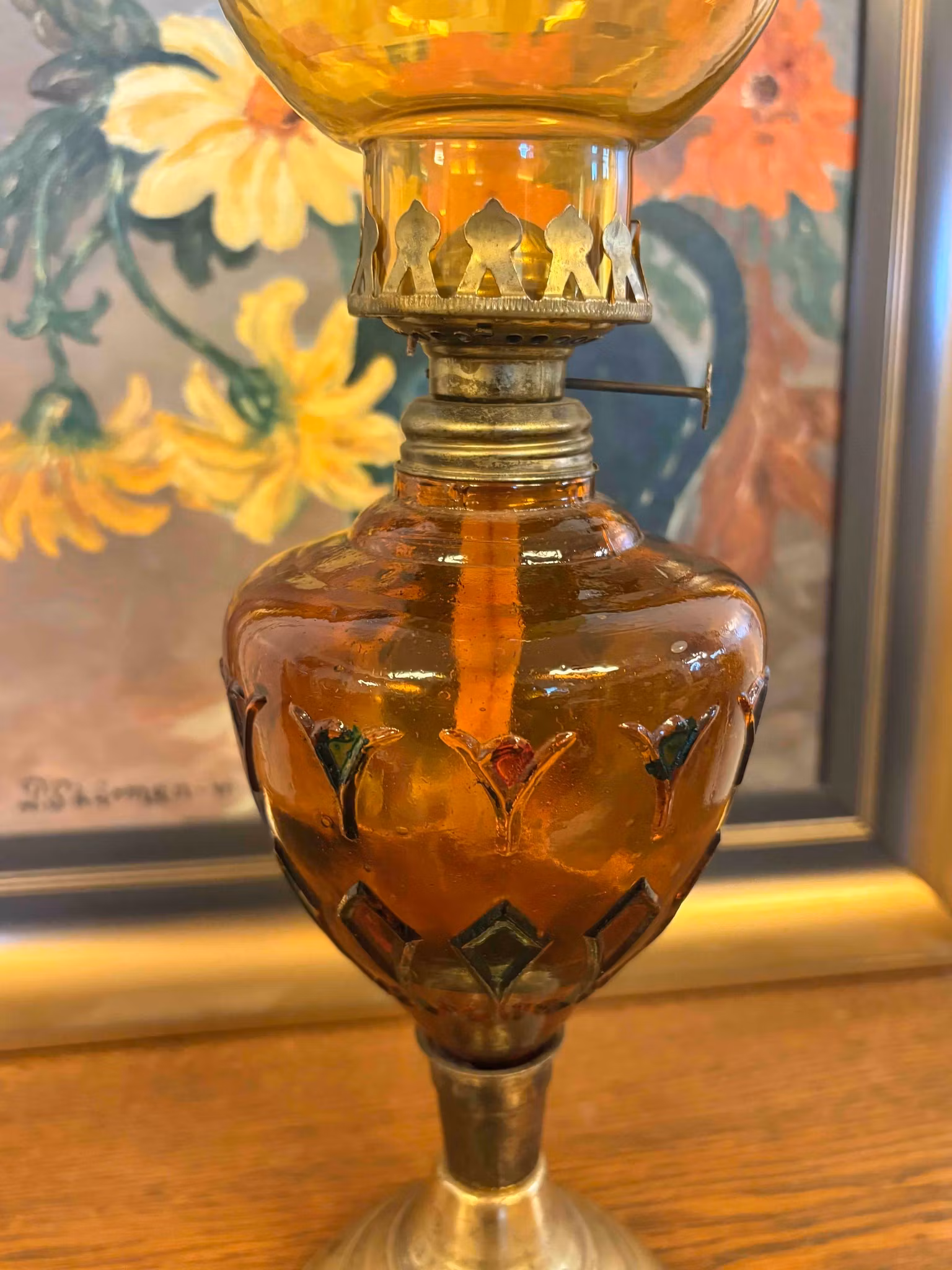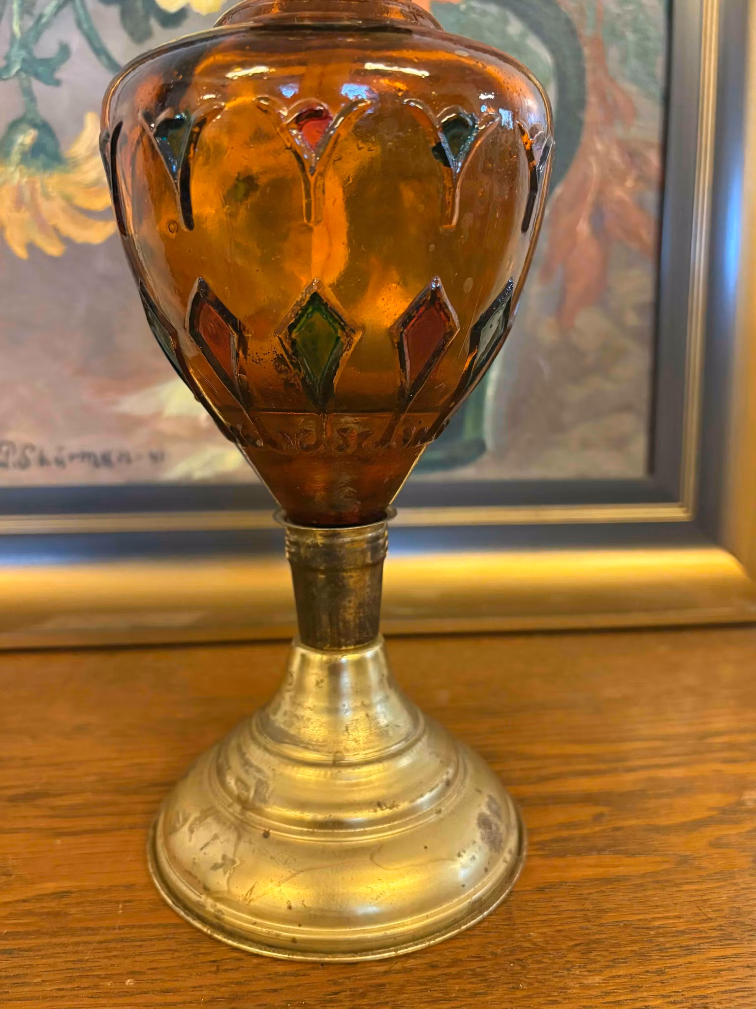 Vacker äldre oljelampa - Bärnstensfärgad m. röda & gröna detaljer