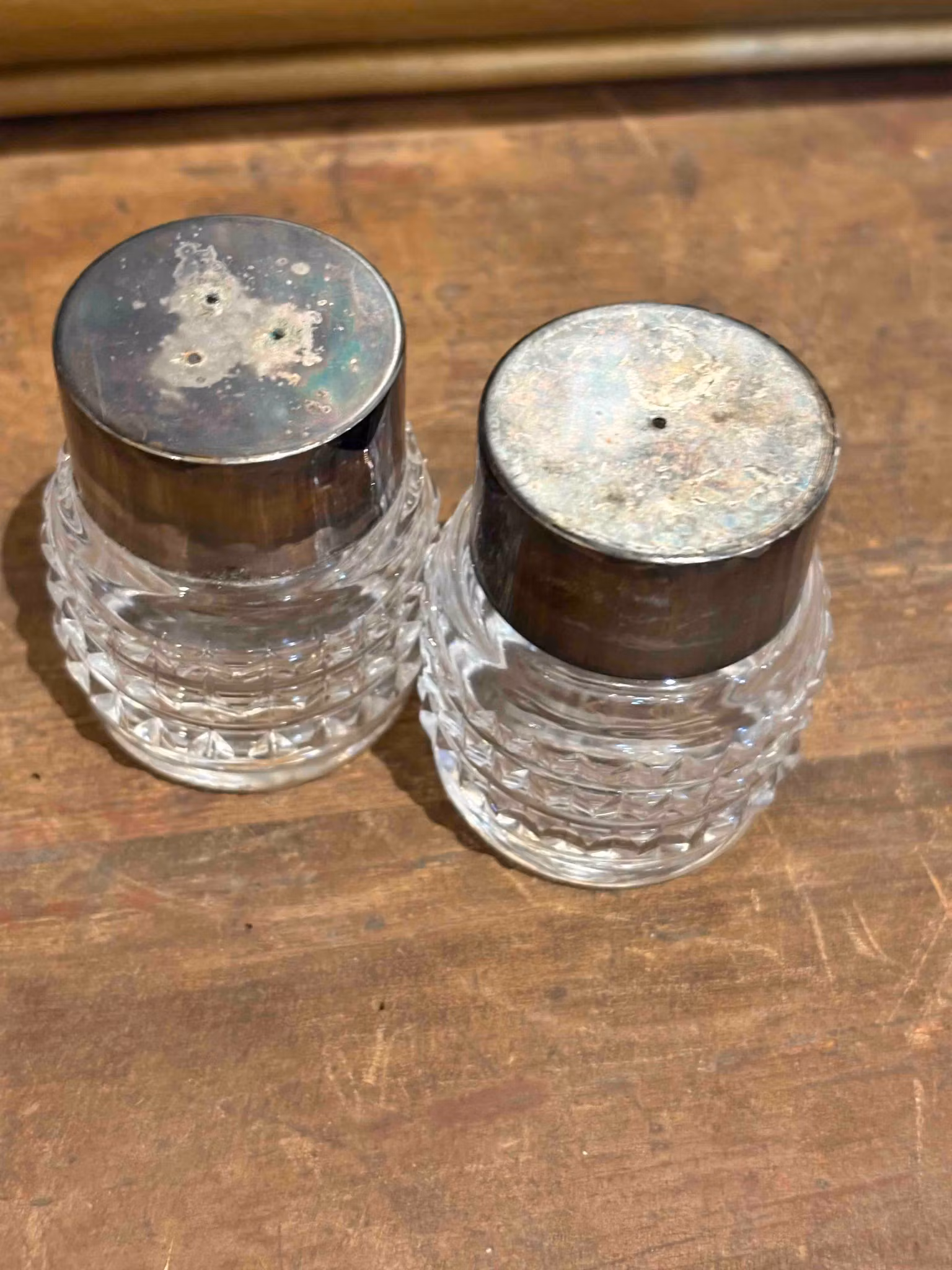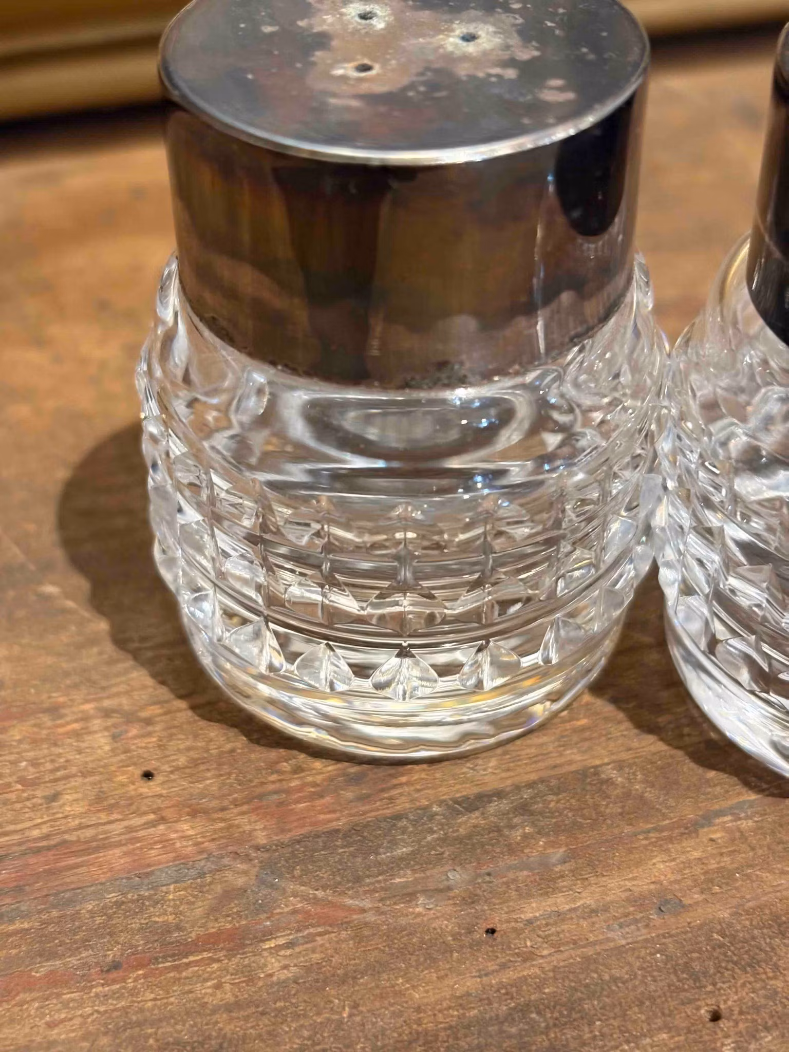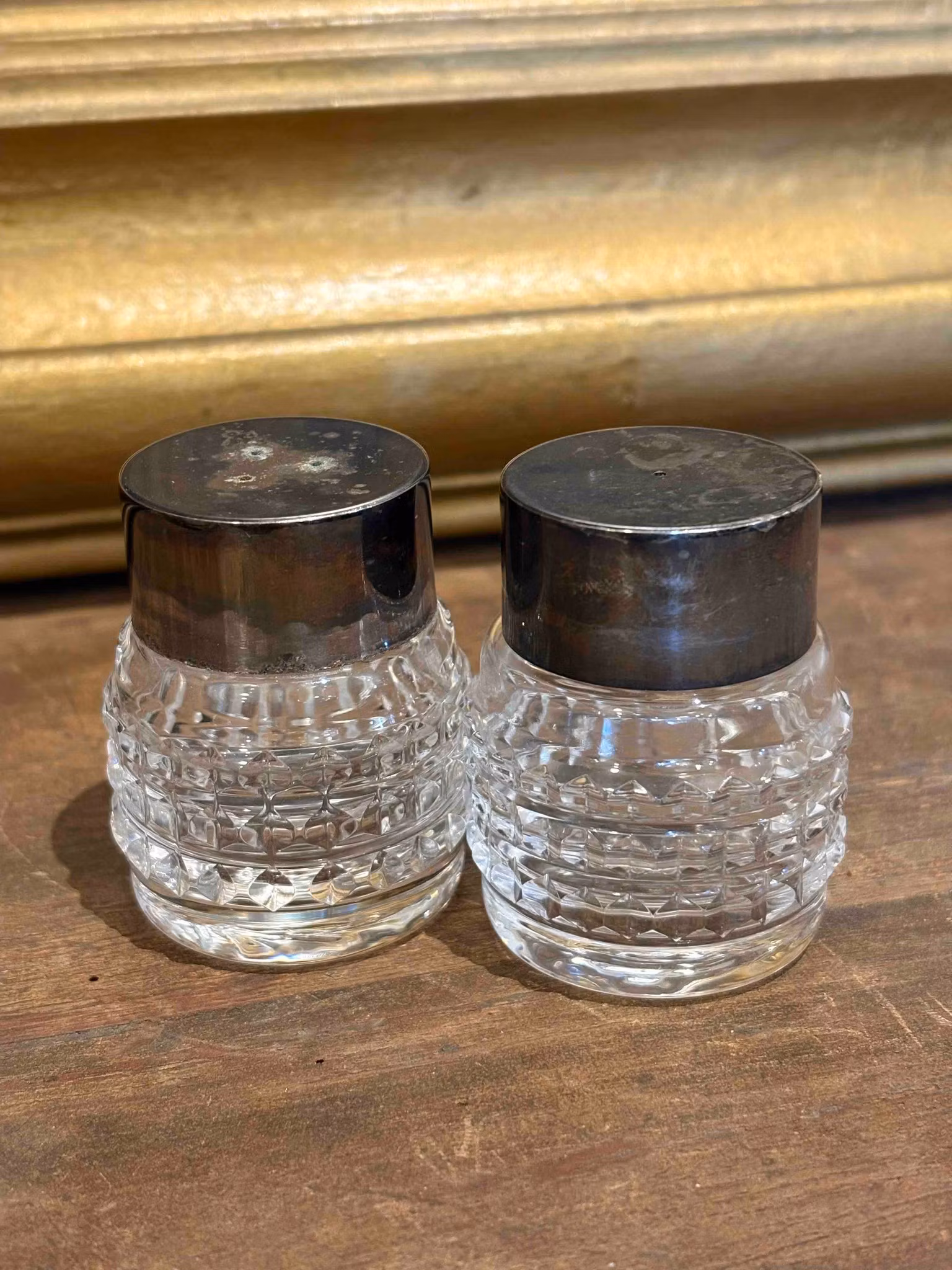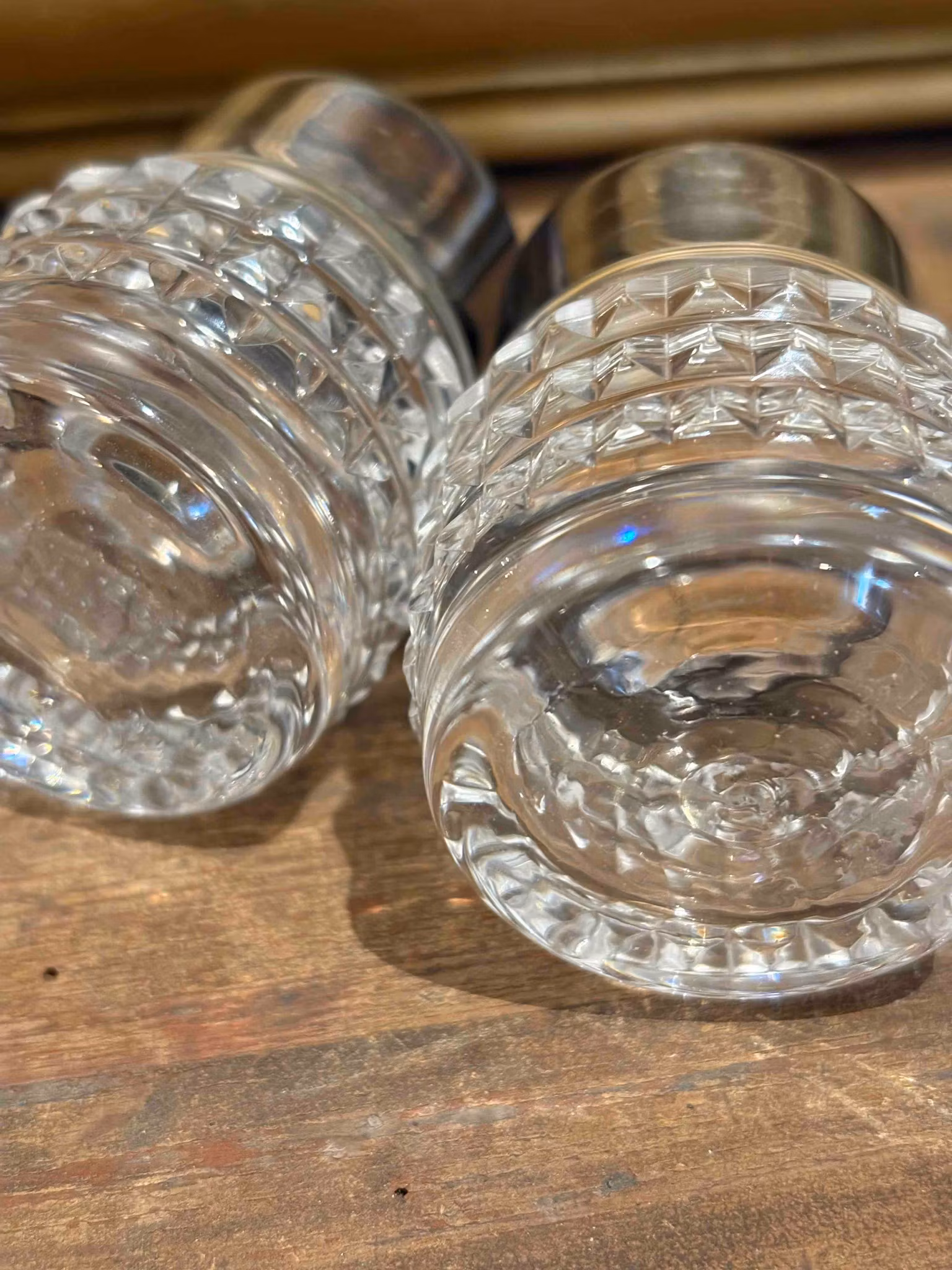Salt- och pepparströare ur Bengt Edenfalks serie Corona för Skruf. Glas och metall, ca 6 cm, fint bruksskick. Eleganta detaljer för bordet.