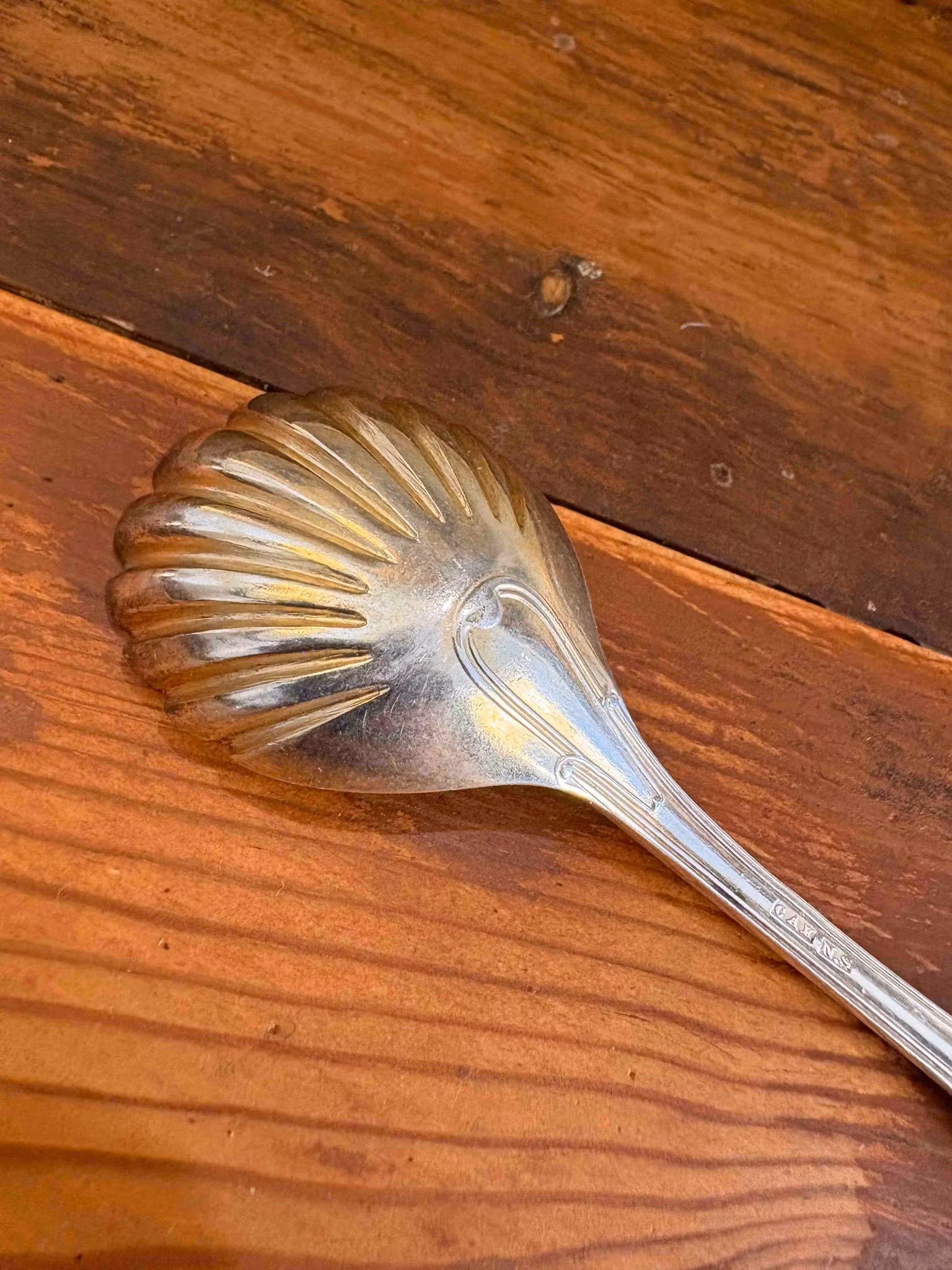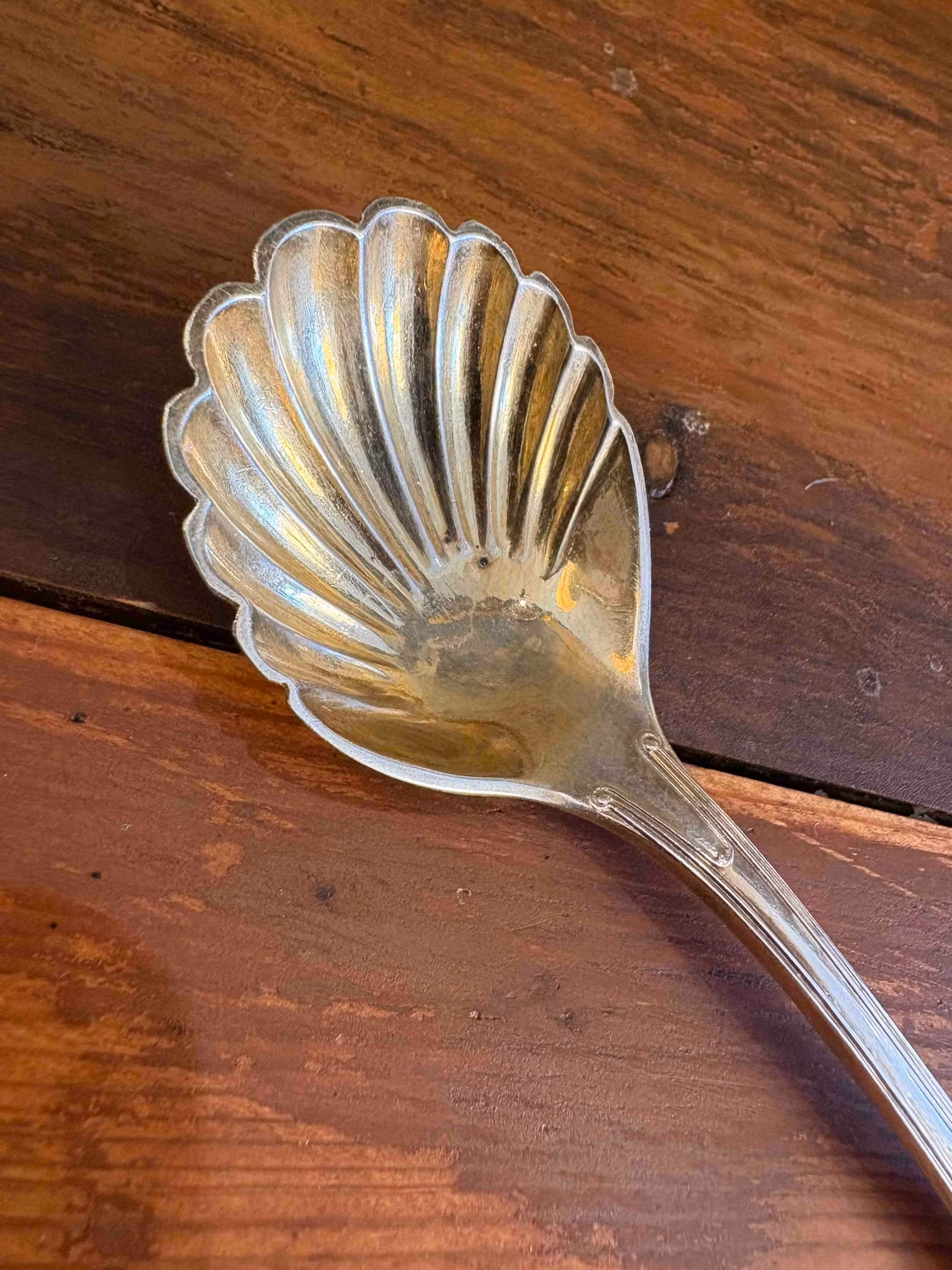 Serveringssked i nysilver formad som snäcka, ca 14 cm. En dekorativ och unik detalj för små serveringar och dukning.