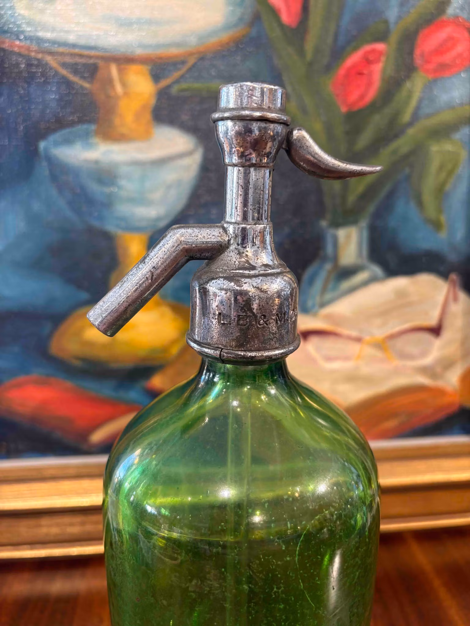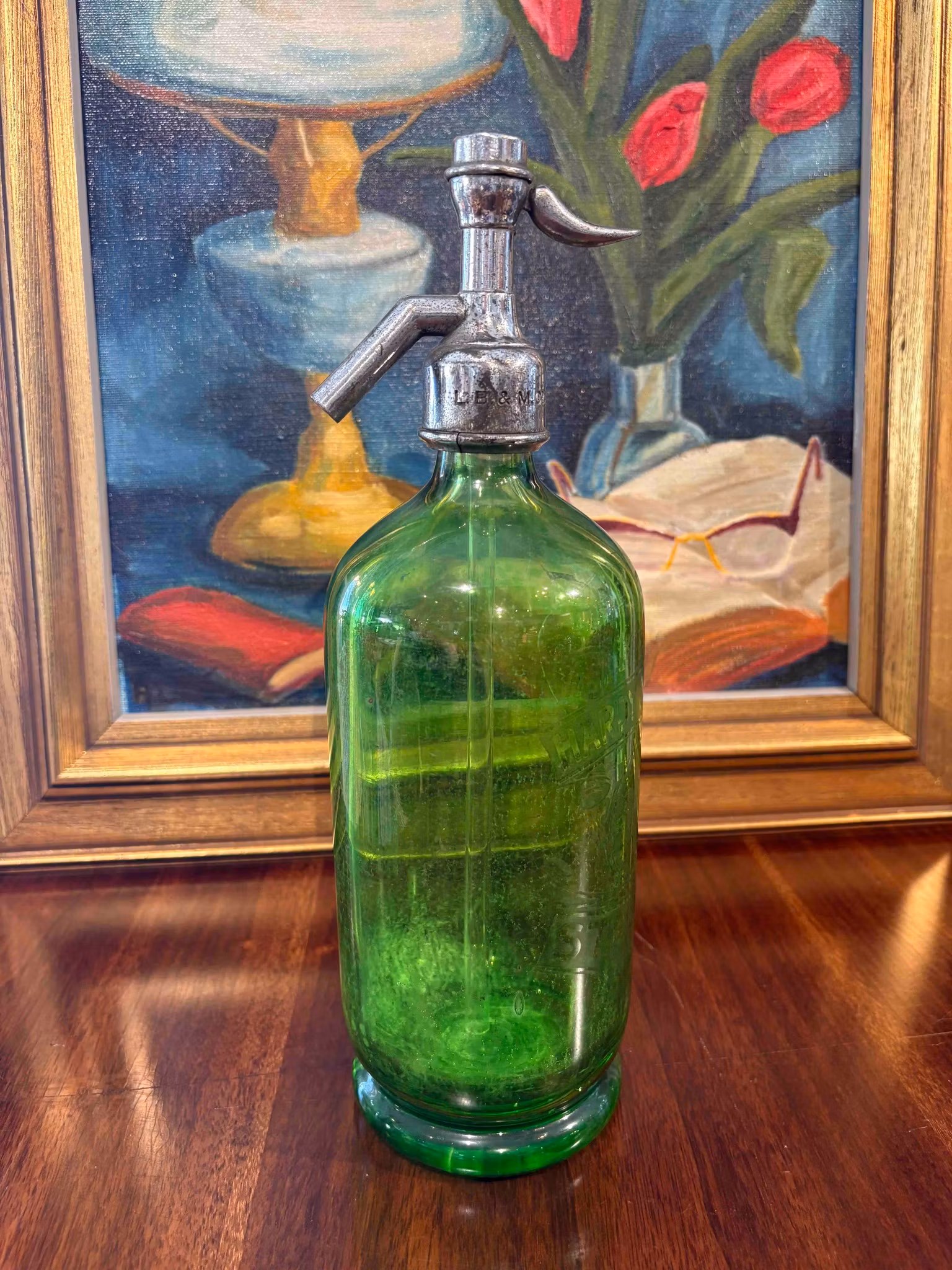 Sifon Soda i grönt glas från England är en vacker och karaktärsfull detalj med tydlig känsla av svunnen tid. Den djupa gröna tonen fångar ljuset fint och ger föremålet ett levande uttryck, medan den präglade texten “Harvey & Martin, Staveley and Kirkby” berättar om dess ursprung och historia.