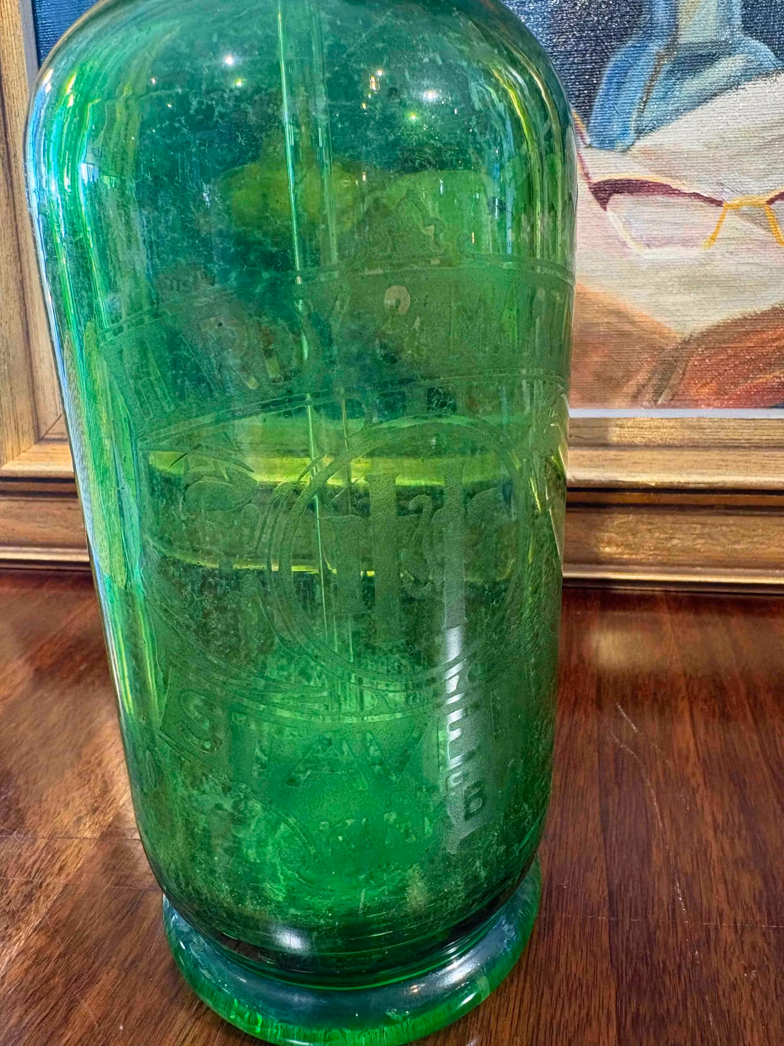 Vacker sifon i grönt glas från England med präglad text Harvey & Martin. Charmigt bruksskick och dekorativ vintage med historia. H ca 30,5 cm.