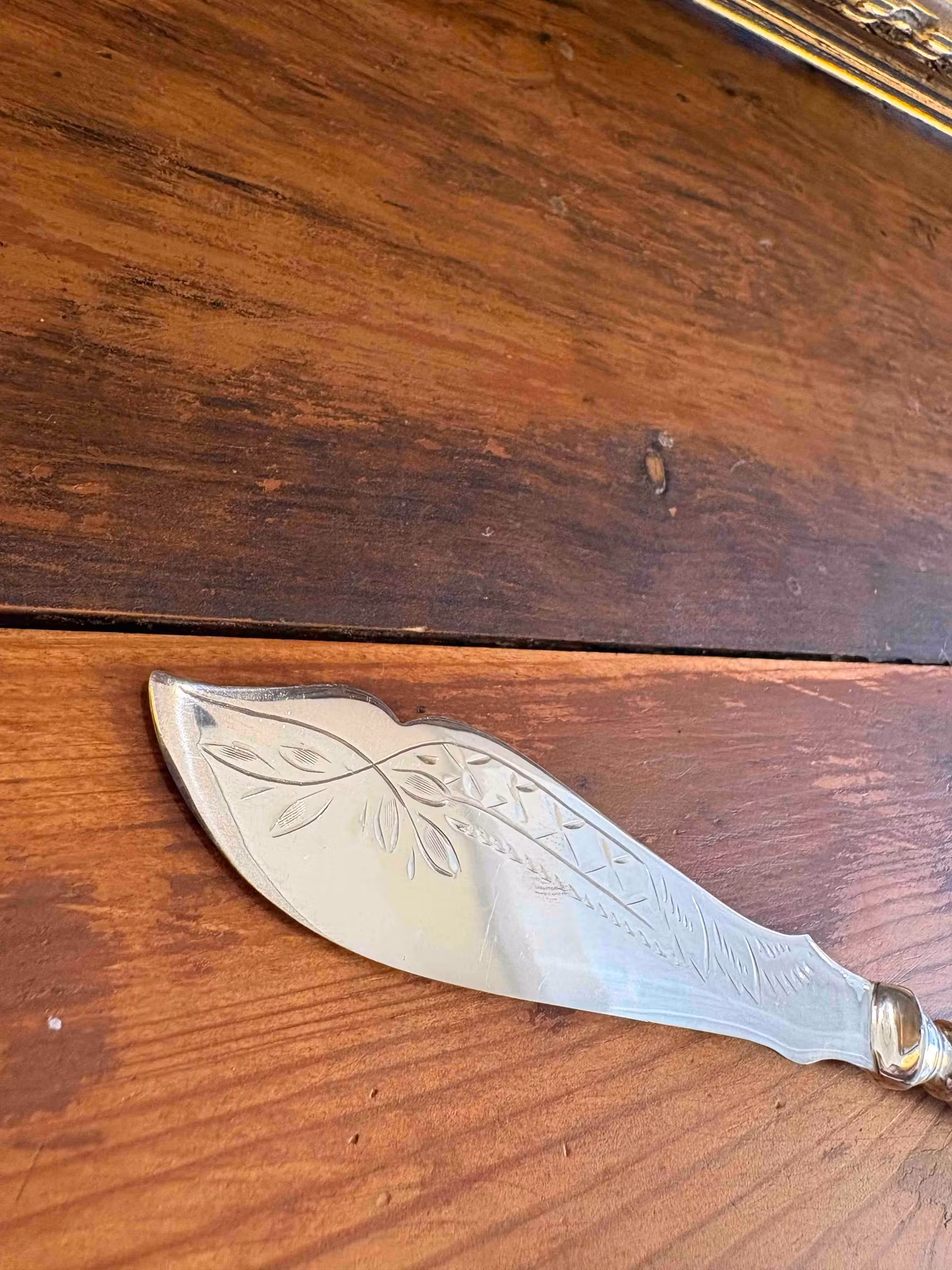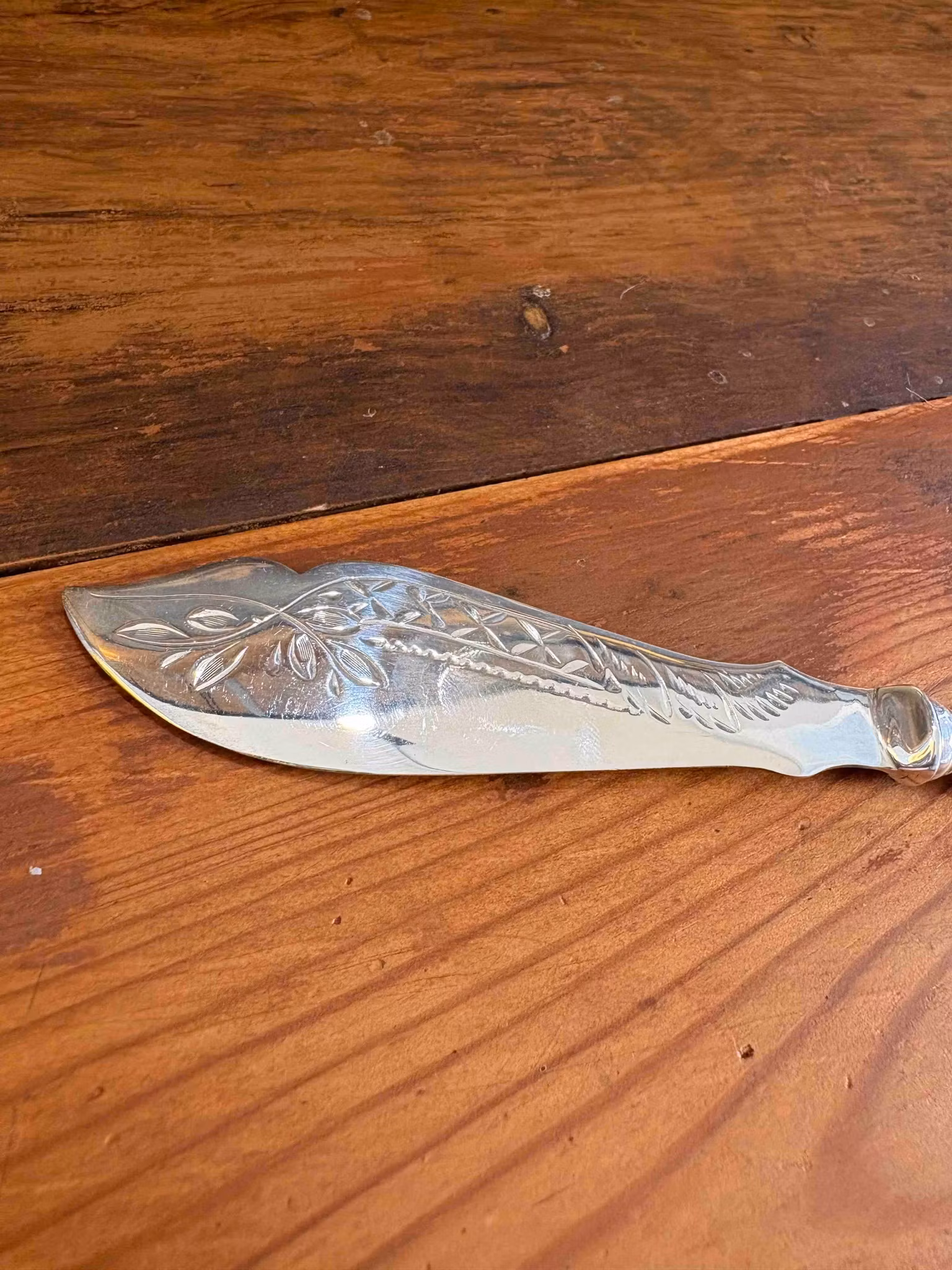 Smörkniv i nysilver, ca 20 cm. En vacker och dekorativ detalj med fina detaljer – perfekt till frukost och servering.