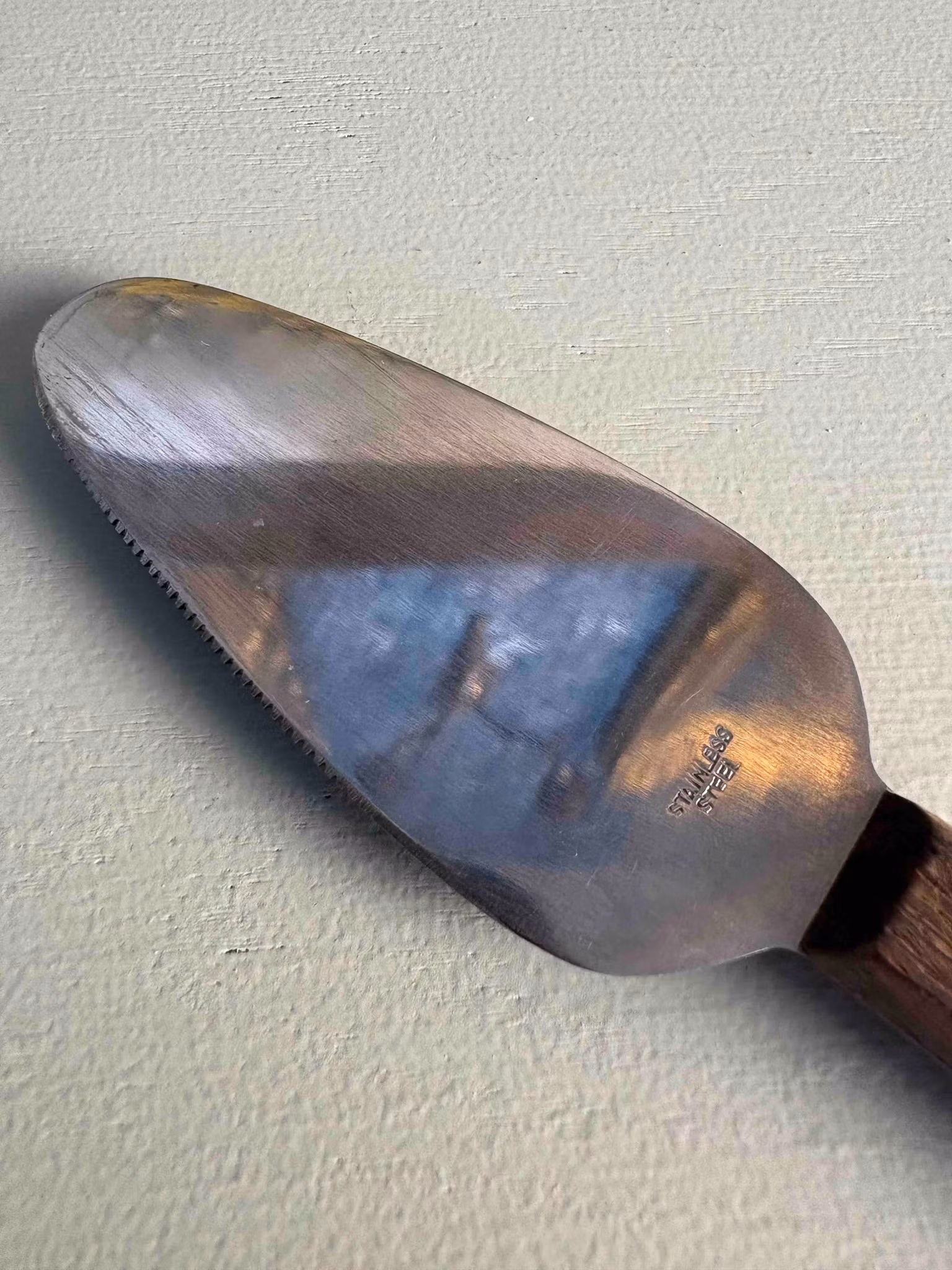 Smörkniv med träskaft i bruksskick, ca 18 cm. Perfekt till smör, ostbrickor, pastejer och servering av plock.