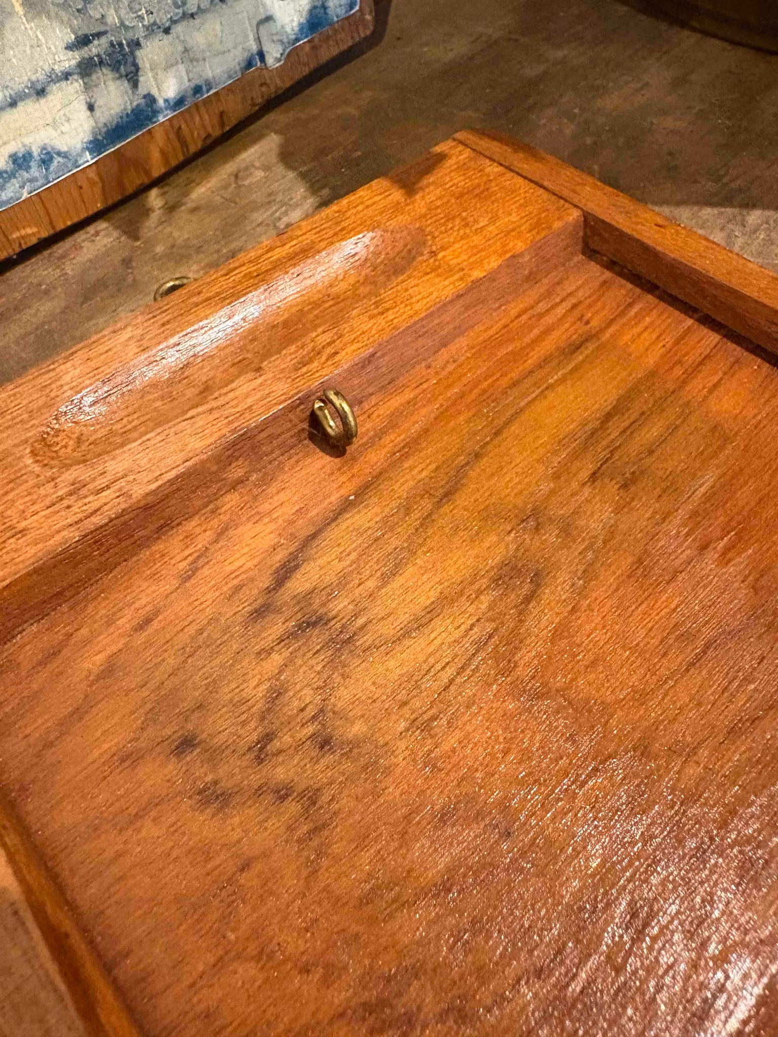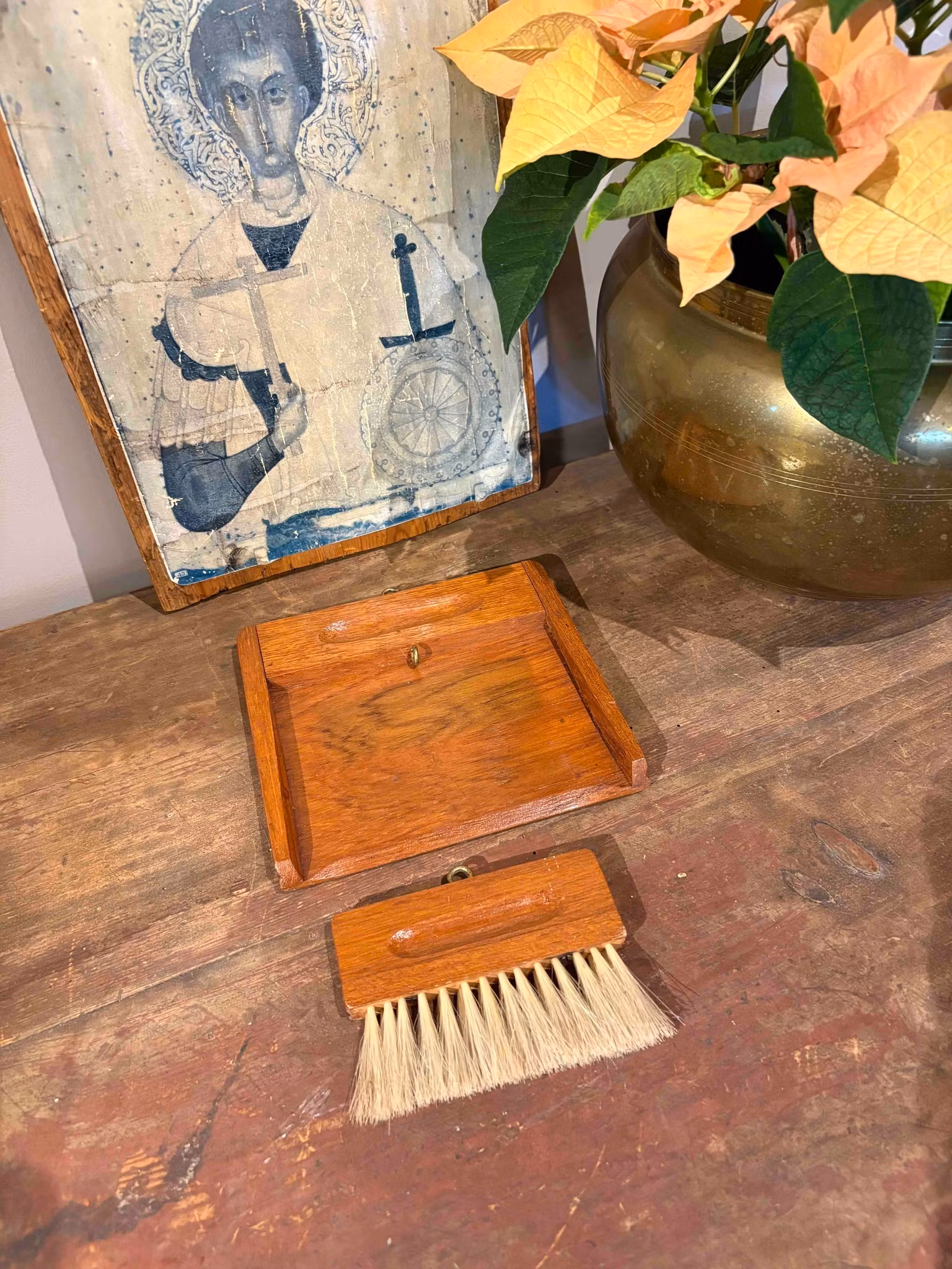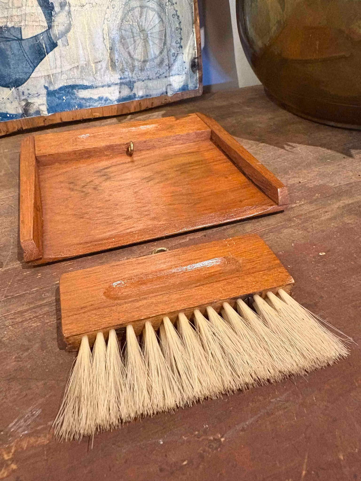 Ett charmigt smulset i teak som både är praktiskt och fint att ha framme. Förutom att samla upp smulor eller småplock har det dessutom en upphängningsmöjlighet, vilket gör det enkelt att förvara på väggen när det inte används. Den varma teaktonen och den rena formen ger en tydlig vintagekänsla.