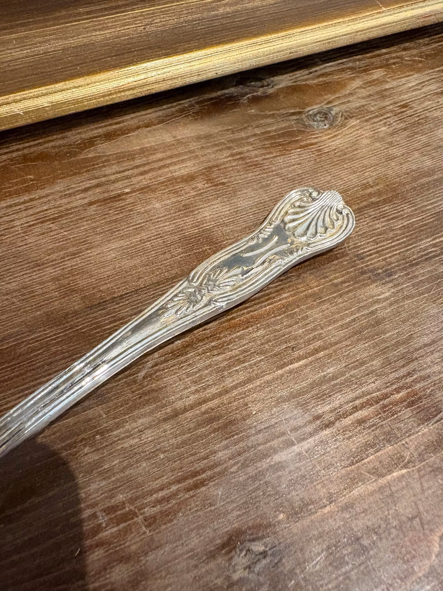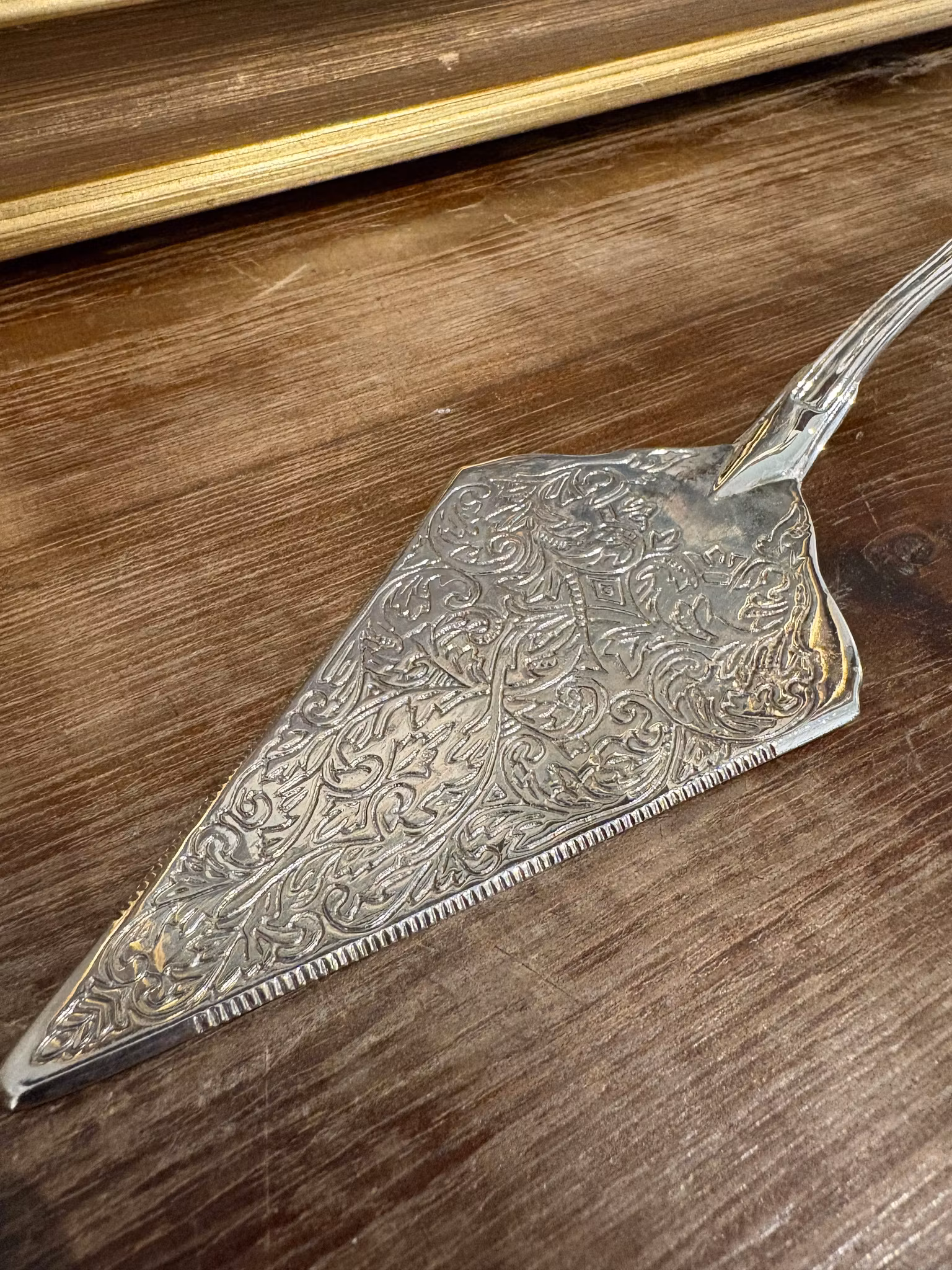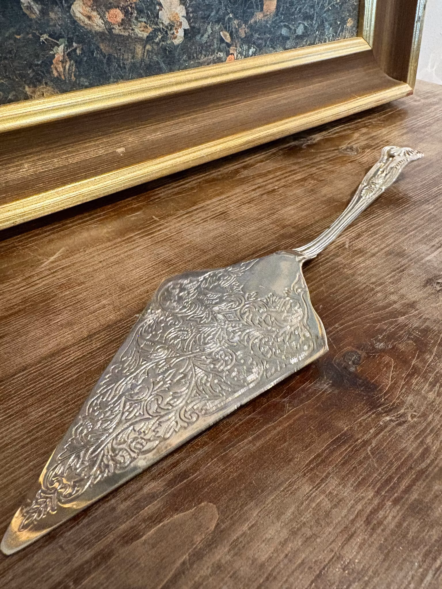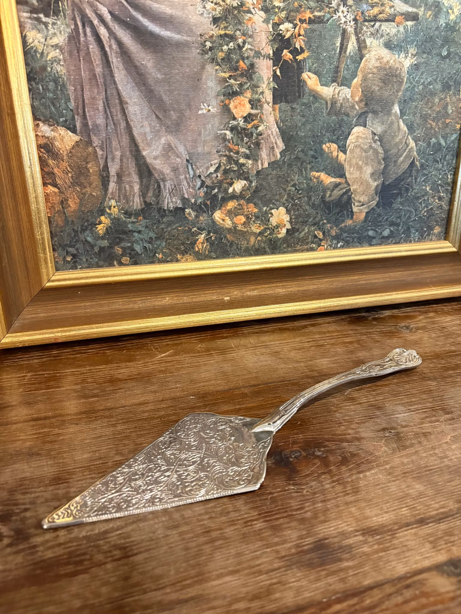 Stor tårtspade med vackra detaljer. Perfekt för att servera tårta, paj eller bakverk med stil. Klassisk design i metall – ett fint vintagefynd.