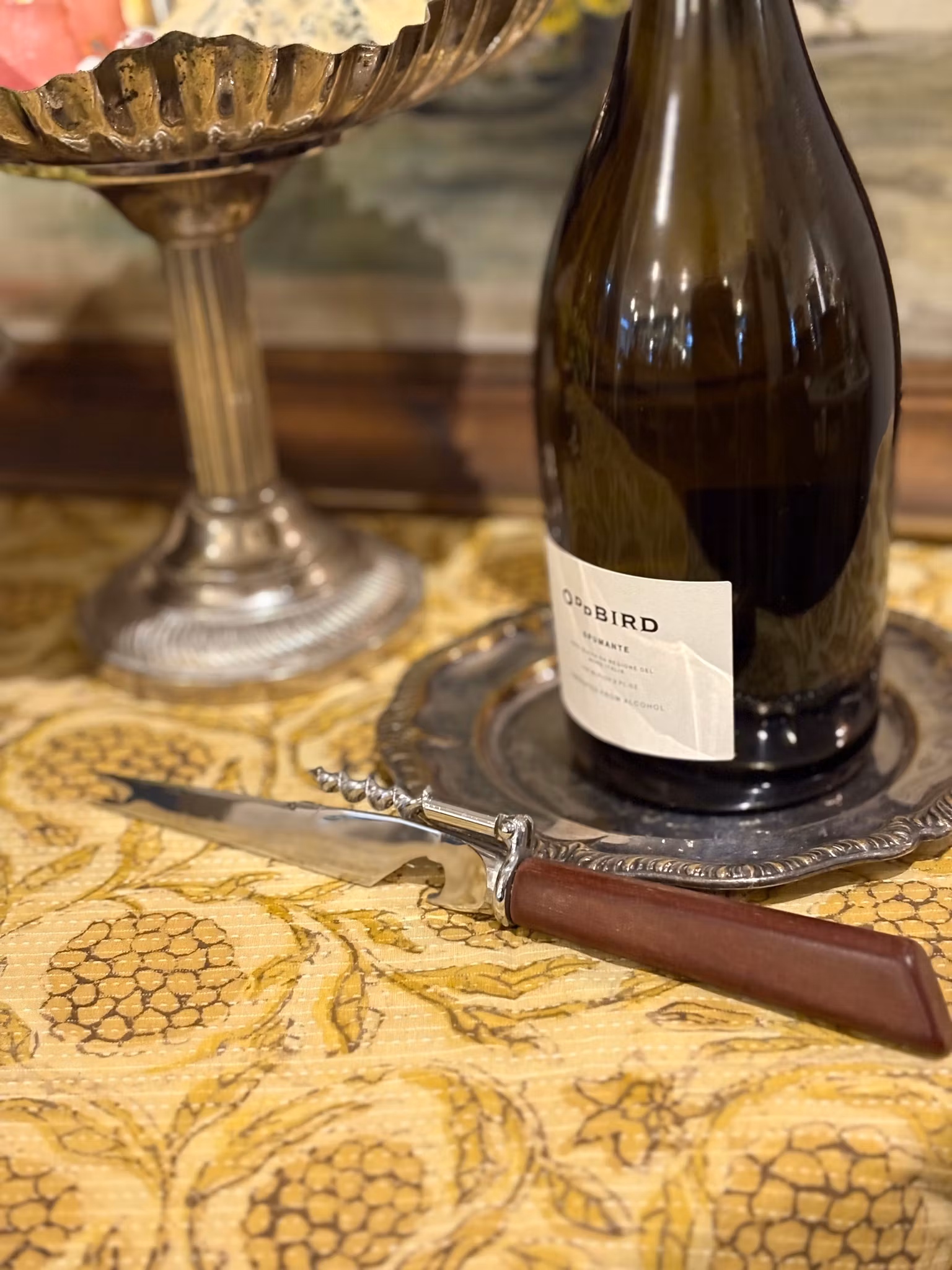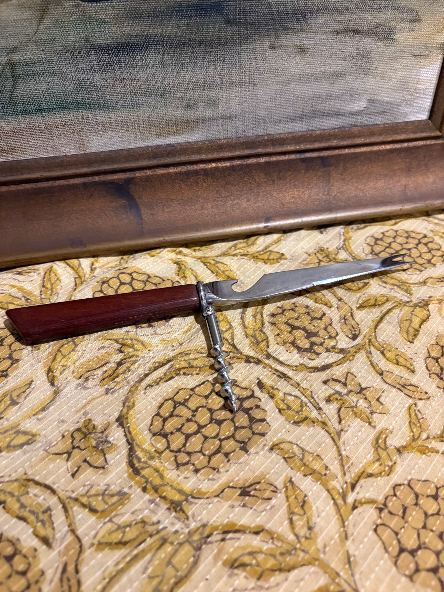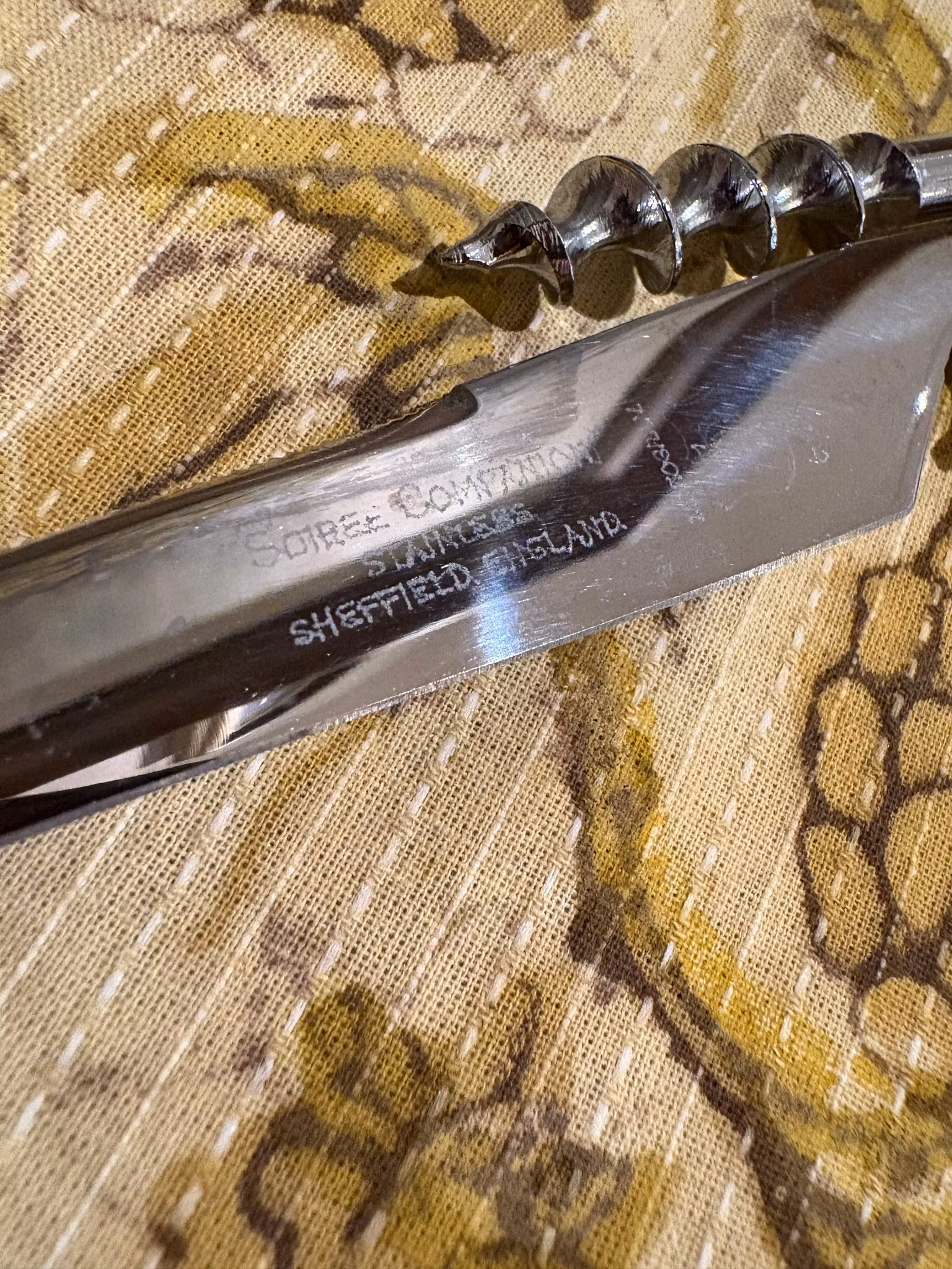 En elegant kombinationskniv från Sheffield, England – märkt Soiree Companion. Ett klassiskt och vackert verktyg i metall med trähandtag, utrustad med både korkskruv och flasköppnare. Perfekt följeslagare till picknick, utflykt eller servering.