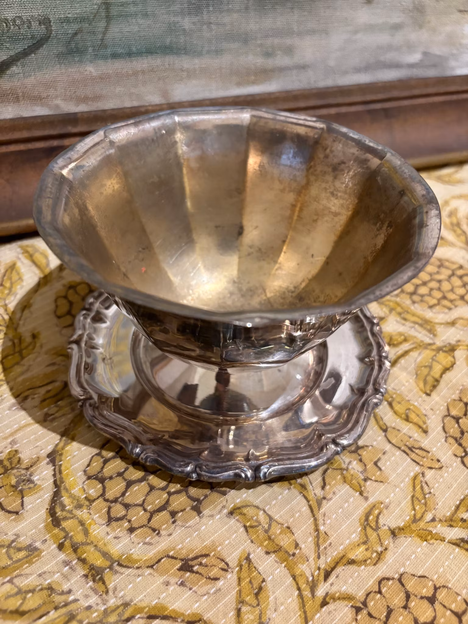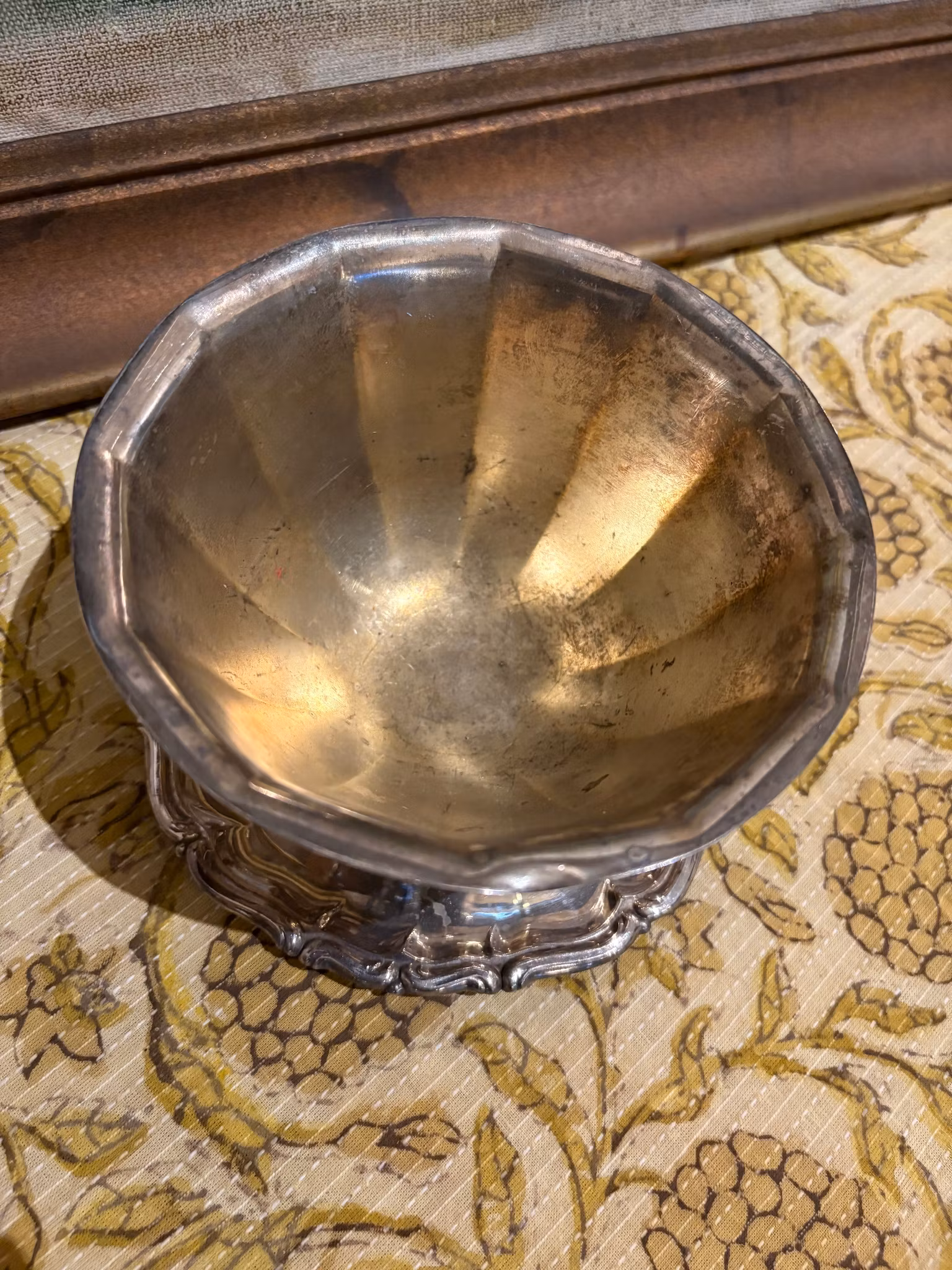 Liten skål på fot i vitmetall, ca 7,5 cm hög och 13,5 cm i diameter. Fint bruksskick – perfekt för frukt, nötter eller snacks.