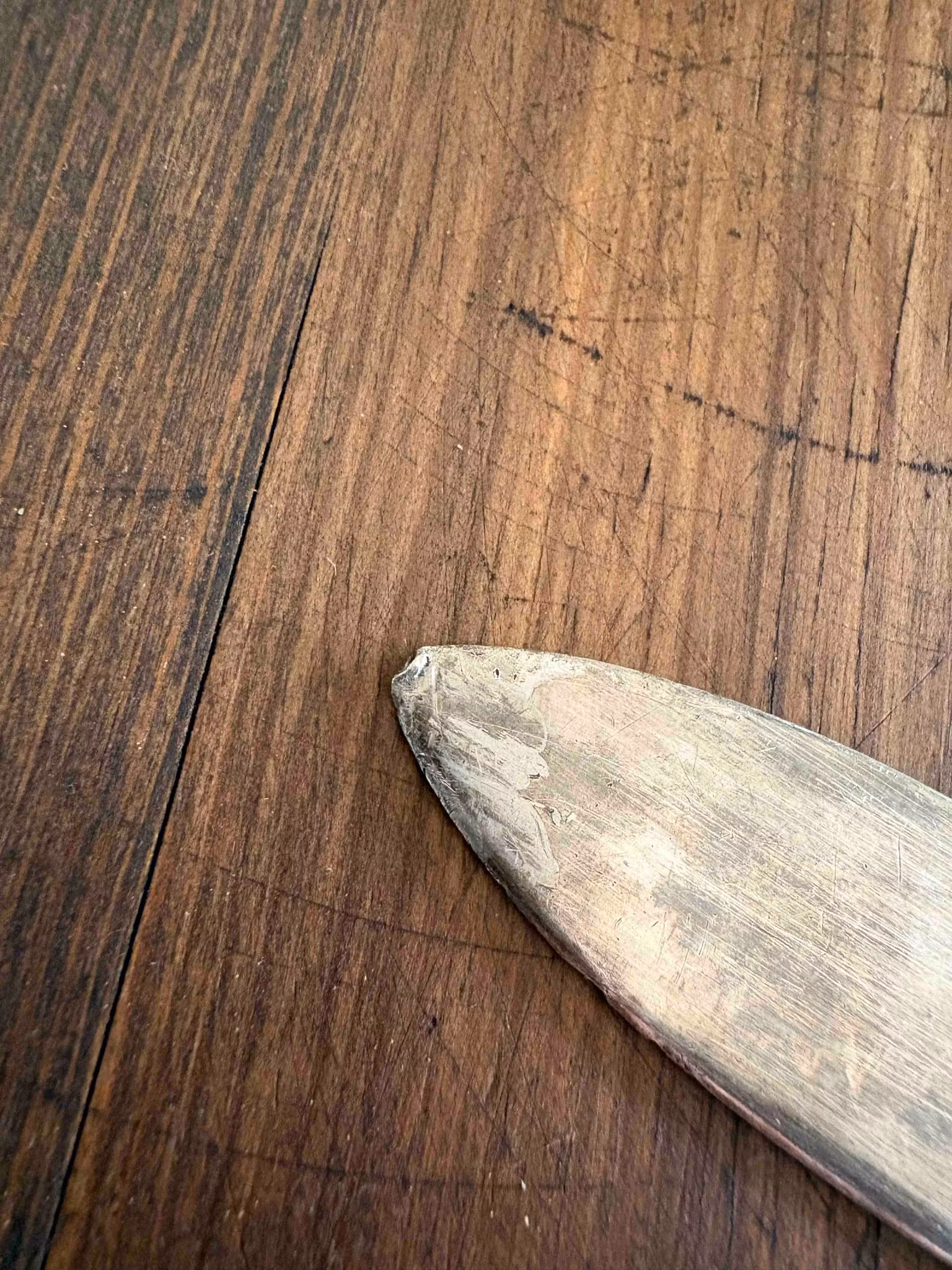 Underbar brevkniv i nysilver, ca 24 cm lång. Bruksskick med vacker patina – spetsen är något trubbig, se bild.