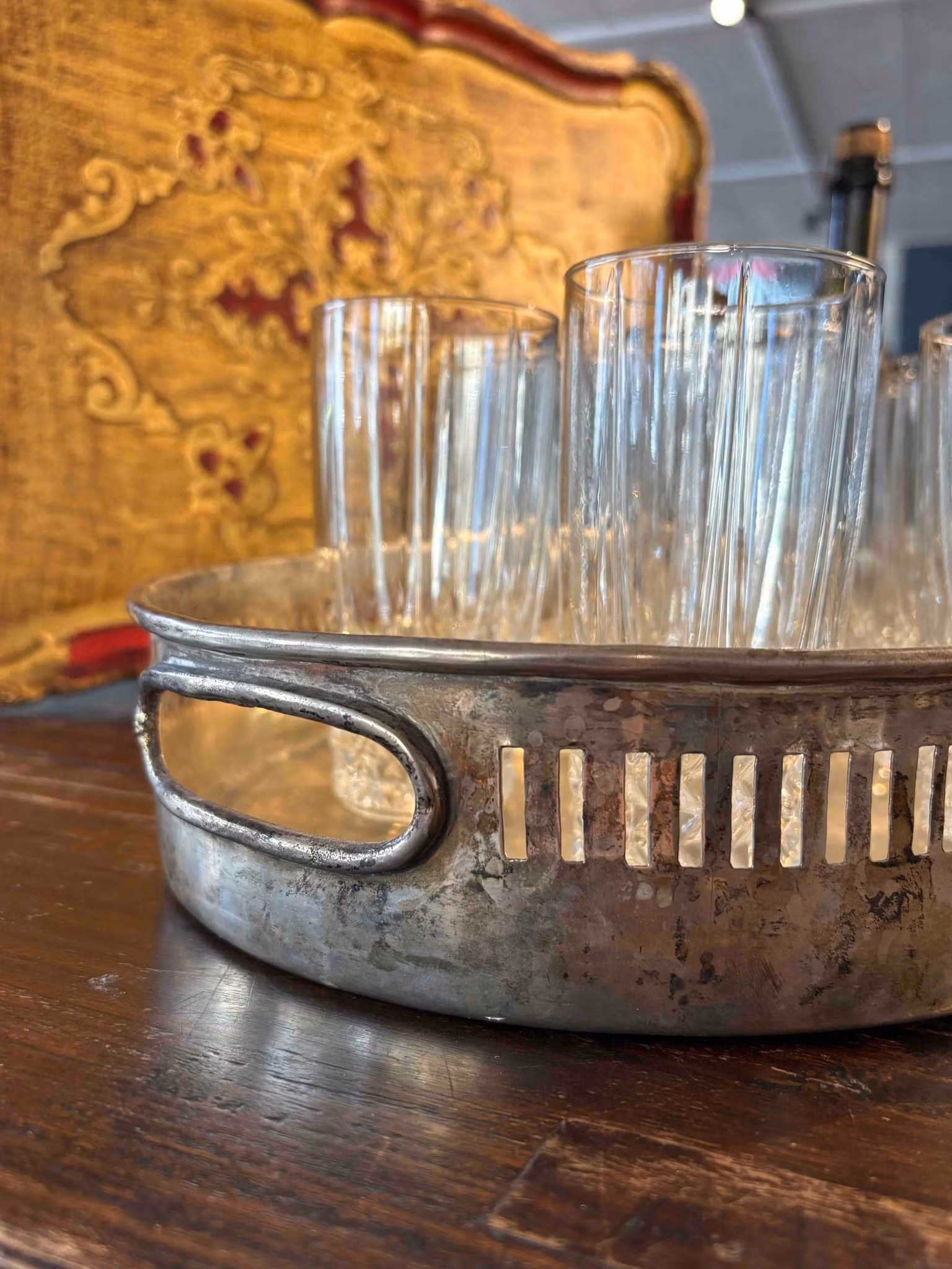 Underbar bricka med hög kant och handtag i metall. En vacker vintagebricka med fin patina som vittnar om tid och användning. Den höga kanten och de praktiska handtagen gör den både funktionell och dekorativ – perfekt för servering eller som bas för ett stilleben på bordet.