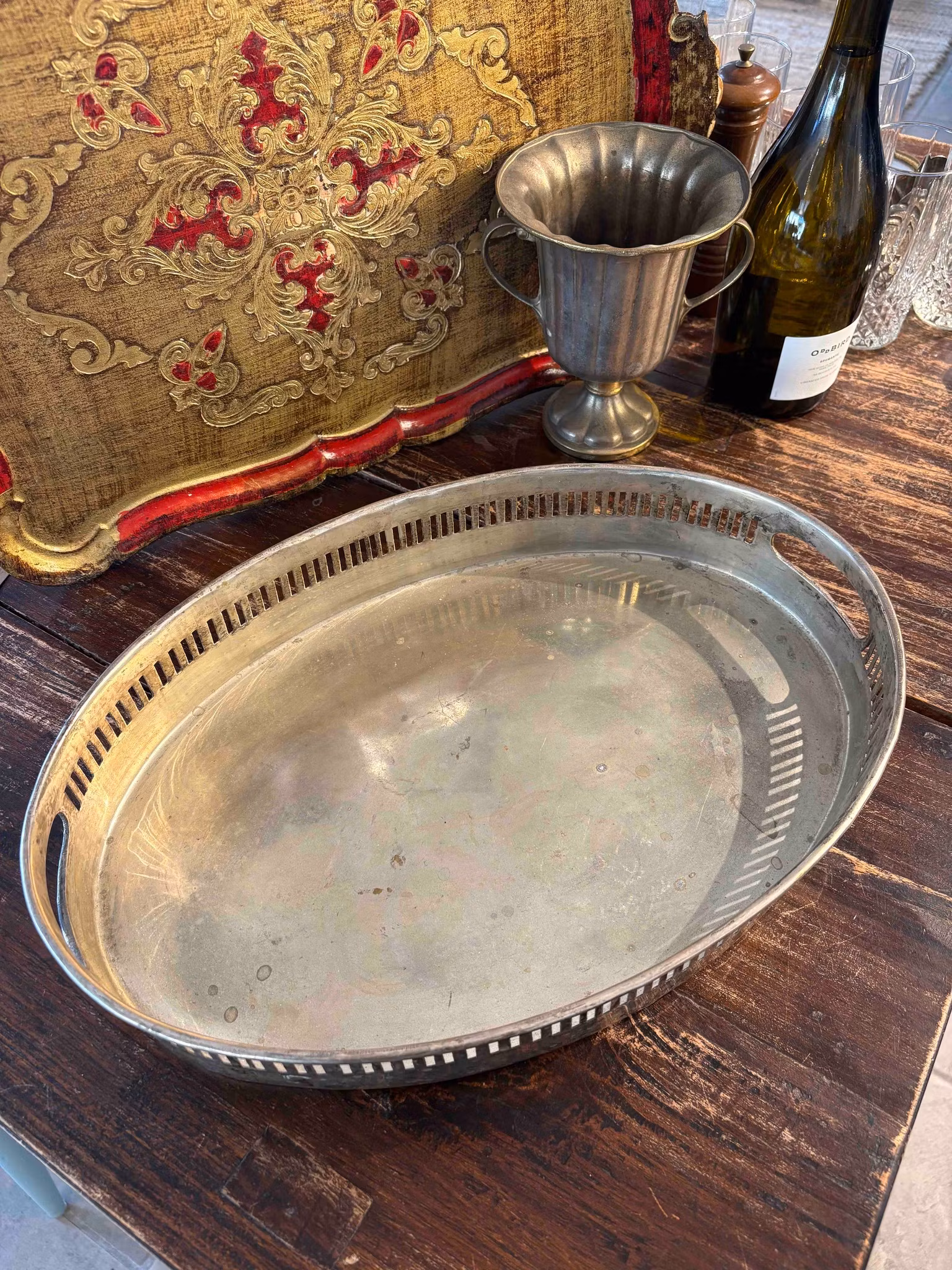 Vintagebricka i metall med hög kant och handtag. Vacker patina och bruksskick. Perfekt för servering eller dekoration.