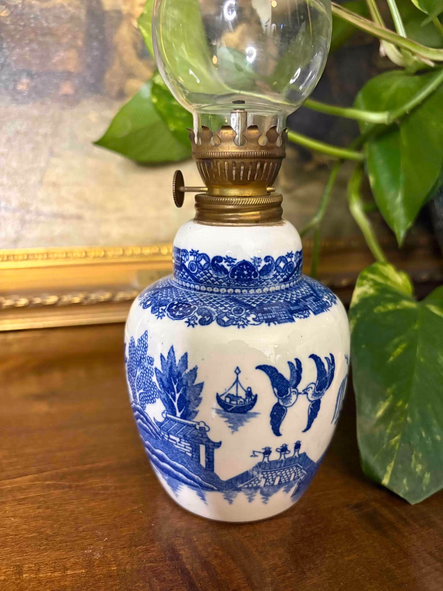 Underbar oljelampa i porslin med Blue Willow-mönster. Perfekt dekorativ detalj.