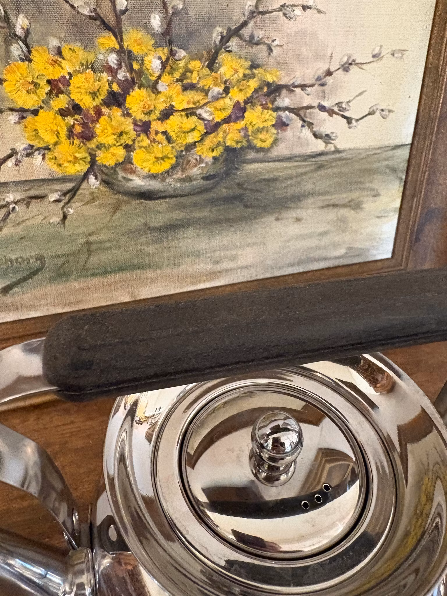 Elegant tekanna med sil i rostfritt stål, 2L. Fint bruksskick, silen oanvänd – perfekt för löste och mysiga te-stunder.