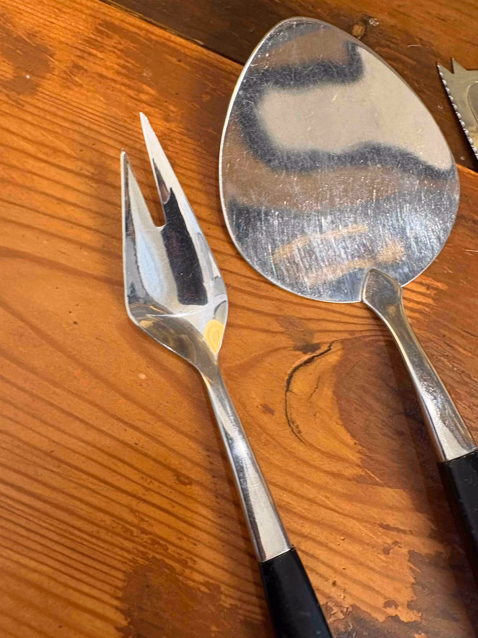 Ett vackert set med tre uppläggningsbestick där de svarta handtagen möter metallen i en fin kontrast. Formen är välbalanserad och ligger bra i handen, vilket gör serveringen både enkel och behaglig.