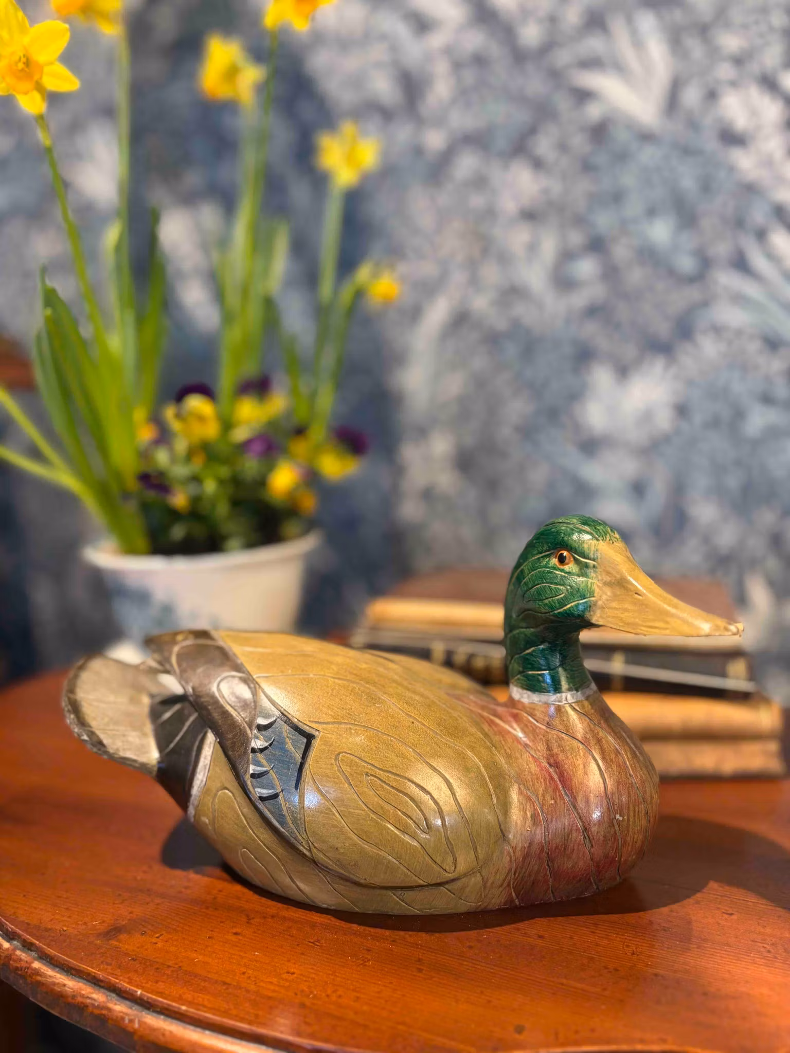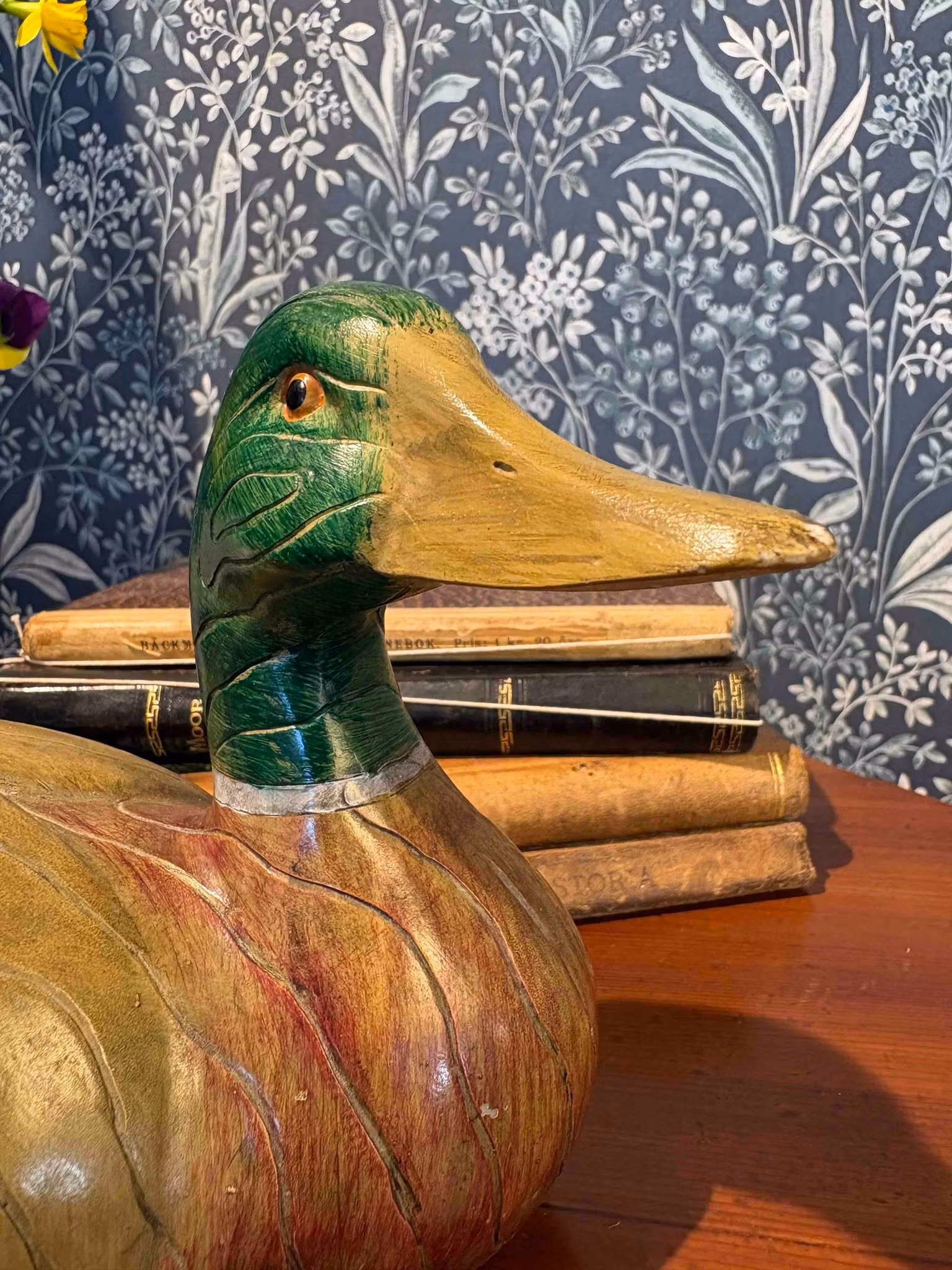 En vacker and i snidat trä, med ett mjukt och levande uttryck. Det är ett föremål med lugn och tyngd – en dekorativ detalj som inte behöver ta plats, men som ändå fångar blicken.