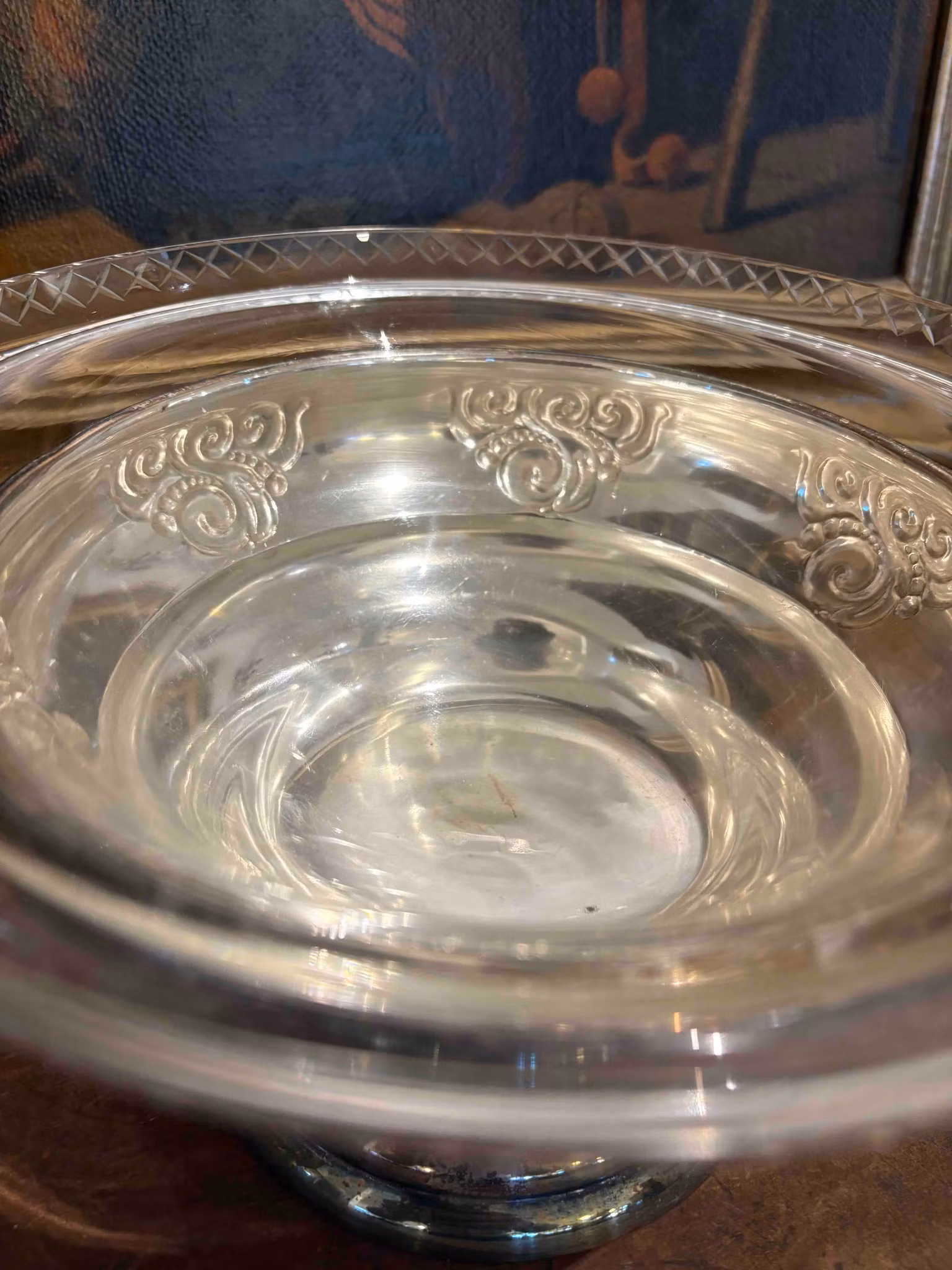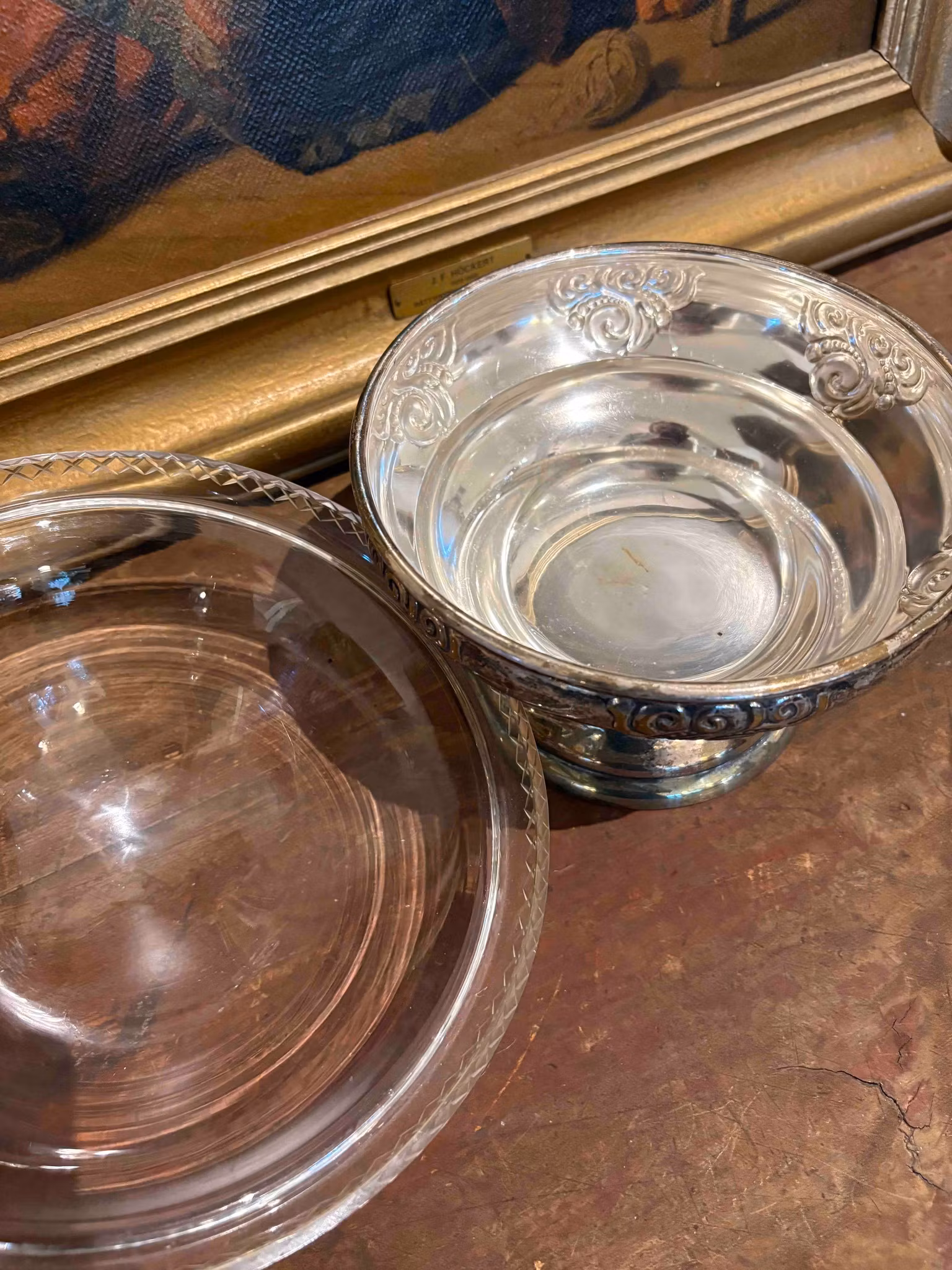 Vacker bordsuppsats i glas och nysilver, två delar. Perfekt för julens dukningar. Fint bruksskick med några repor i glaset. 14 cm hög, 24 cm i diameter.