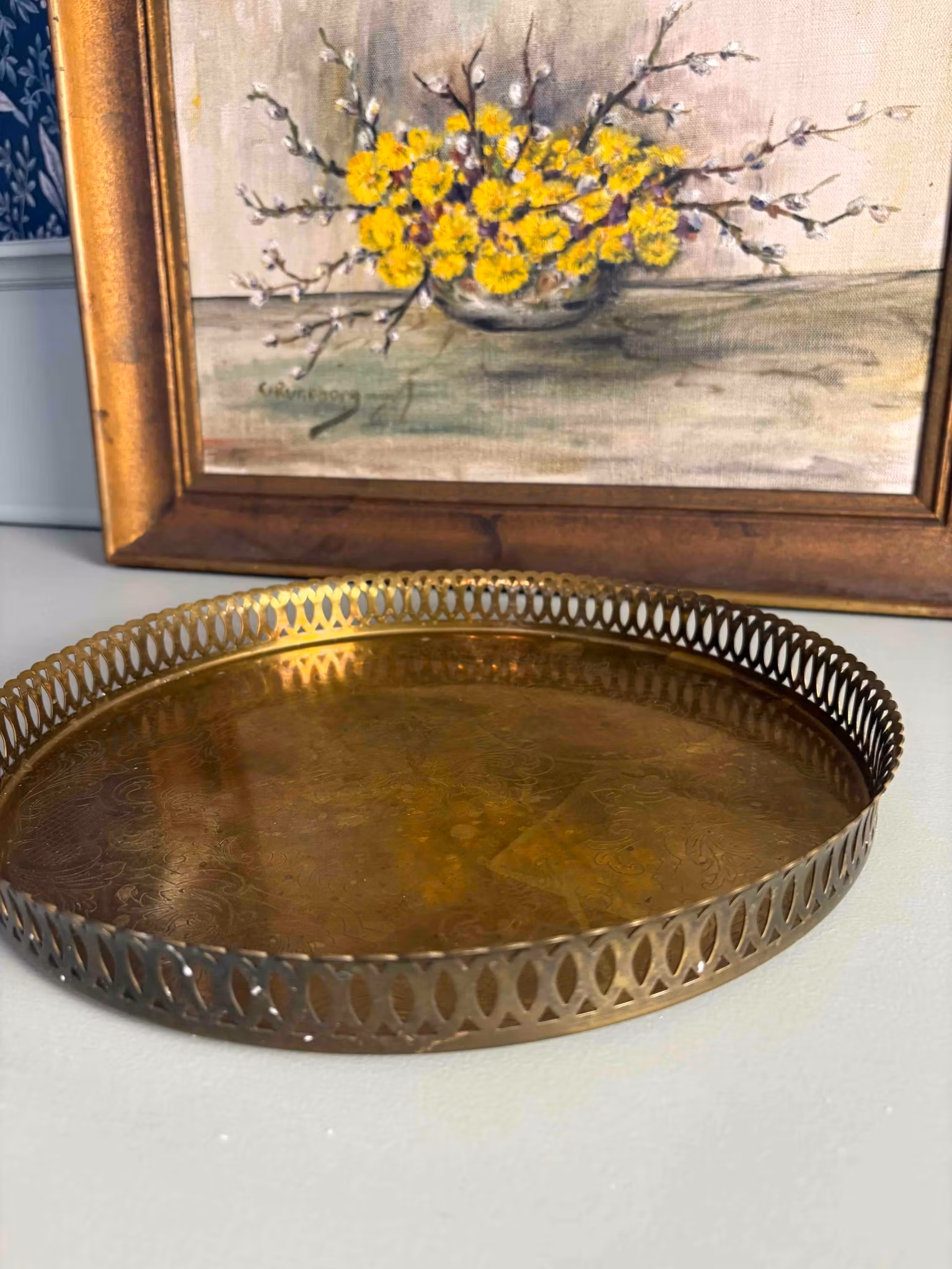 Vacker bricka i guldfärgad metall