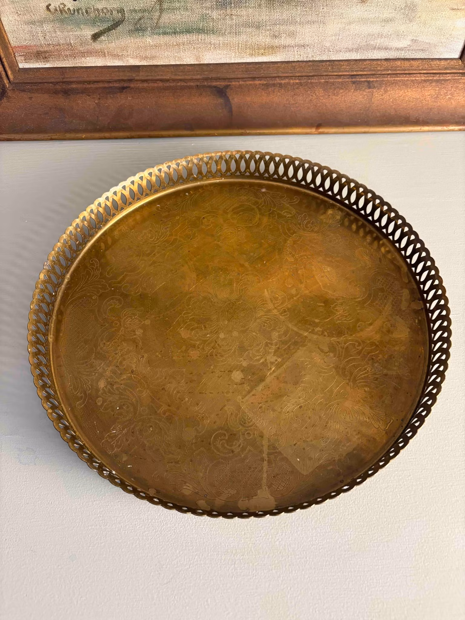 Vacker rund bricka i guldfärgad metall med fin patina. Perfekt för ljus, dekoration eller stilleben. Diameter ca 28,5 cm.