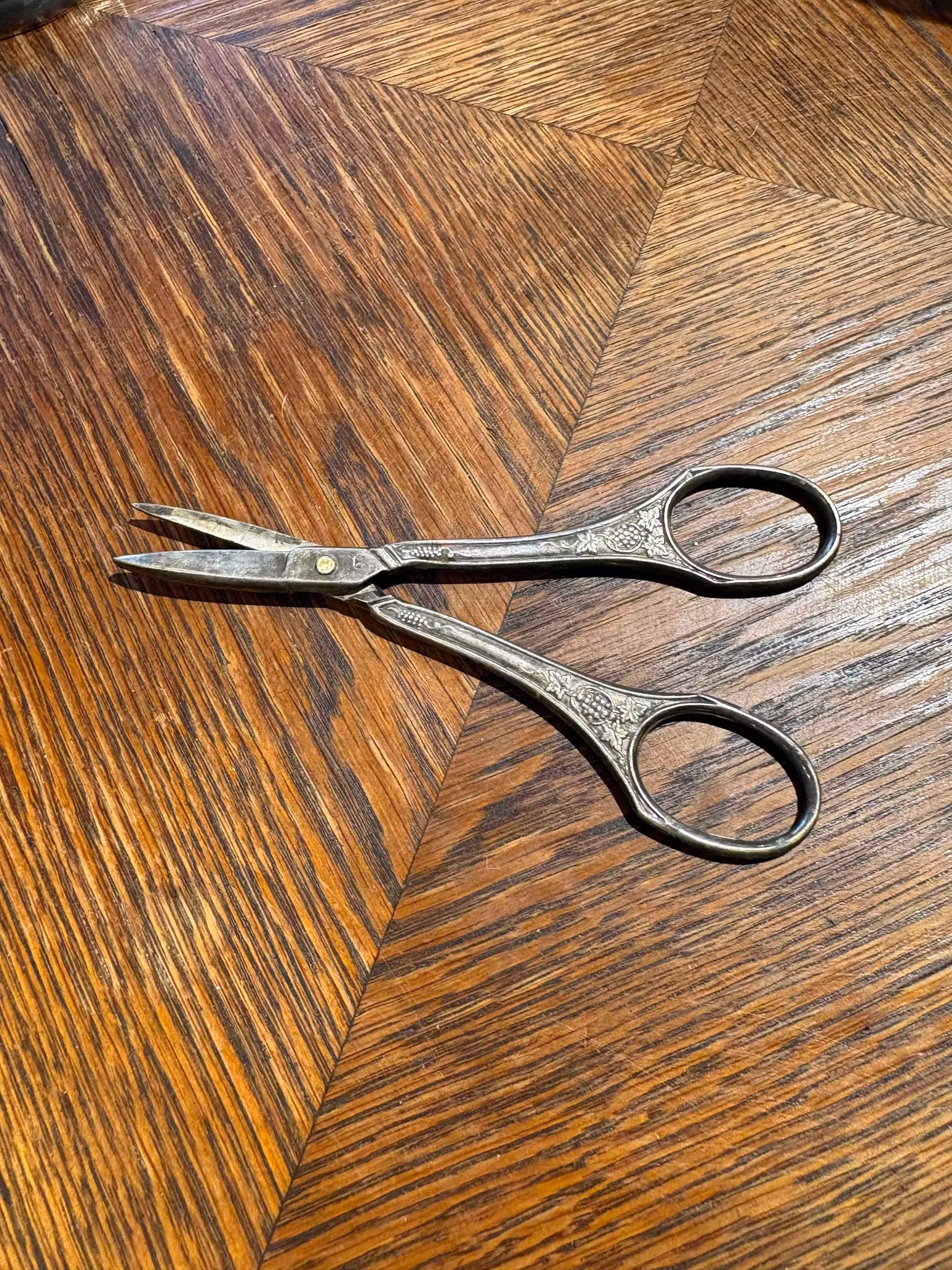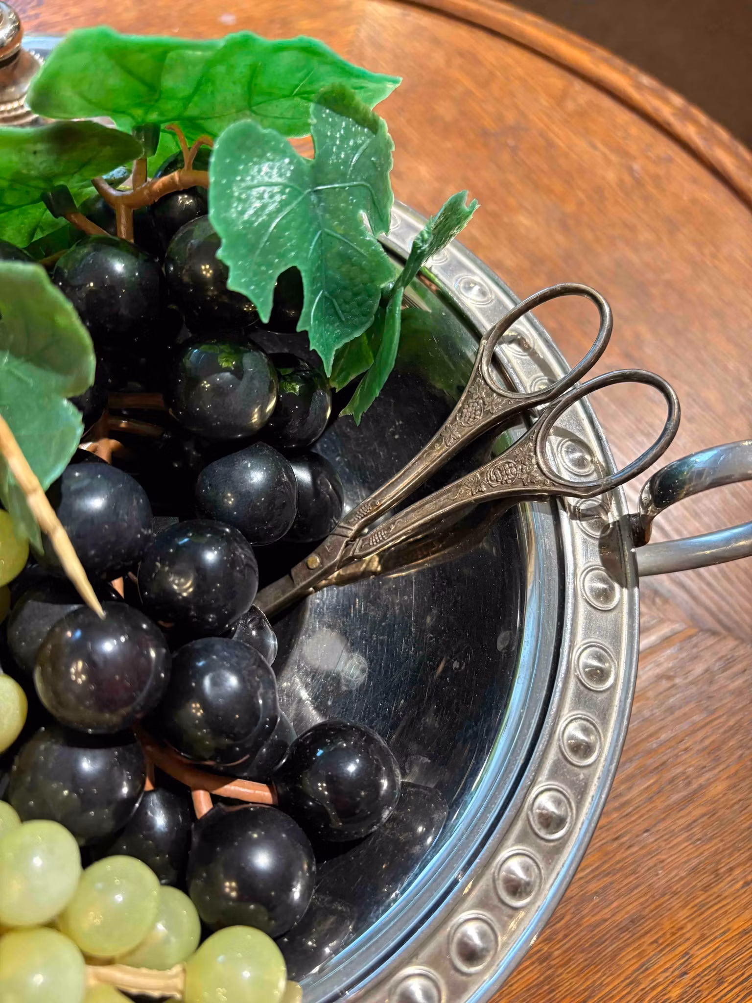 Vacker druvsax i metall, ca 12 cm. I bruksskick med fin patina – en klassisk och funktionell detalj för servering av frukt.