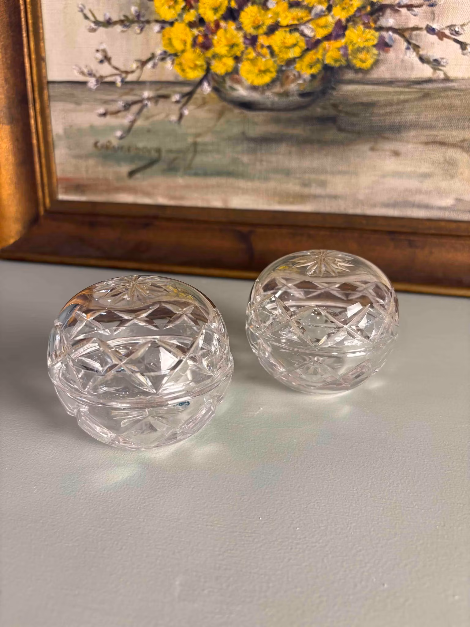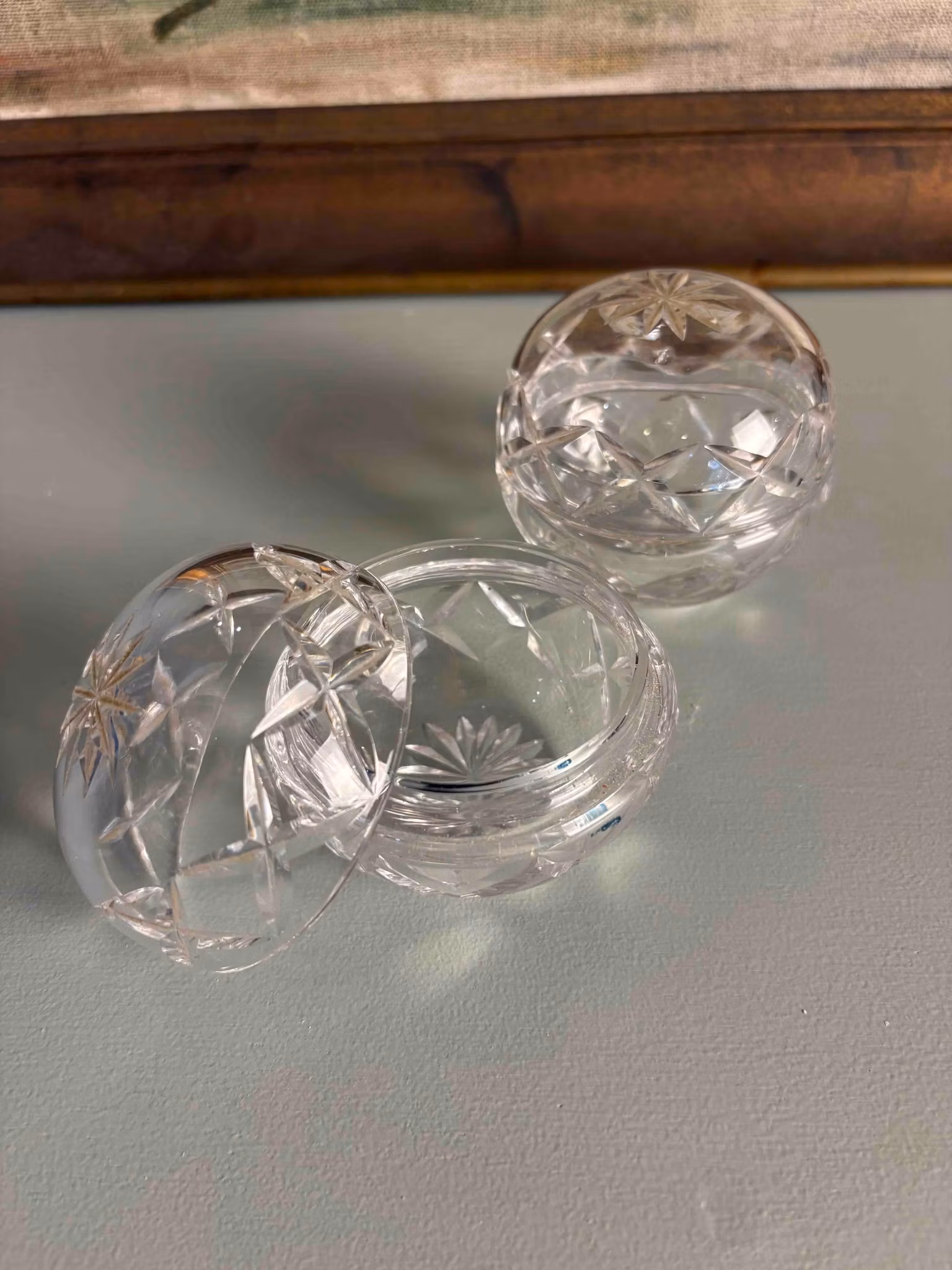 Vacker liten glasskål med lock, perfekt för smycken som ringar och örhängen. En dekorativ och praktisk detalj i fint bruksskick.