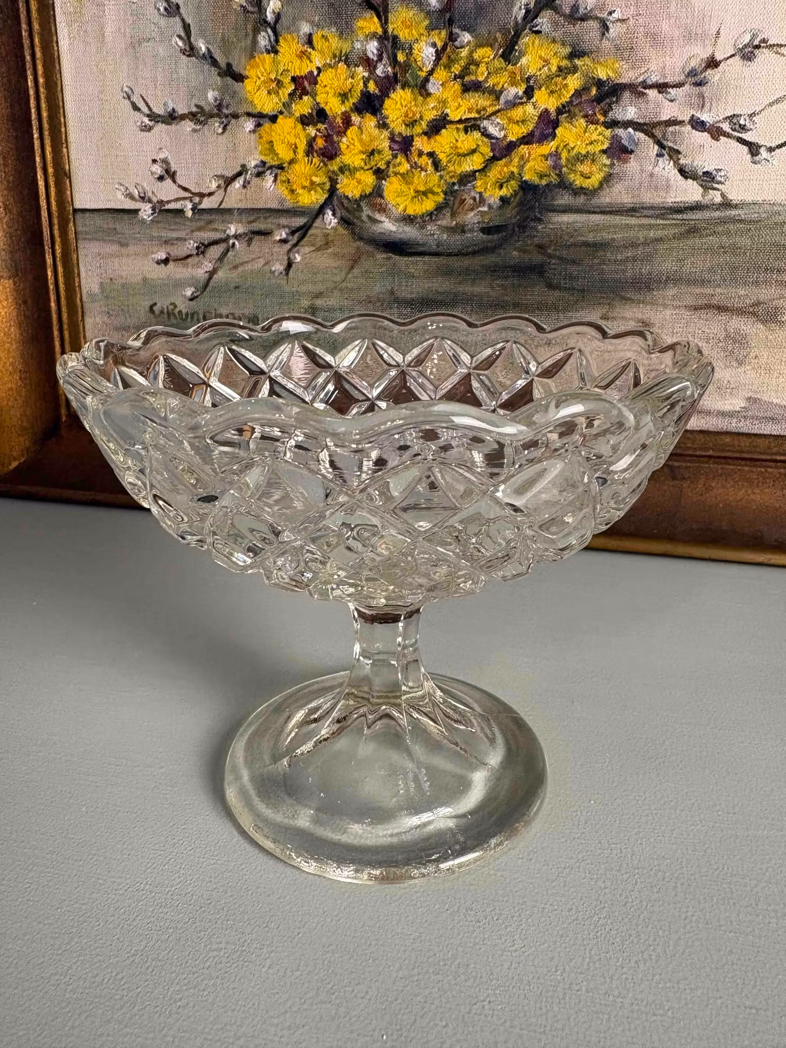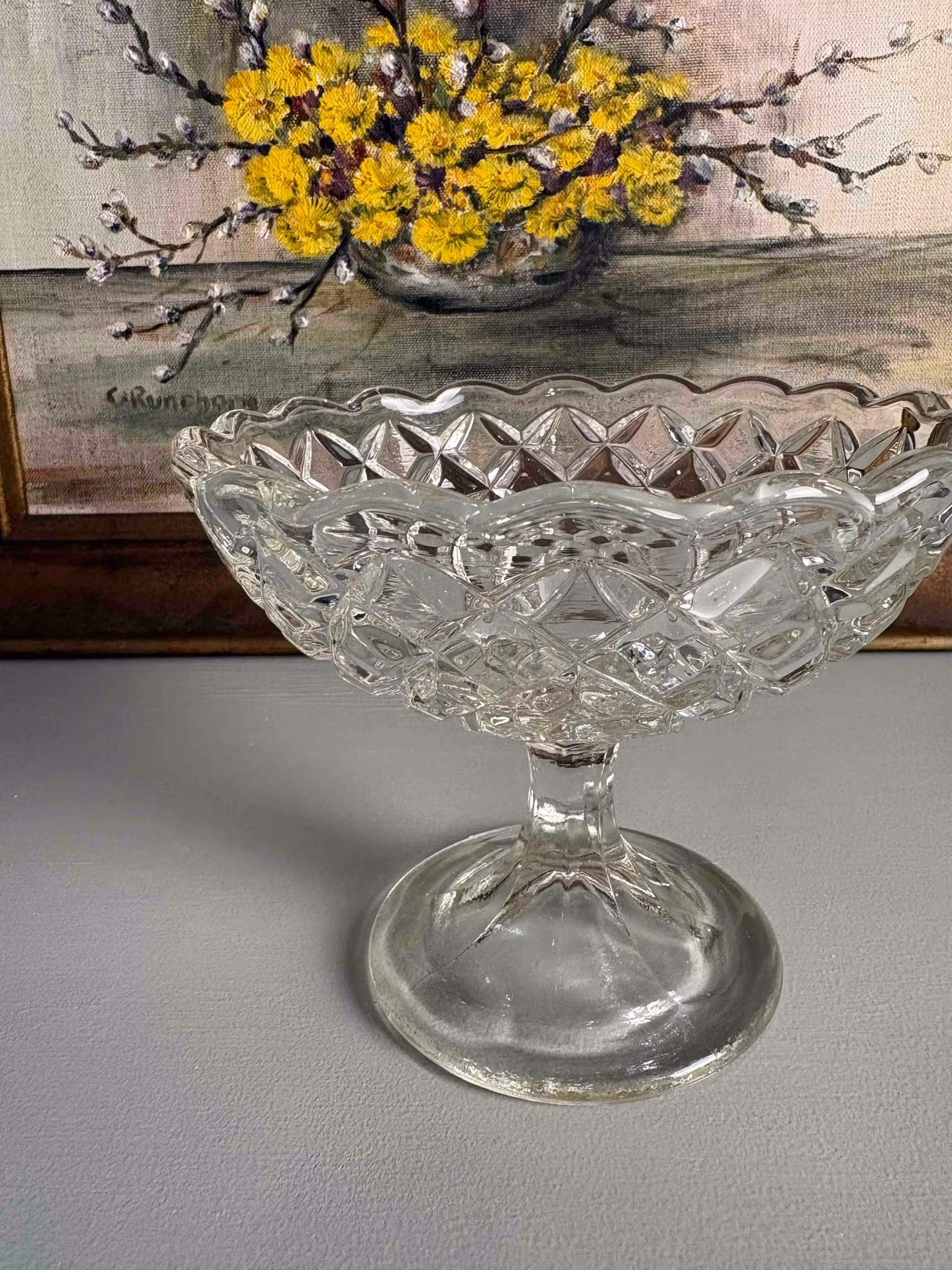En vacker glasskål på fot som lyfter det som placeras i den – bokstavligt och i känsla. Glaset fångar ljuset och skapar ett levande skimmer, medan den upphöjda formen ger en fin närvaro på bordet.