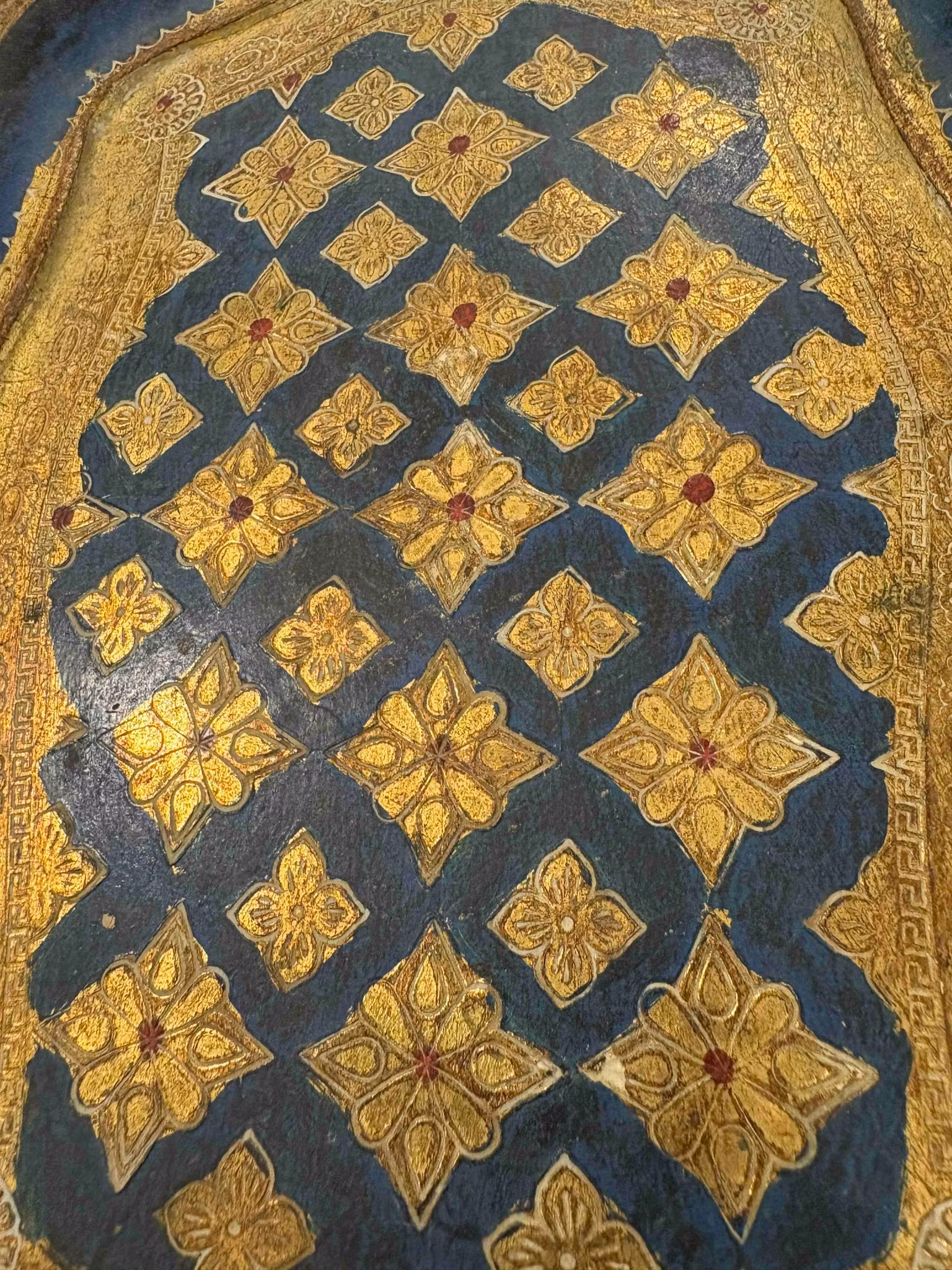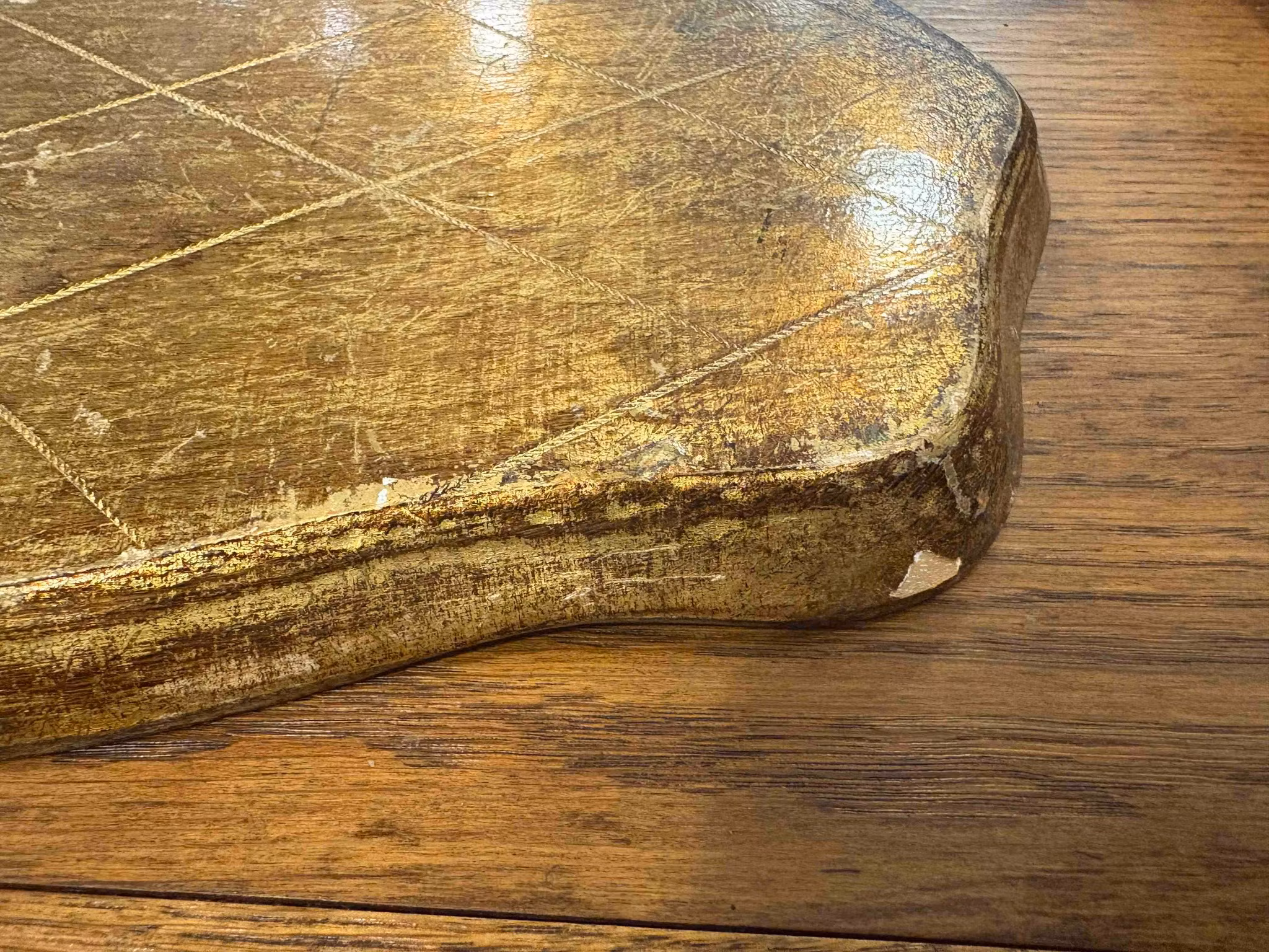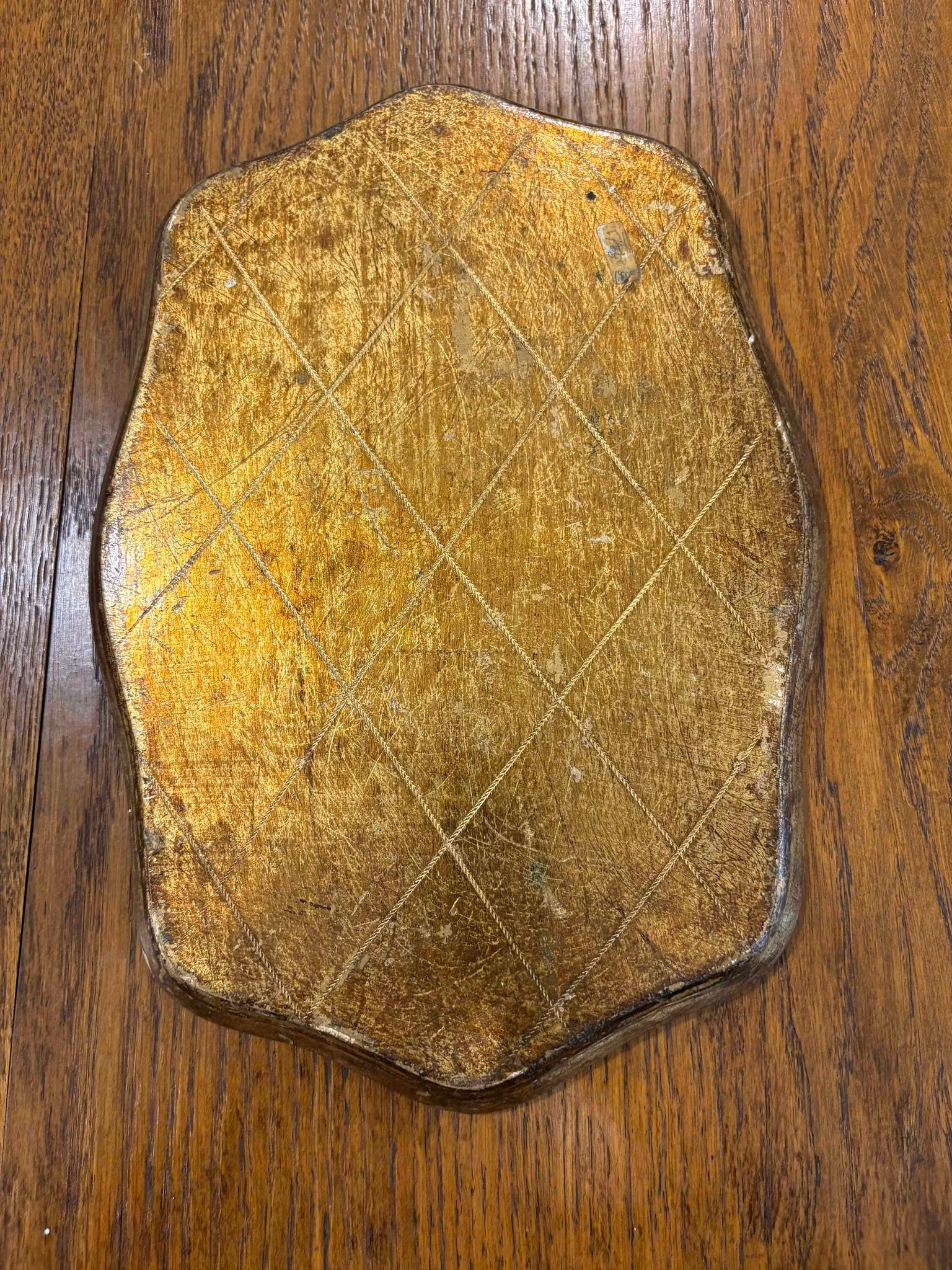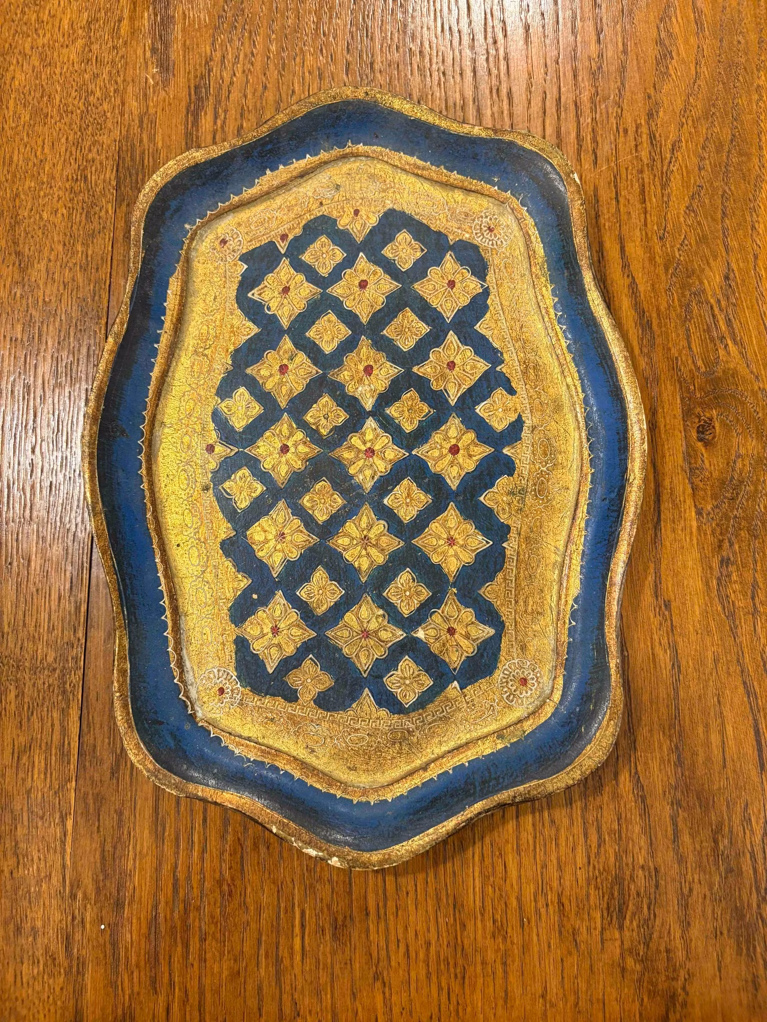 En charmig italiensk träbricka med vacker blå färgsättning och dekorativa detaljer.