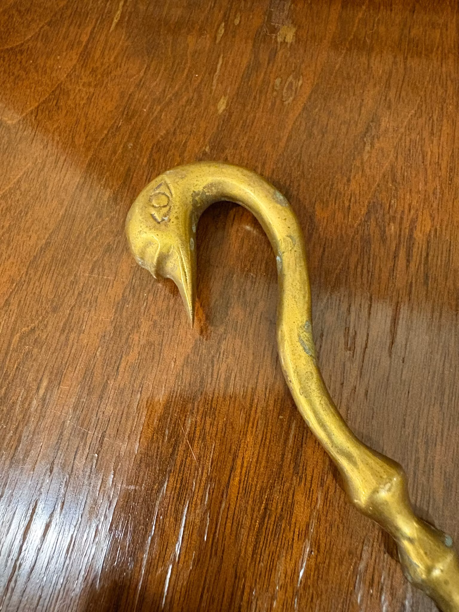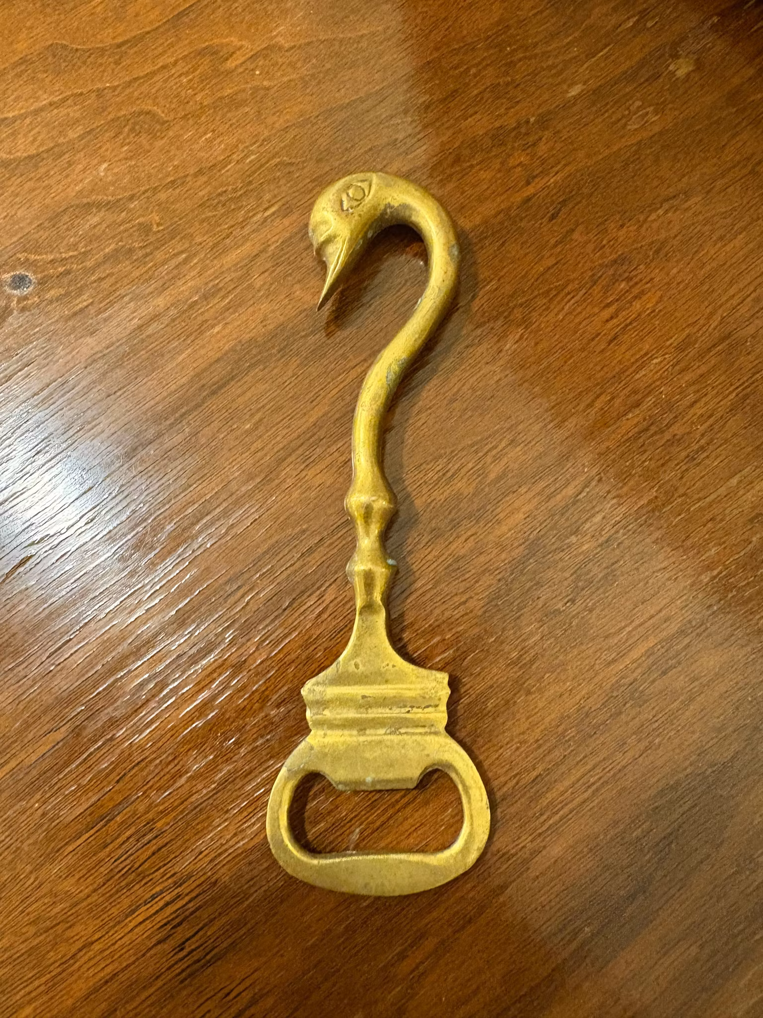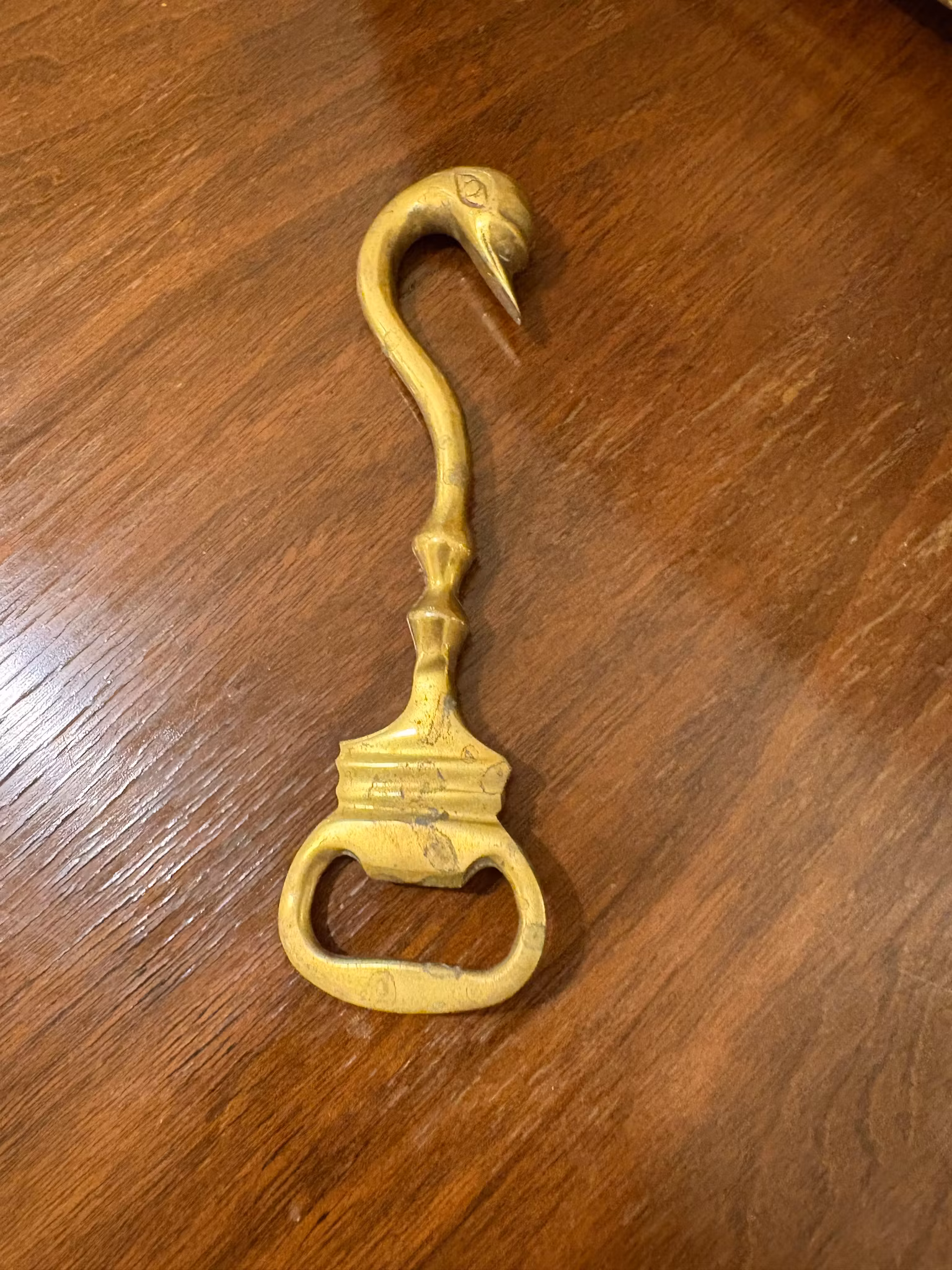Svanformad öppnare i mässing i bruksskick. Praktisk och dekorativ detalj till köket eller baren – charmig vintageaccessoar med tidlös elegans.