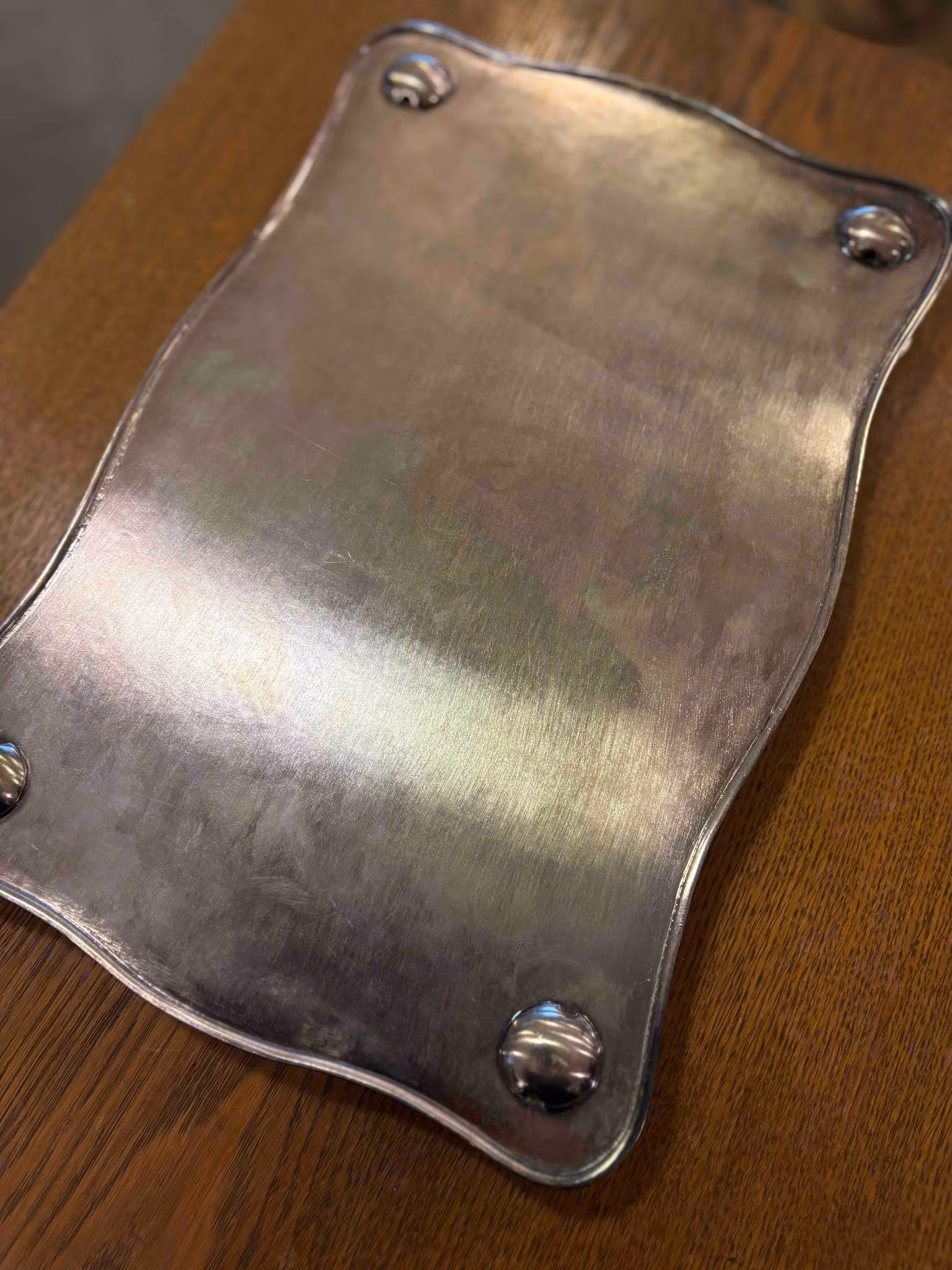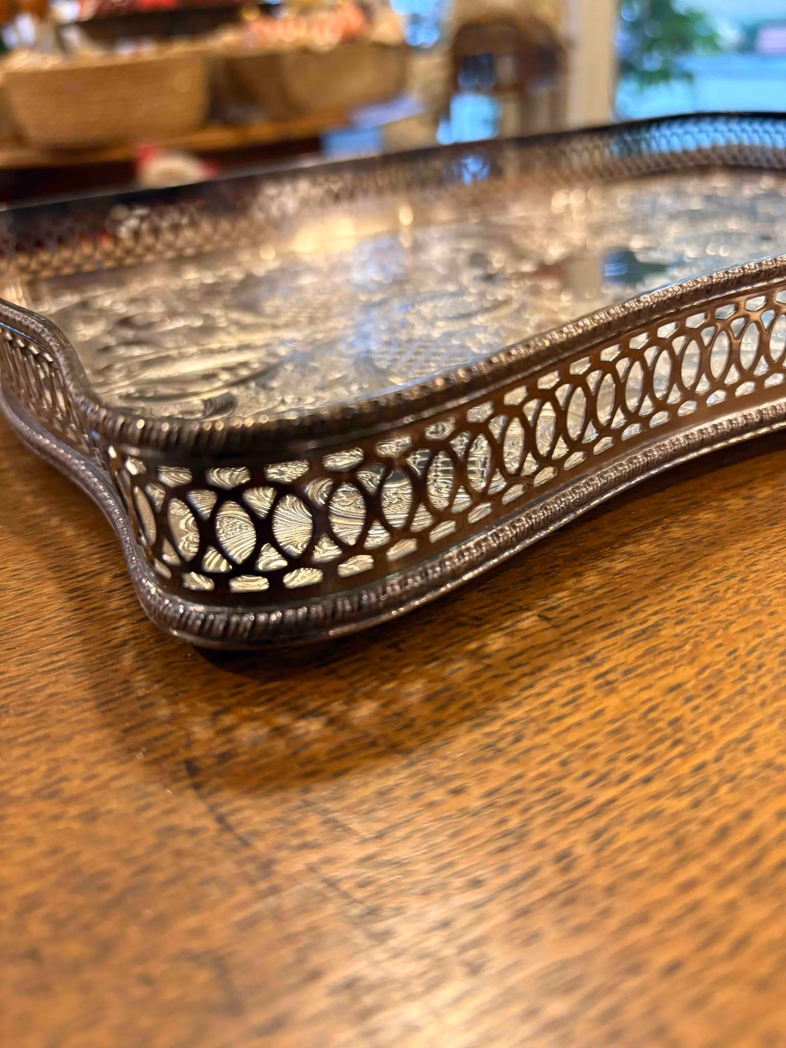 En elegant silverpläterad bricka från England, stående på små dekorativa fötter som ger den en lyft och ett mjukt skimmer. Formen är klassisk och tidlös, med en yta som fångar ljuset på ett sätt som gör varje dukning lite mer speciell. Perfekt för servering, som bas till stilleben eller som en ståtlig detalj på byrå eller sidobord.