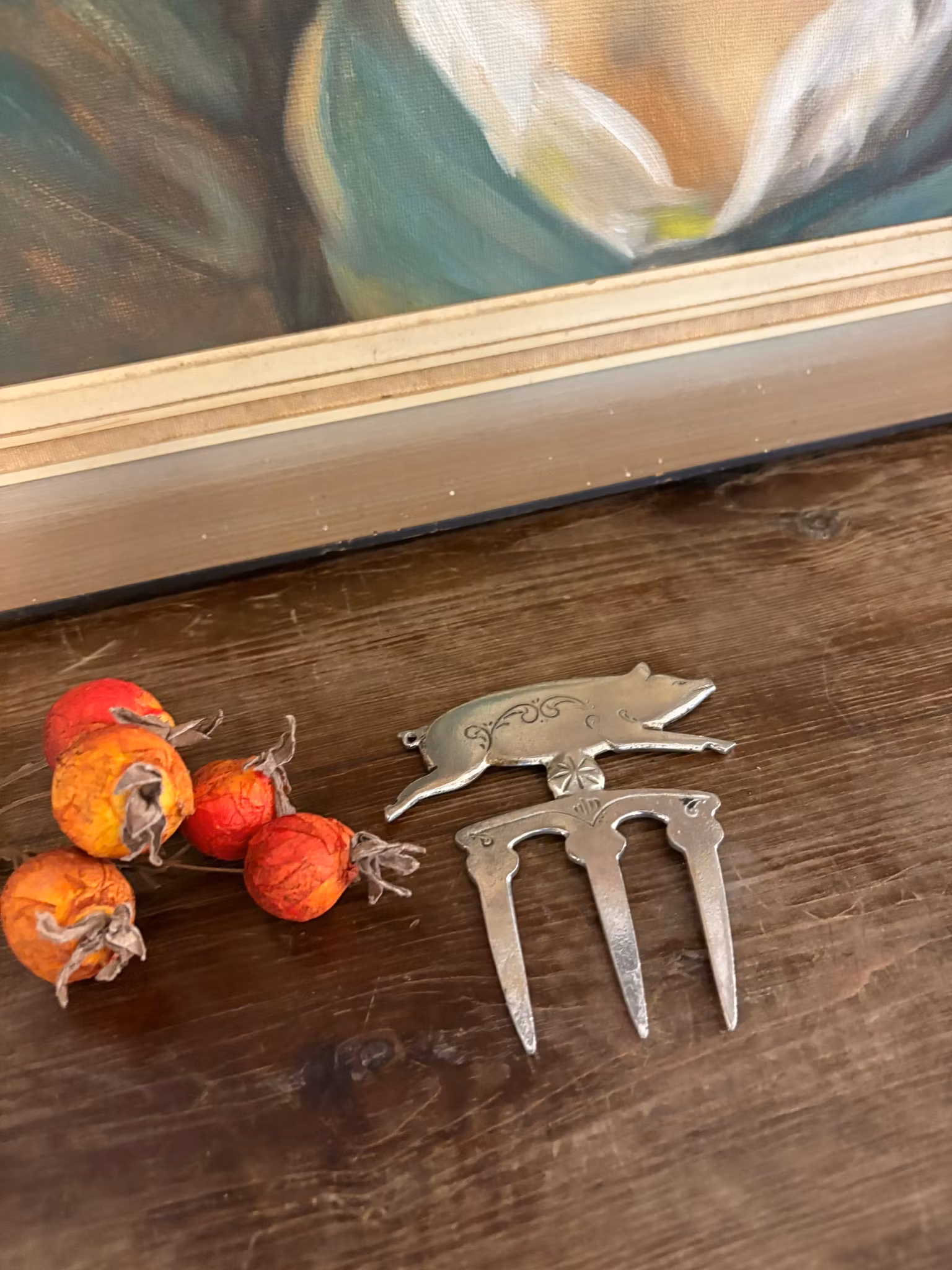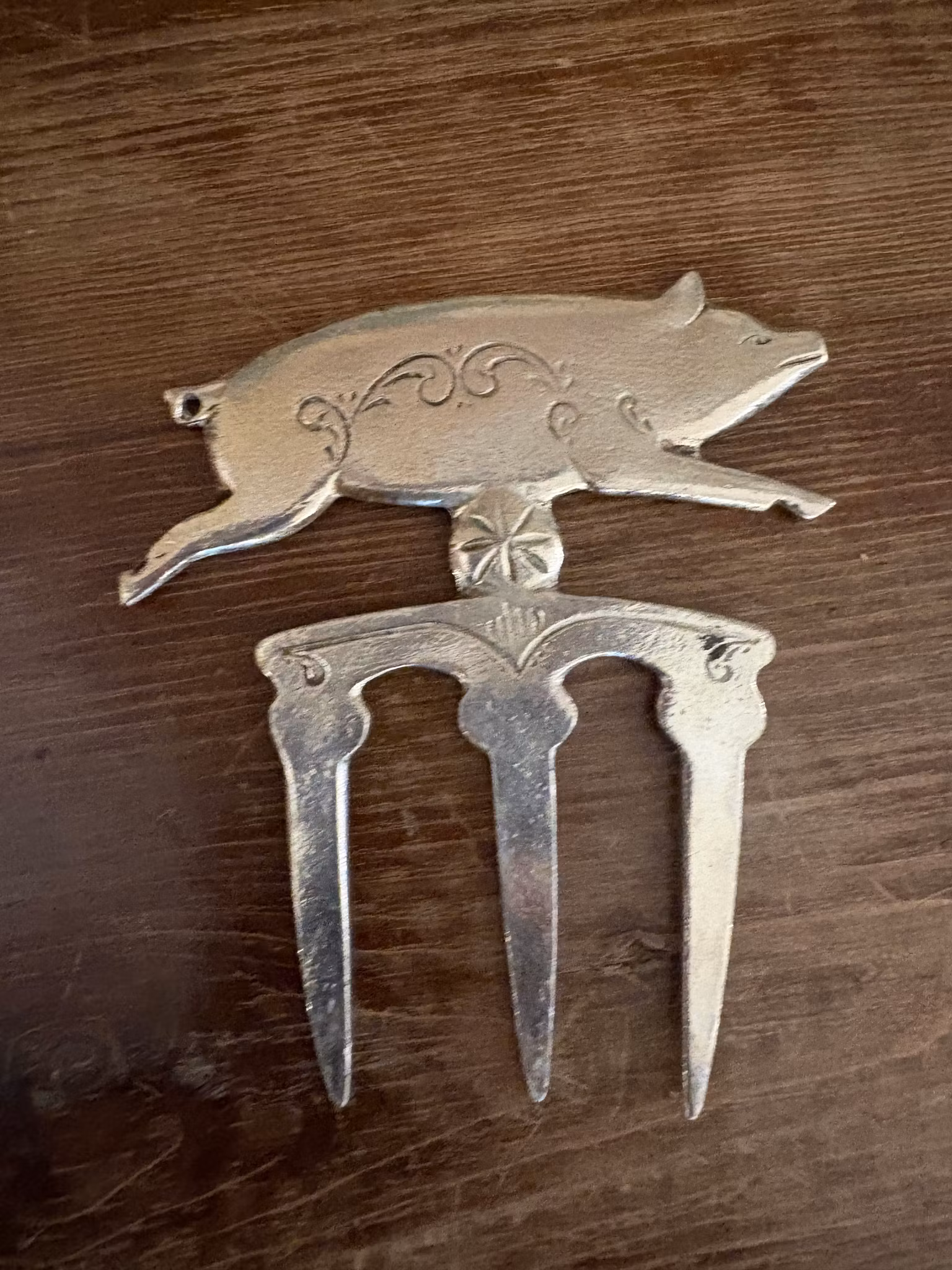 En vacker skinkgaffel i tenn med tidlös design, perfekt som detalj på julbordet eller till samlingen av vintagebestick.