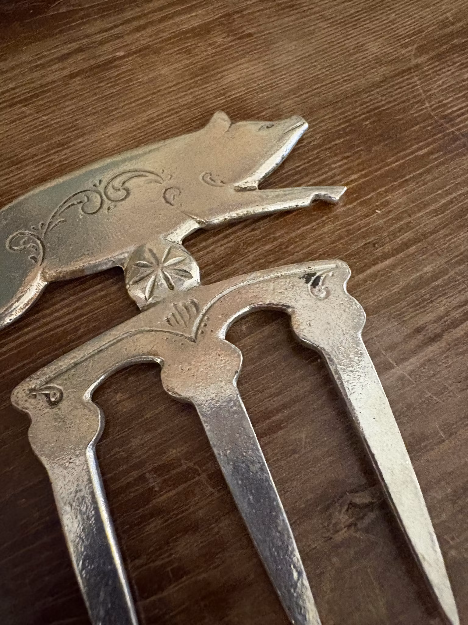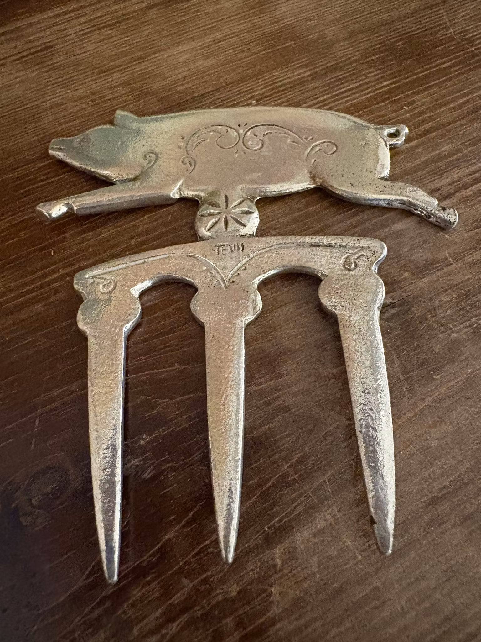 Vacker skinkgaffel i tenn med tidlös design. Fint bruksskick – charmig detalj för julbordet eller som samlarobjekt.