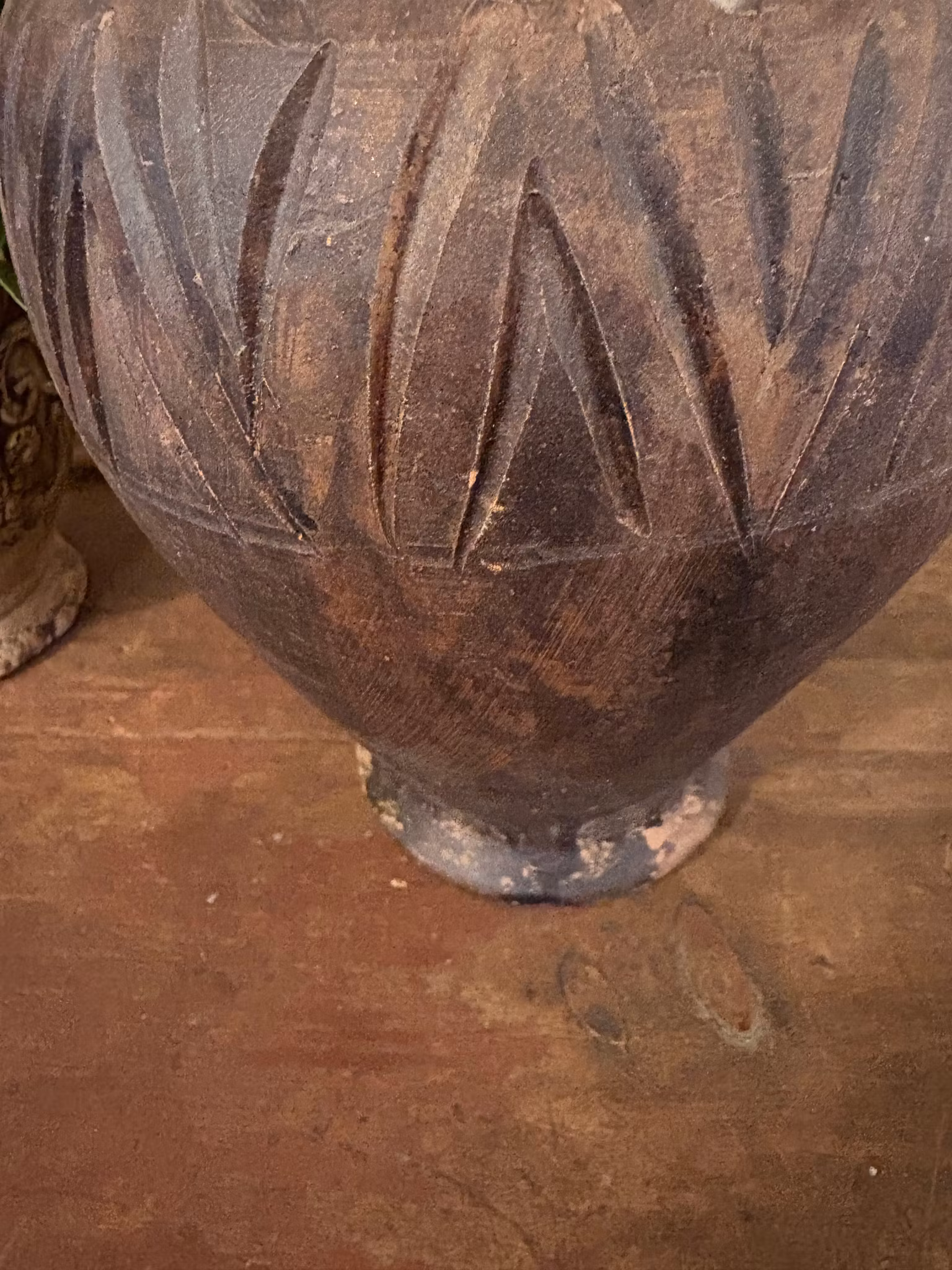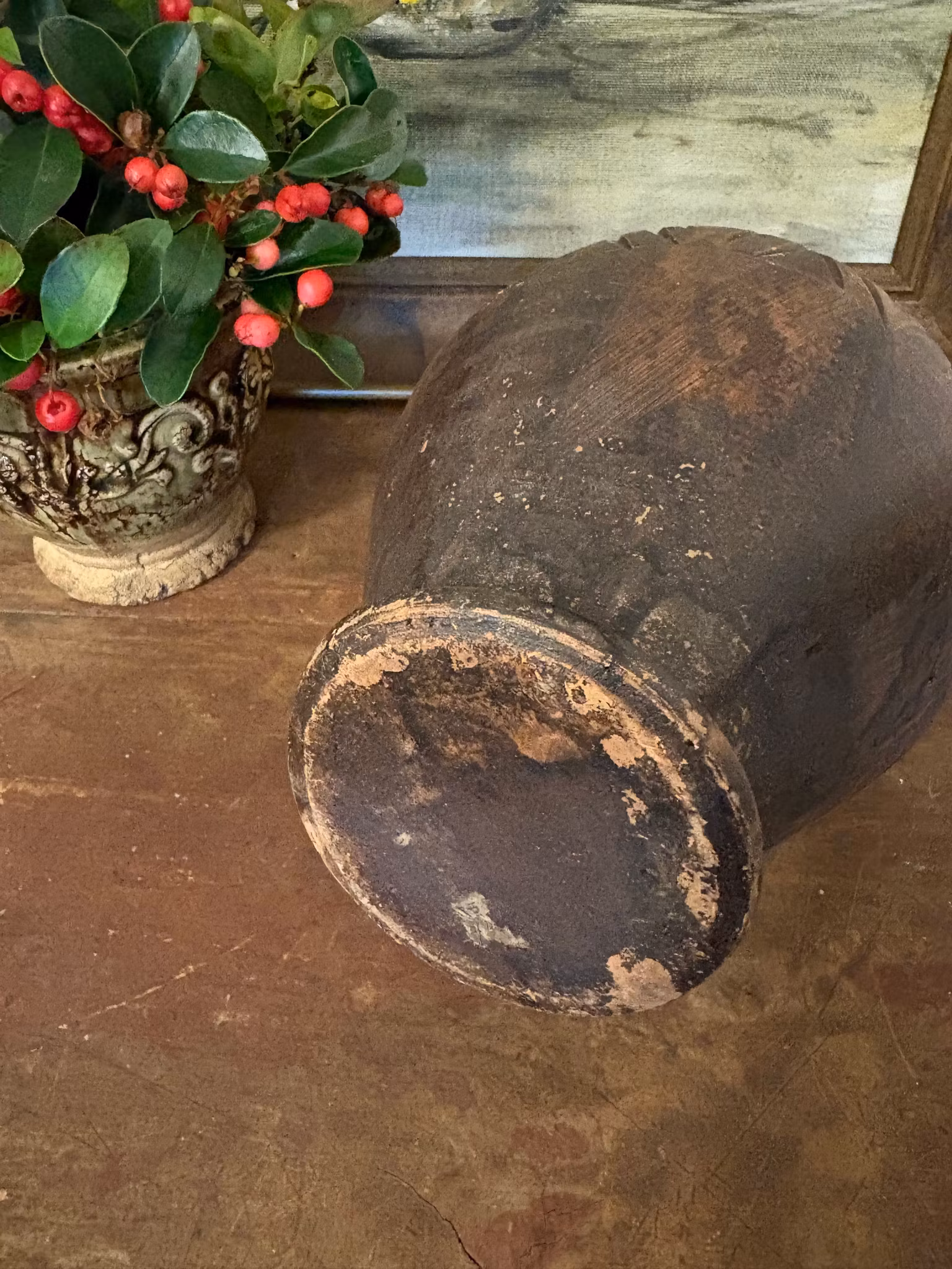 En vacker urna i terrakotta som bär på en rustik charm och hantverkskänsla. Ytan är troligtvis handmålad för att efterlikna trä, vilket ger den en mjuk, levande struktur och en naturlig ton som passar lika fint på ett sideboard som i ett stilleben.