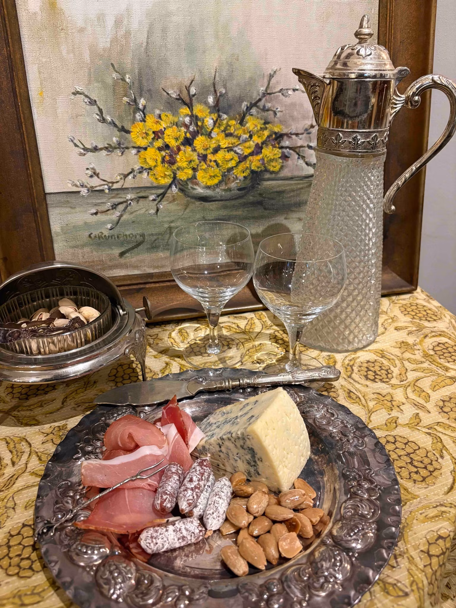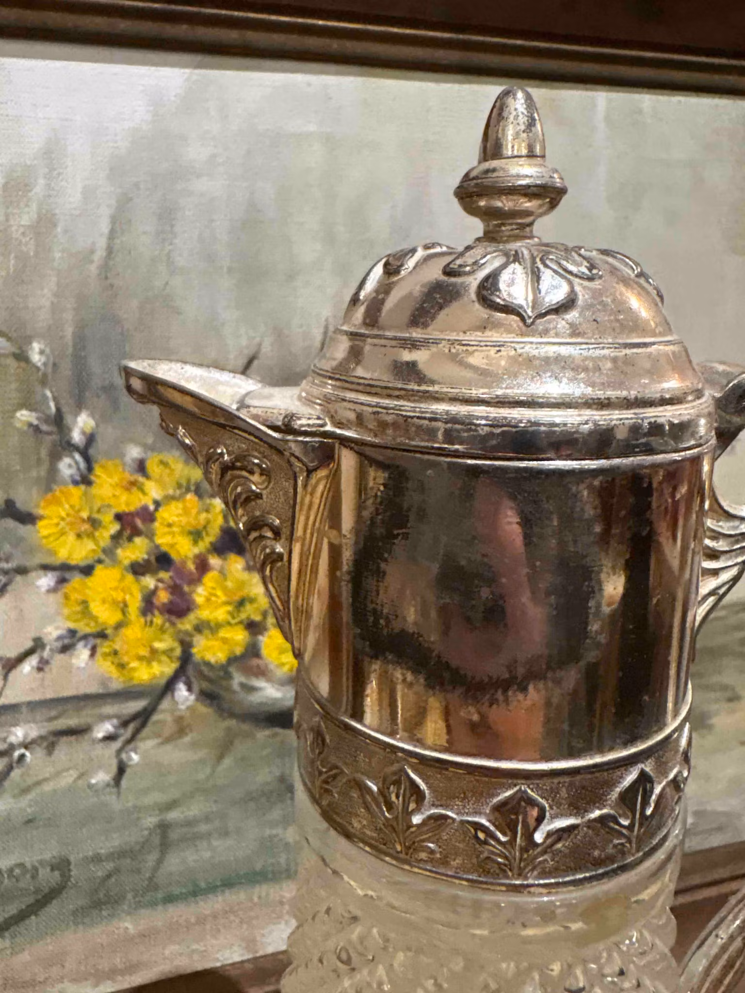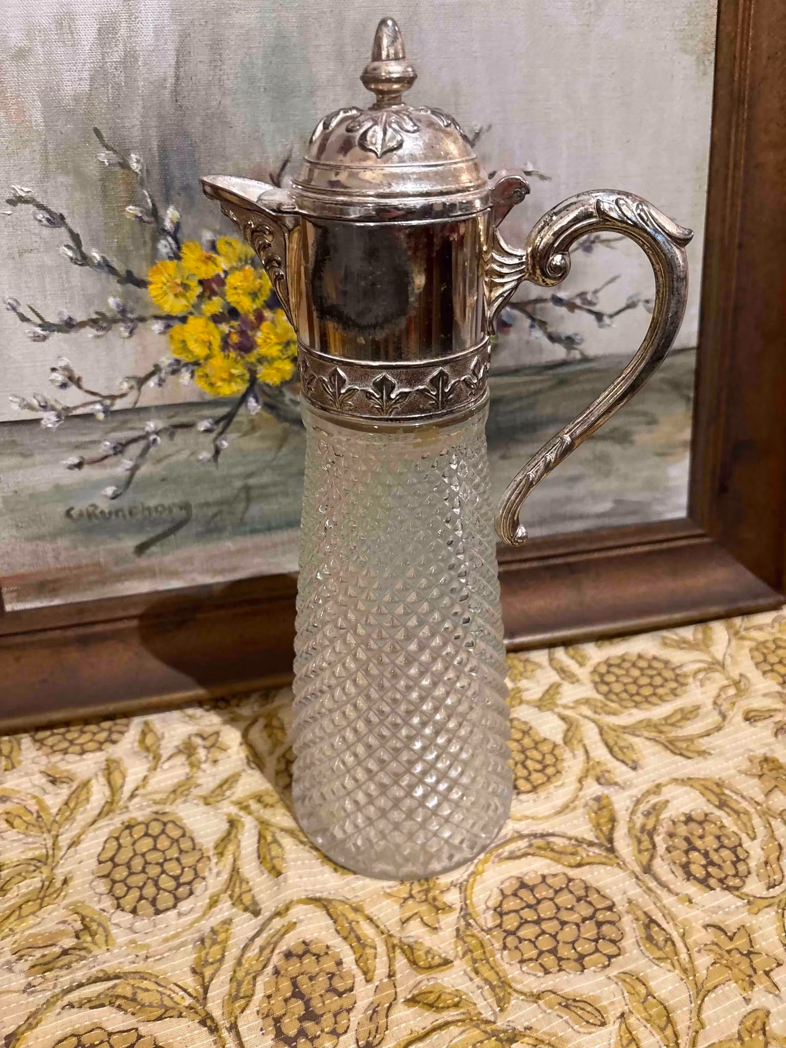 En vacker vinkanna i glas och vitmetall, som kombinerar funktion och charm på ett tidlöst sätt. Bruksskicket ger kannan karaktär och berättar om tidigare användning, vilket gör den både personlig och dekorativ.