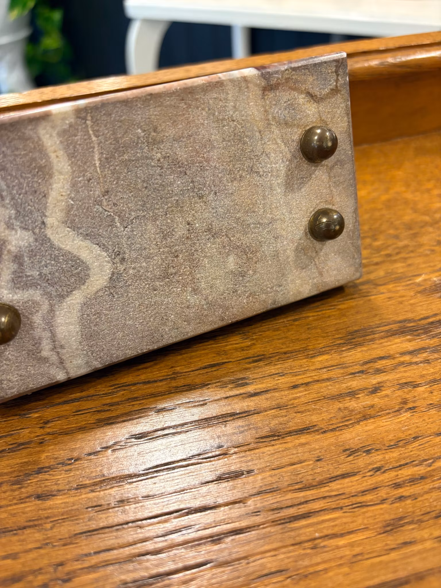 Den kombinerar det svala metallet med den naturliga känslan från stenen och blir en vacker detalj på skrivbordet eller i hallen för brev och anteckningar.