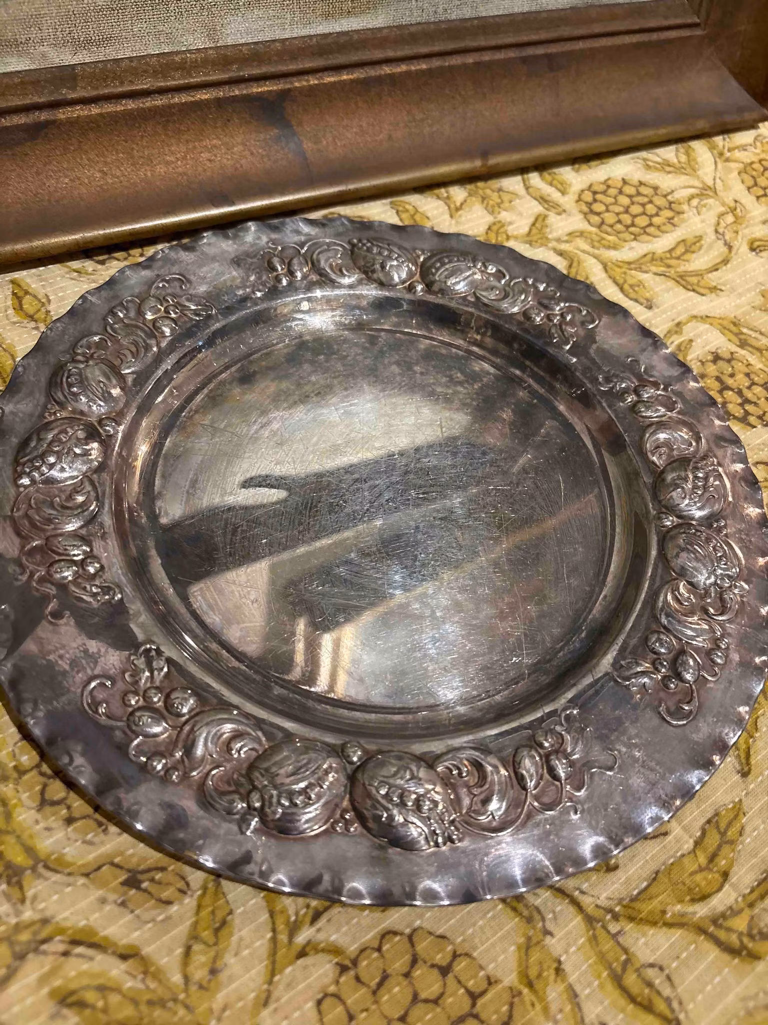 Ett vackert fat i nysilver med fina, utsmyckade detaljer som ger det en härlig känsla av elegans. Ytan bär spår av tidigare användning, det där typiska bruksskicket som ger föremålet liv och personlighet.