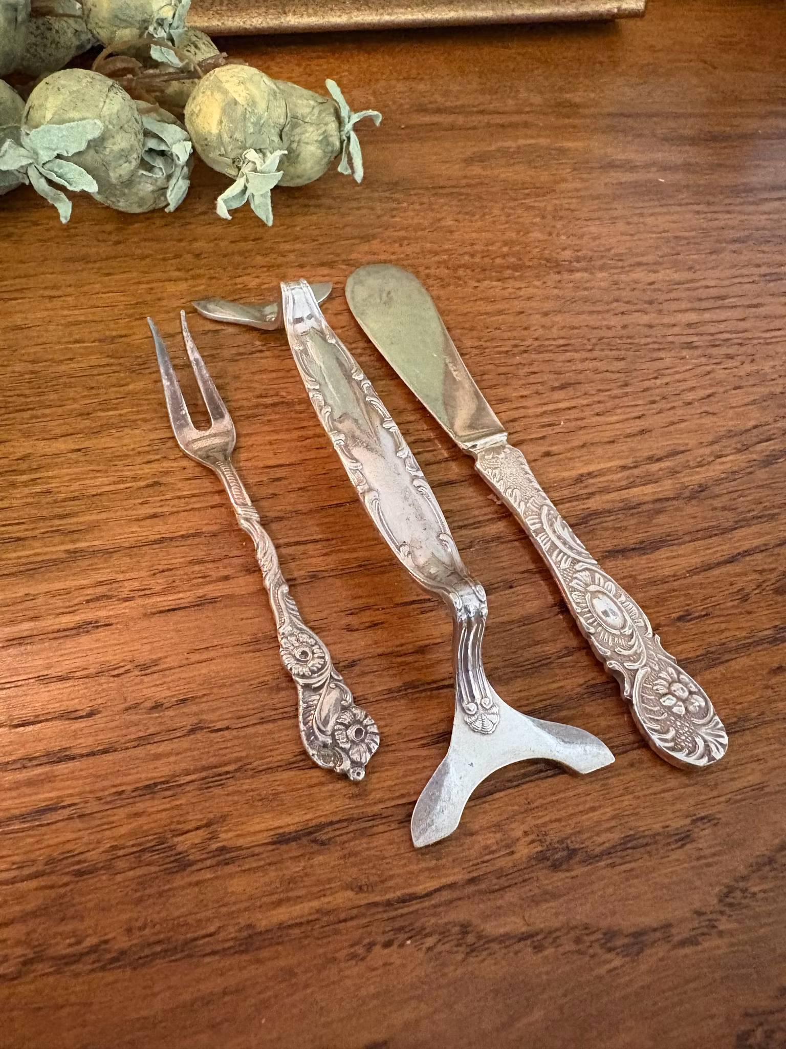 Ett charmigt litet set som förenar funktion med nostalgi. Här samsas en smörkniv och plockgaffel från Nils Johan med ett vackert mönstrat knivställ (ej från samma tillverkare) som ramar in dem på ett fint sätt. Perfekt att ha framme på frukostbrickan eller till ostbrickan – en liten detalj som gör dukningen både personlig och inbjudande.