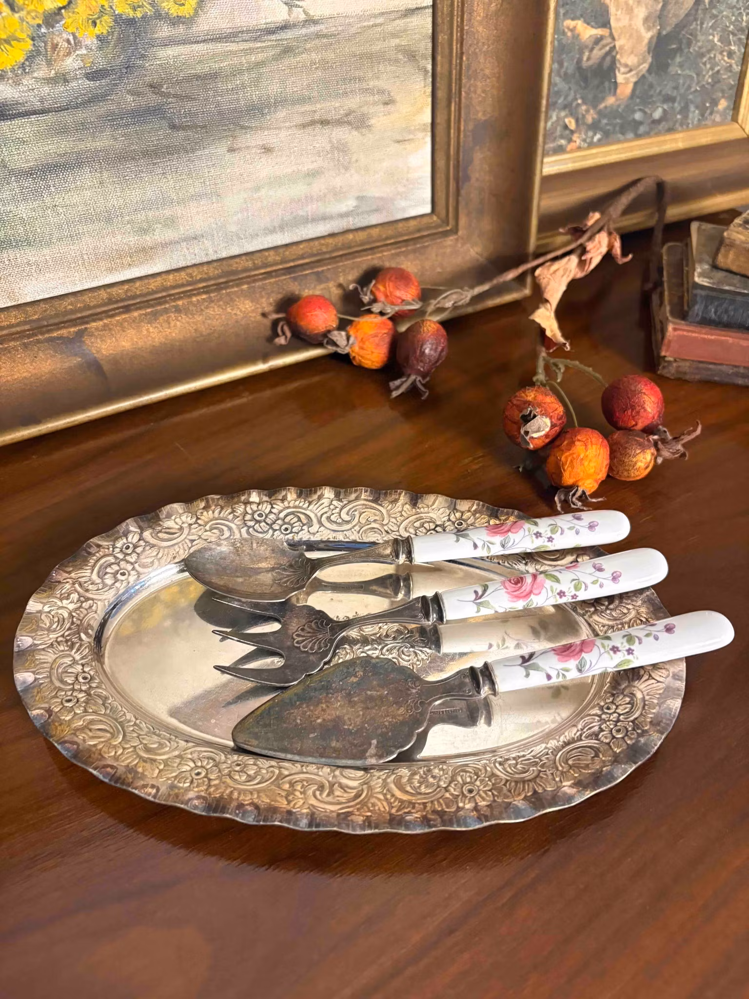 Litet uppläggningsfat i metall med vackra detaljer, ca 23x15 cm och i fint bruksskick. Perfekt för att servera ost, frukt eller chark.