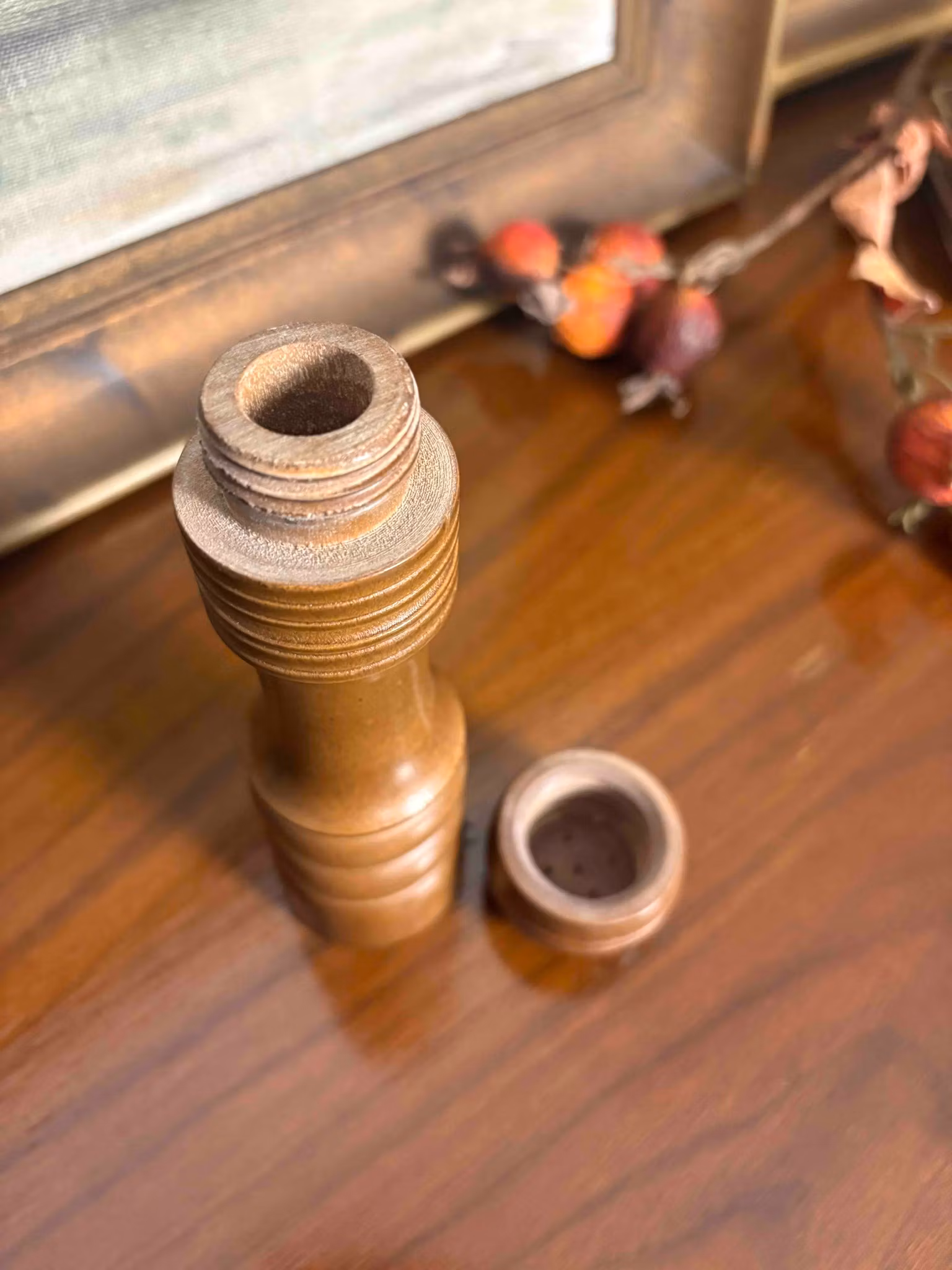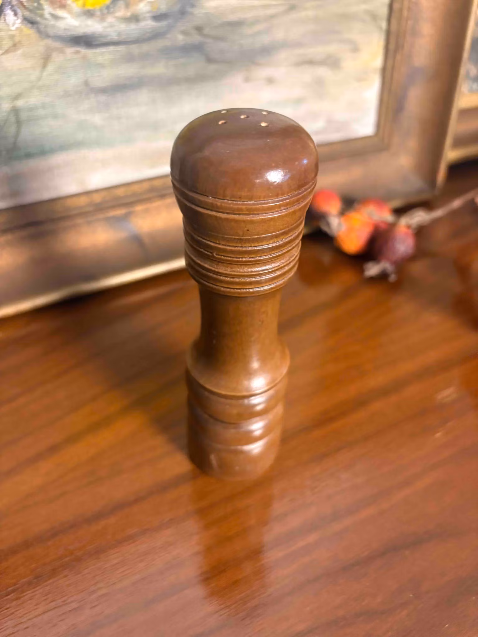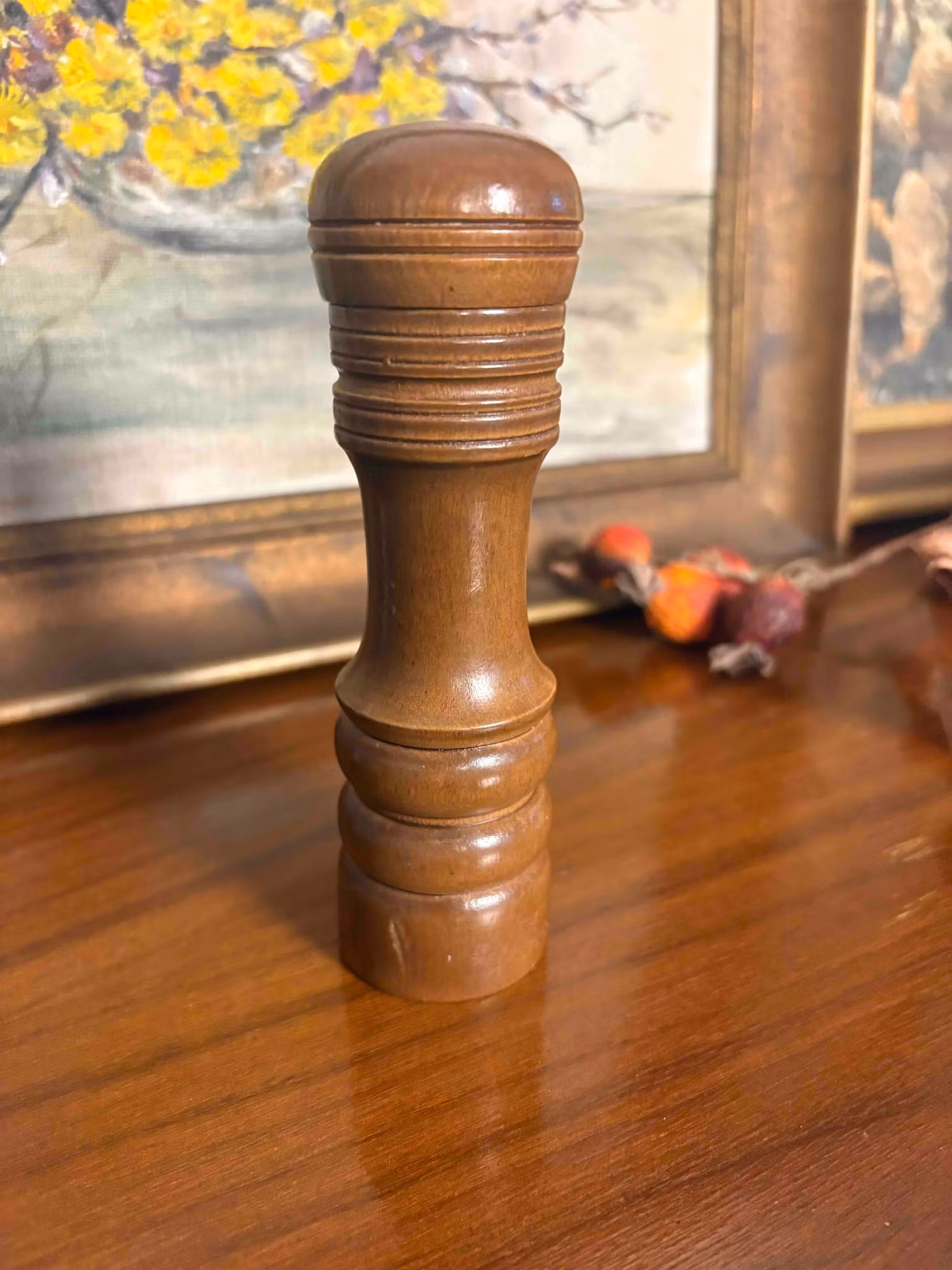 Vackert saltkar i trä, ca 15,5 cm hög och i fint bruksskick. Perfekt som praktisk och dekorativ detalj i köket eller på bordet.