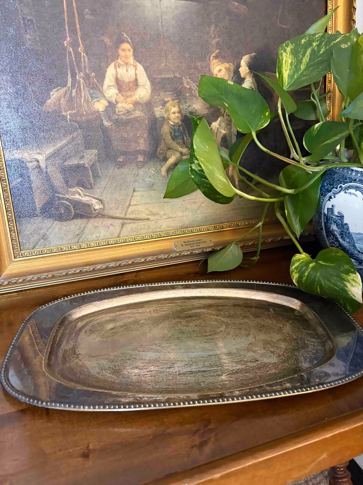 Vackert uppläggningsfat i metall med charmig patina. Perfekt för servering, dekoration eller som detalj på bordet.