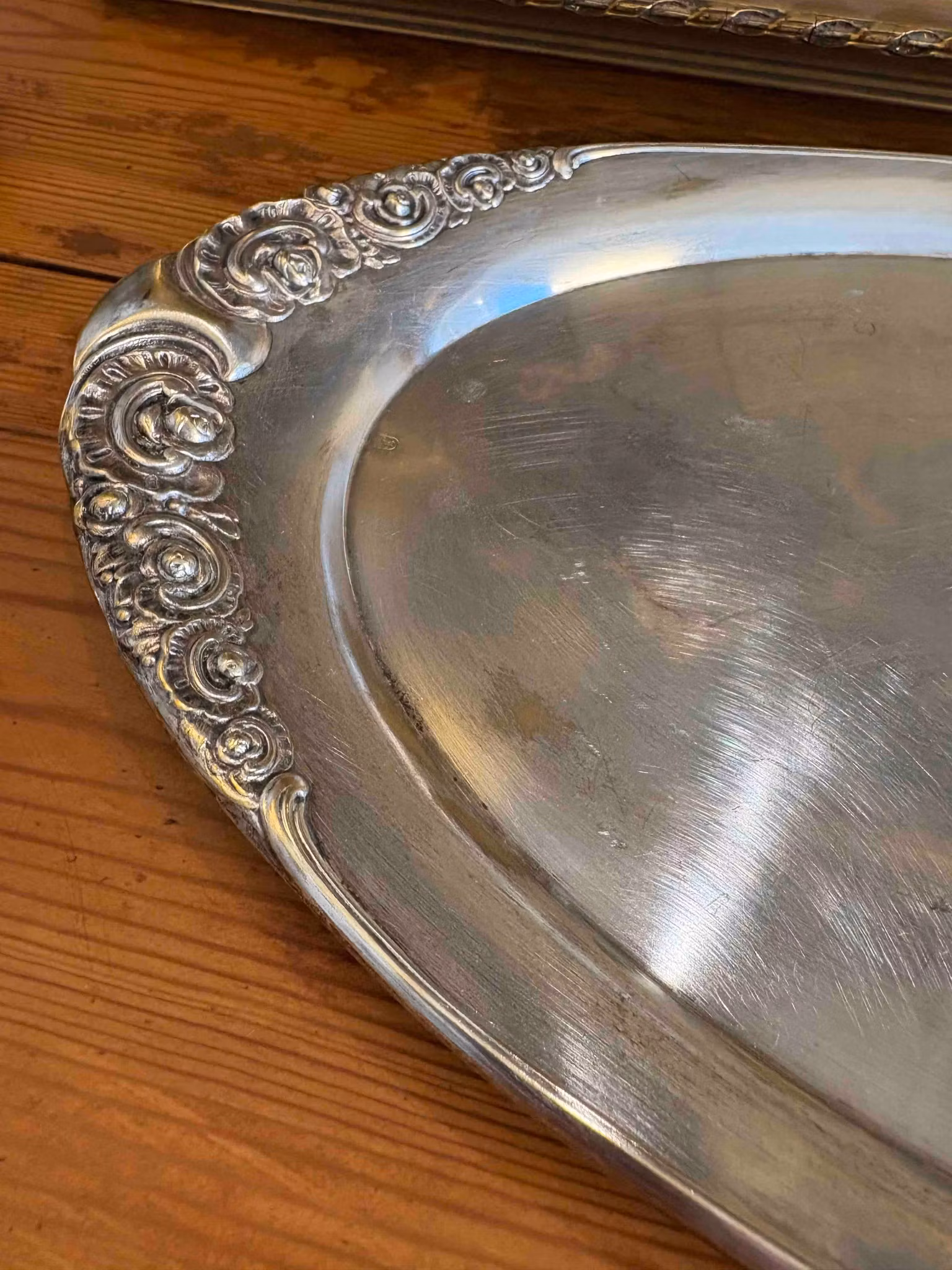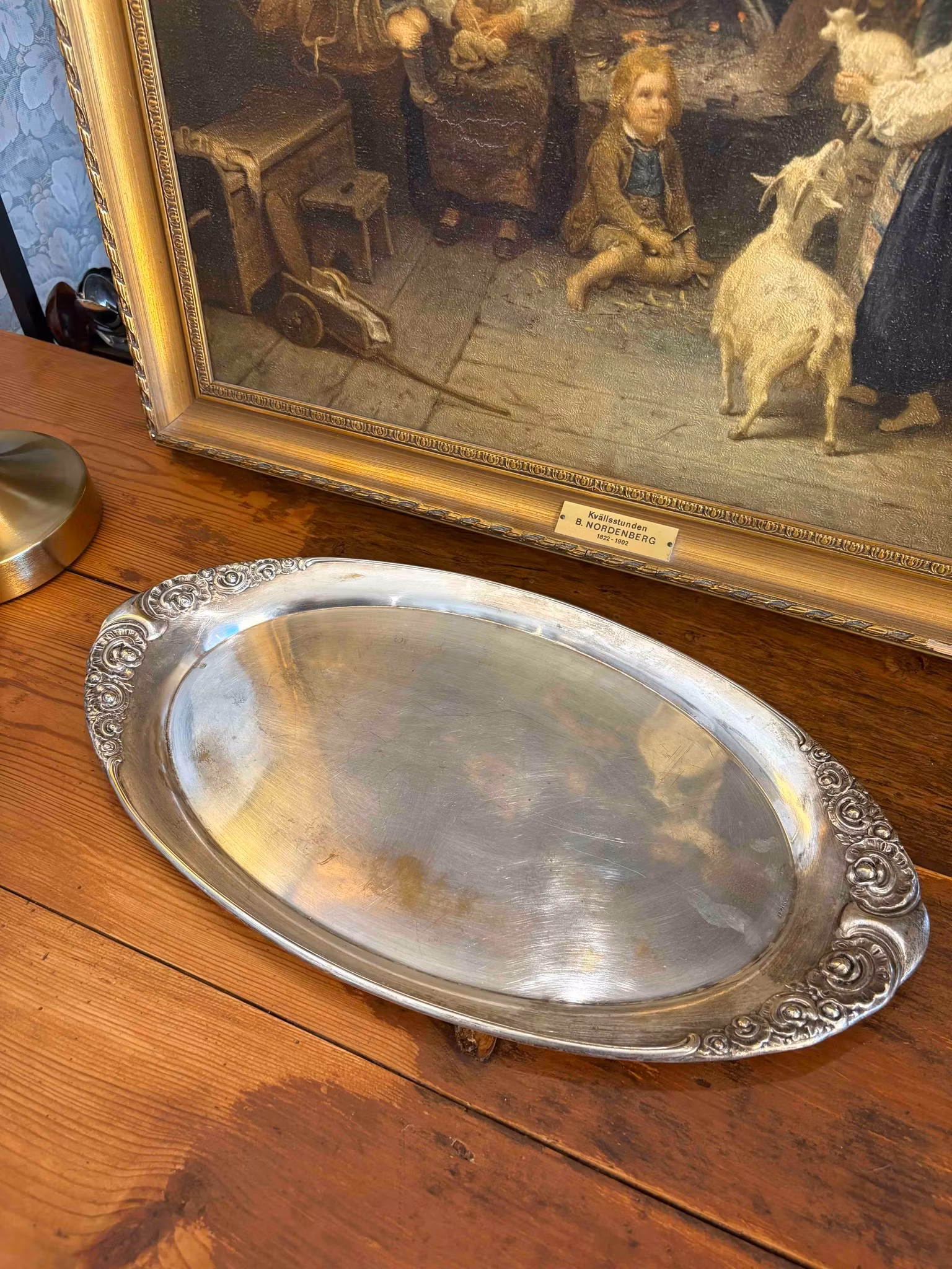 Ett uppläggningsfat i nysilver där de vackra detaljerna ramar in det som serveras. Den mjuka lystern i metallen ger liv åt dukningen och skapar en känsla av något genomtänkt och omhändertaget.