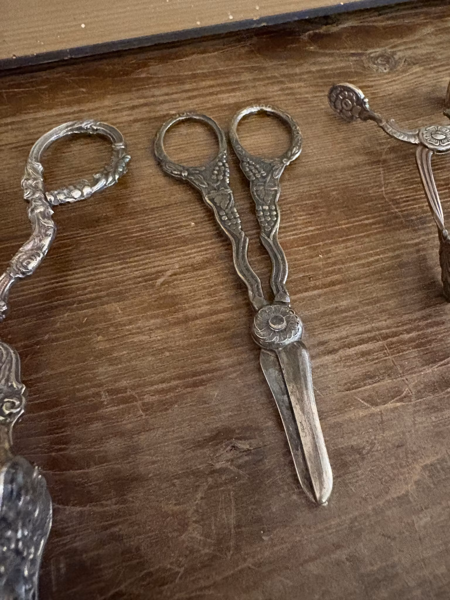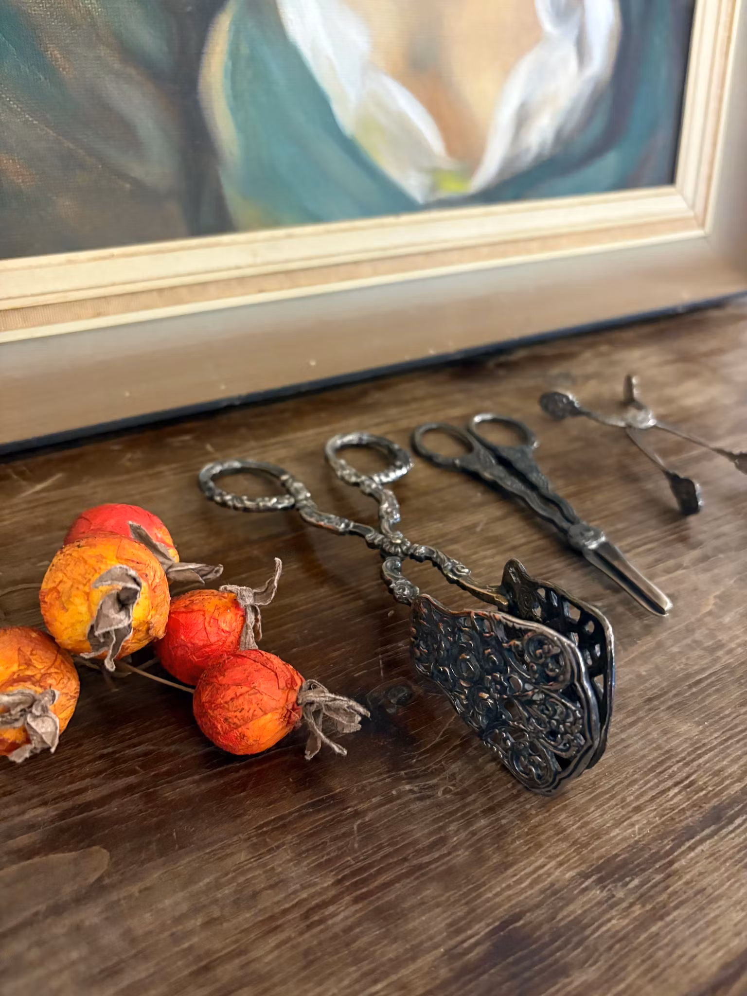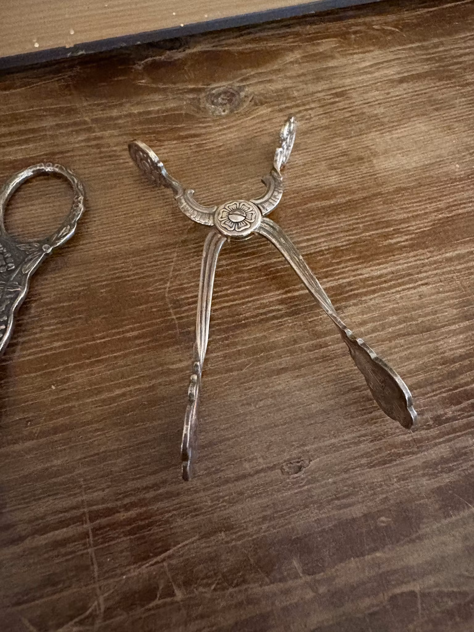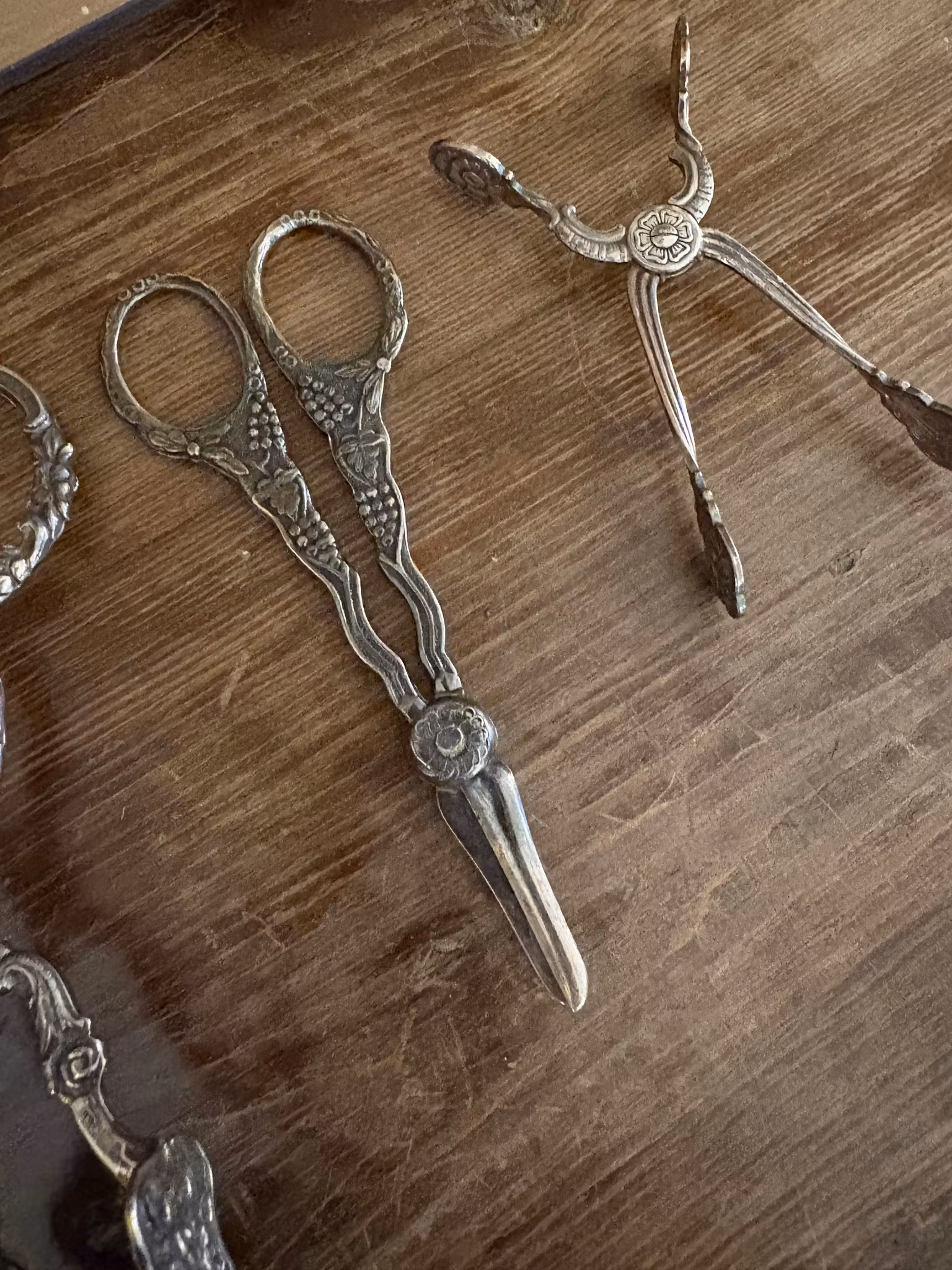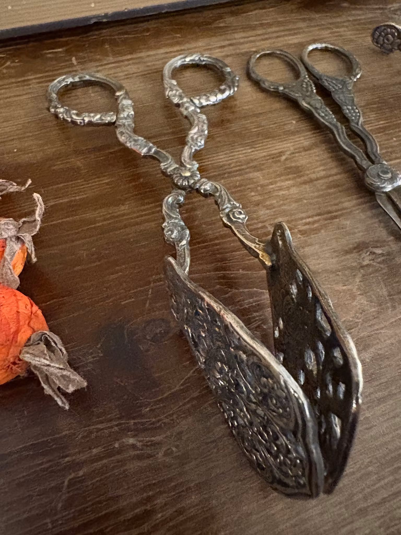 Ett charmigt vintage-set bestående av två tänger och en sax i metall, perfekt som dekorativ detalj, samlarobjekt – eller till söndagsmiddagen, julbordet eller buffén.