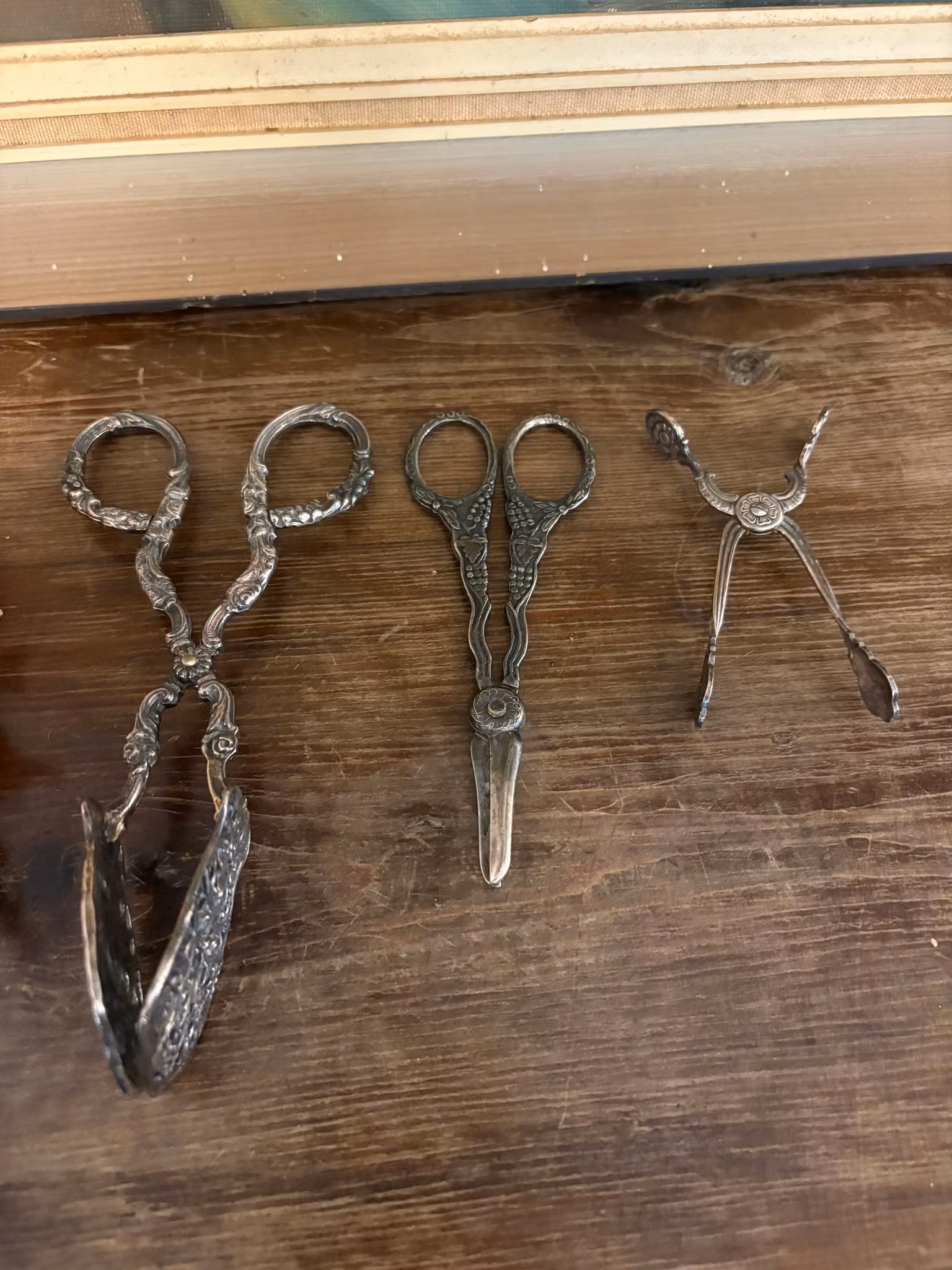 Vintage-set med två tänger och en sax i metall. Fint bruksskick – perfekt till söndagsmiddag, buffé eller som charmigt samlarobjekt.